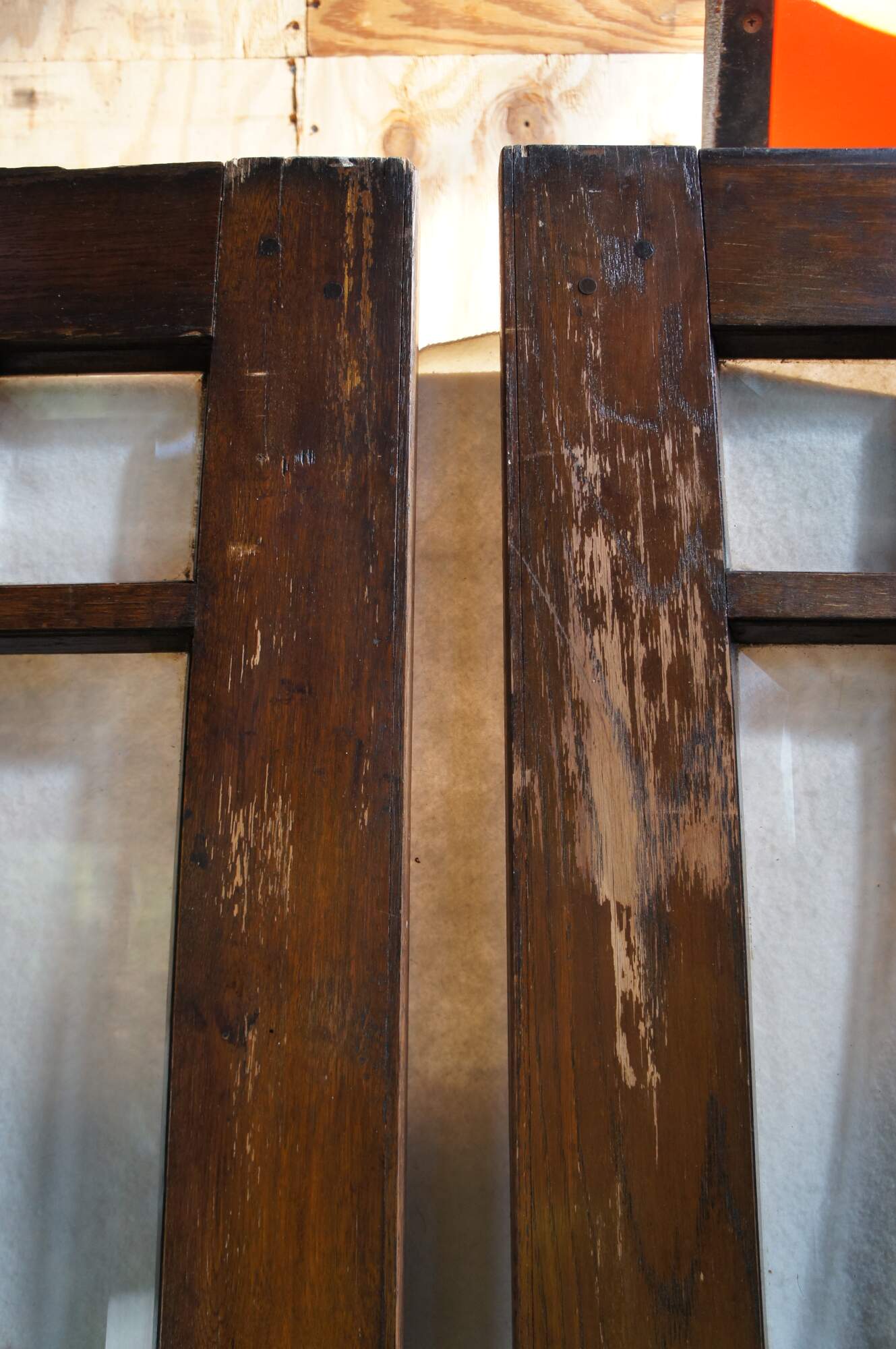 Good Condition; Age and use related wear. Finish loss, marking and scuffing. The doors used to have brass plates along the sides to push opened and closed.