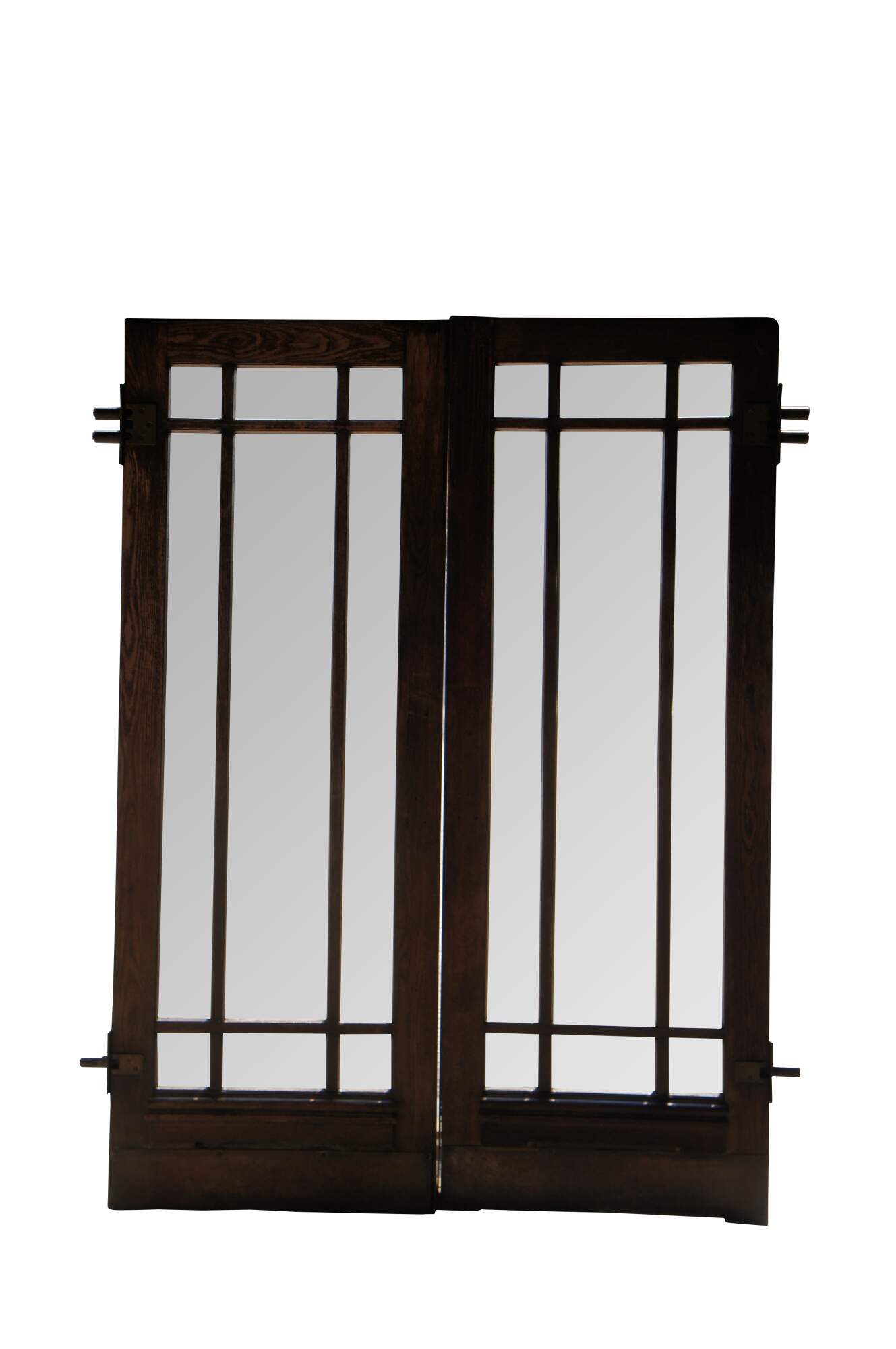 Pair of Mid Century French Saloon Swinging / Pivot Double Doors. Feature an oak frame with Prairie style lattice shaped center and beveled glass panels. The door is accented with brass mounted kickplates and Hawgood Systems Spring Hinges.