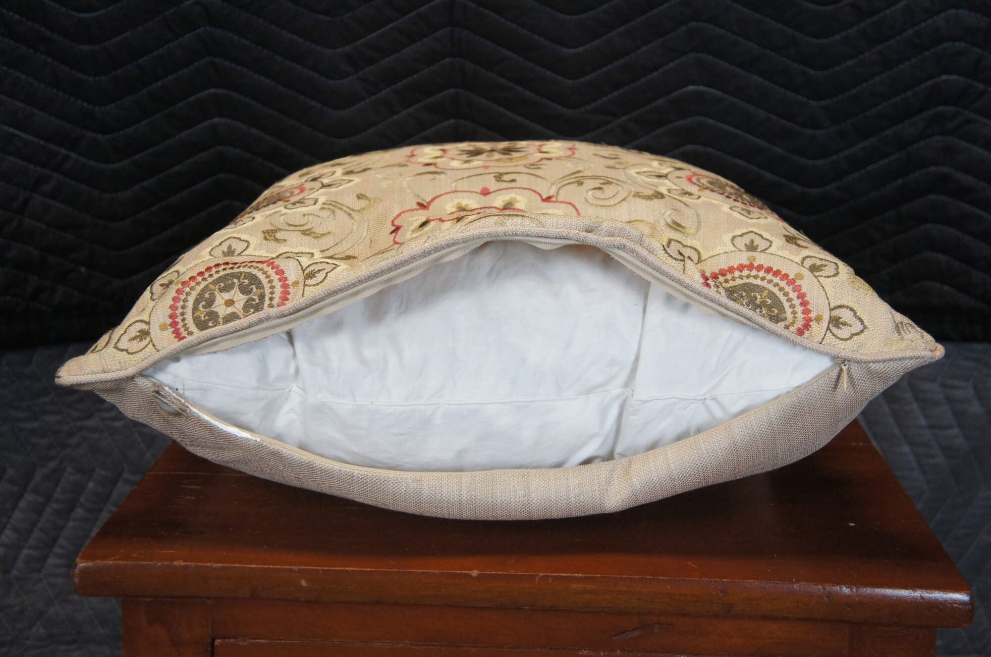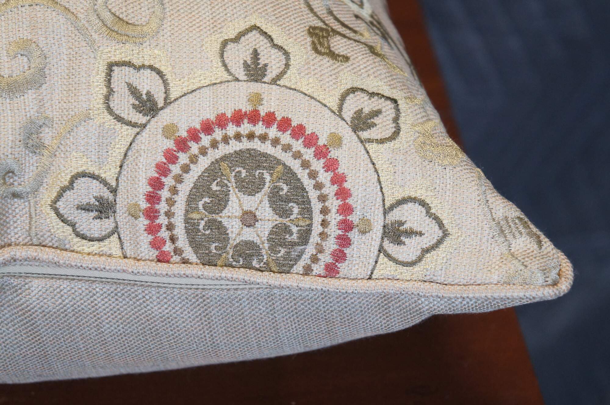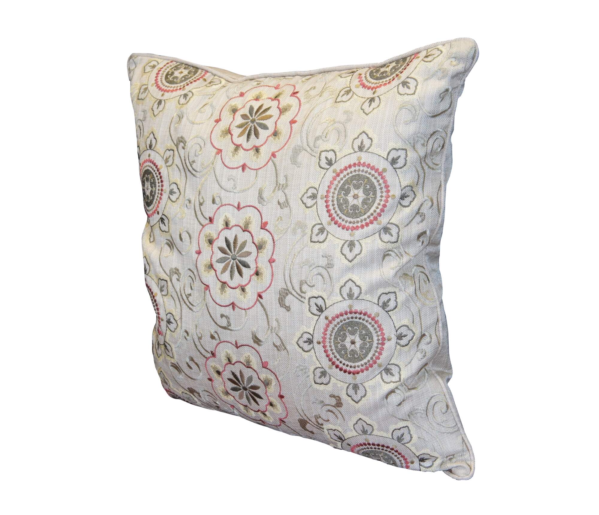 Late 20th century square down filled throw / accent pillow featuring a machine embroidered floral medallion and vine design in browns and burgundy on woven beige fabric. Zipper closure.