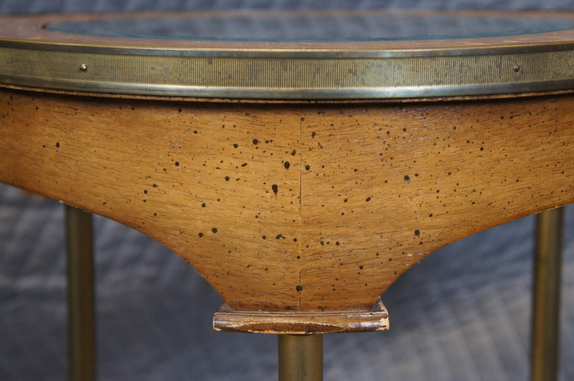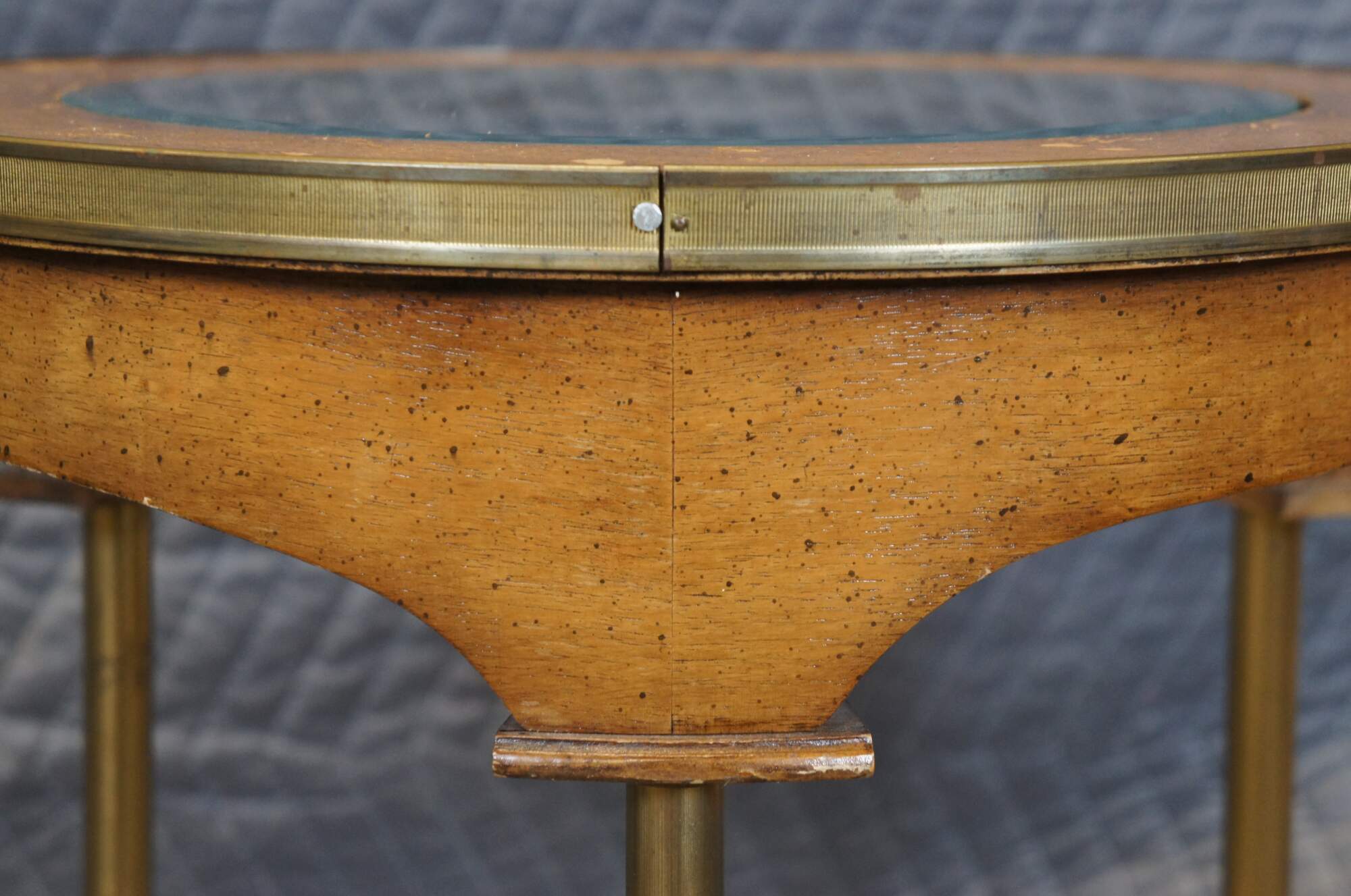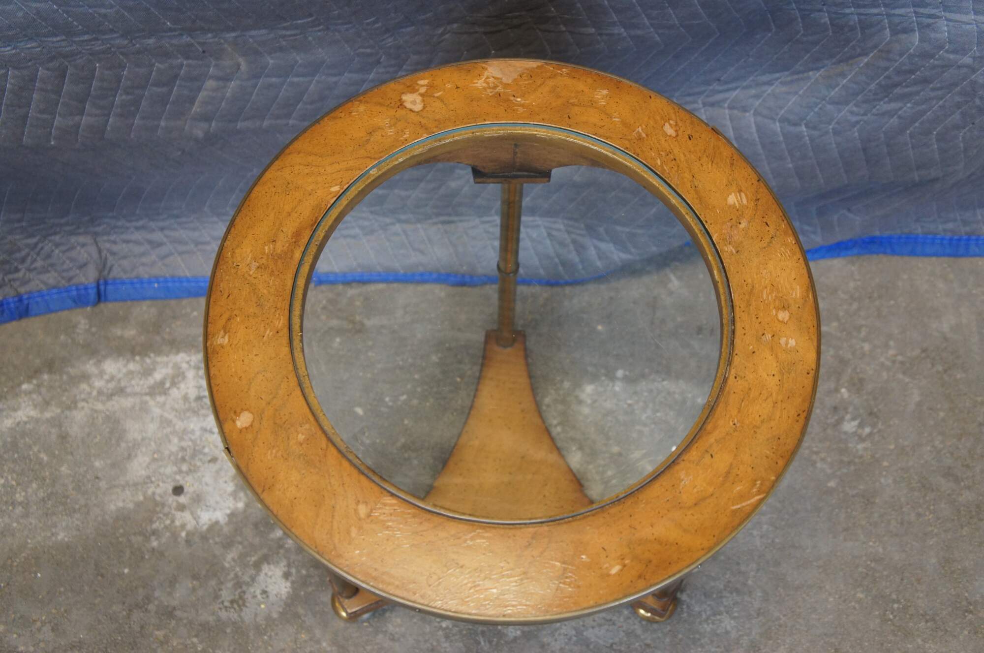 Late 20th century French Empire / Biedermeier / Somno / Bouillotte style gueridon / occasional two tier table. Round form with inset glass top and brass band around the edge, supported on three brass lags leading down to curved triangular base and brass bun feet. Attributed to Bernhard Rohne for Mastercraft.