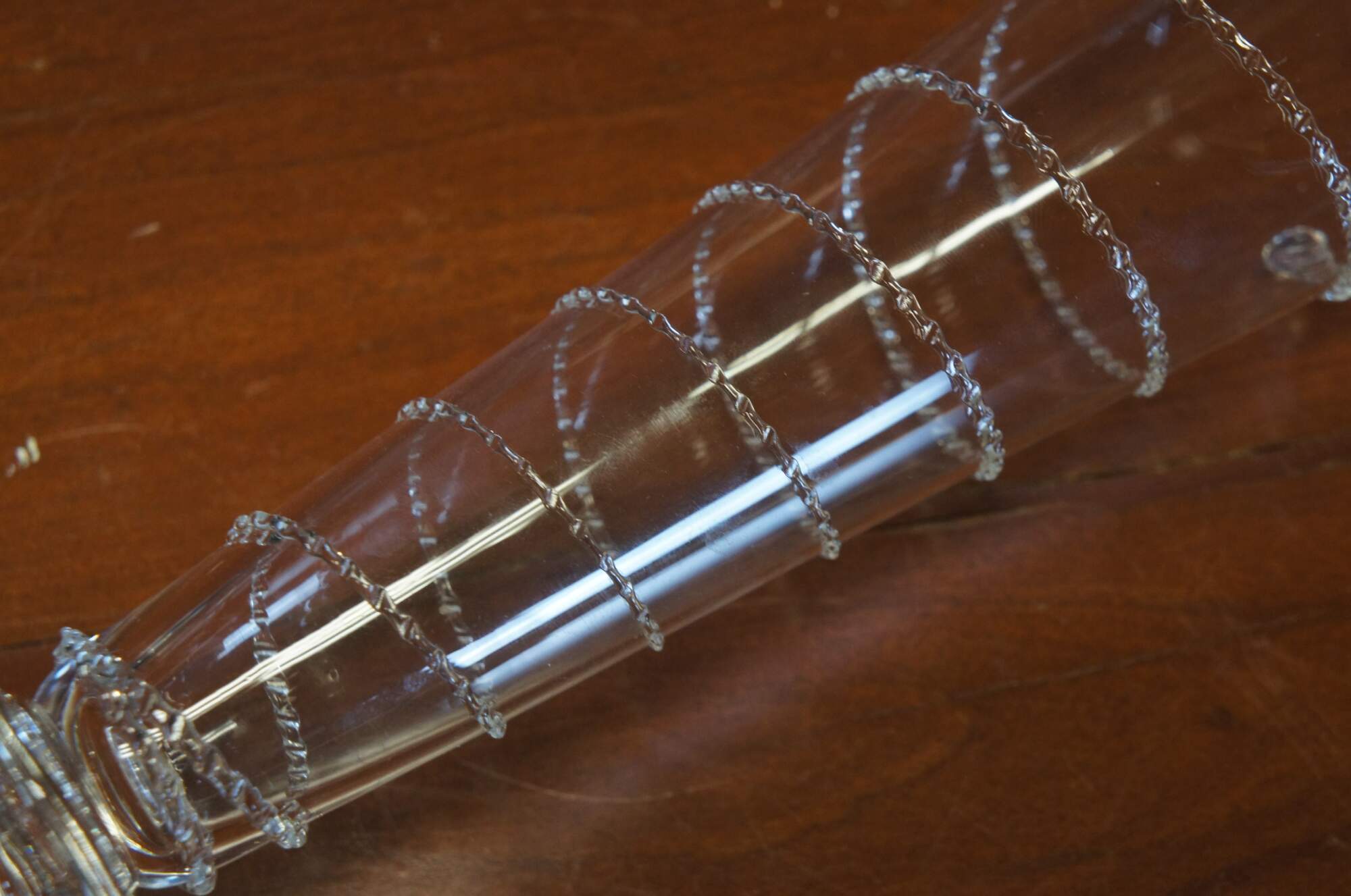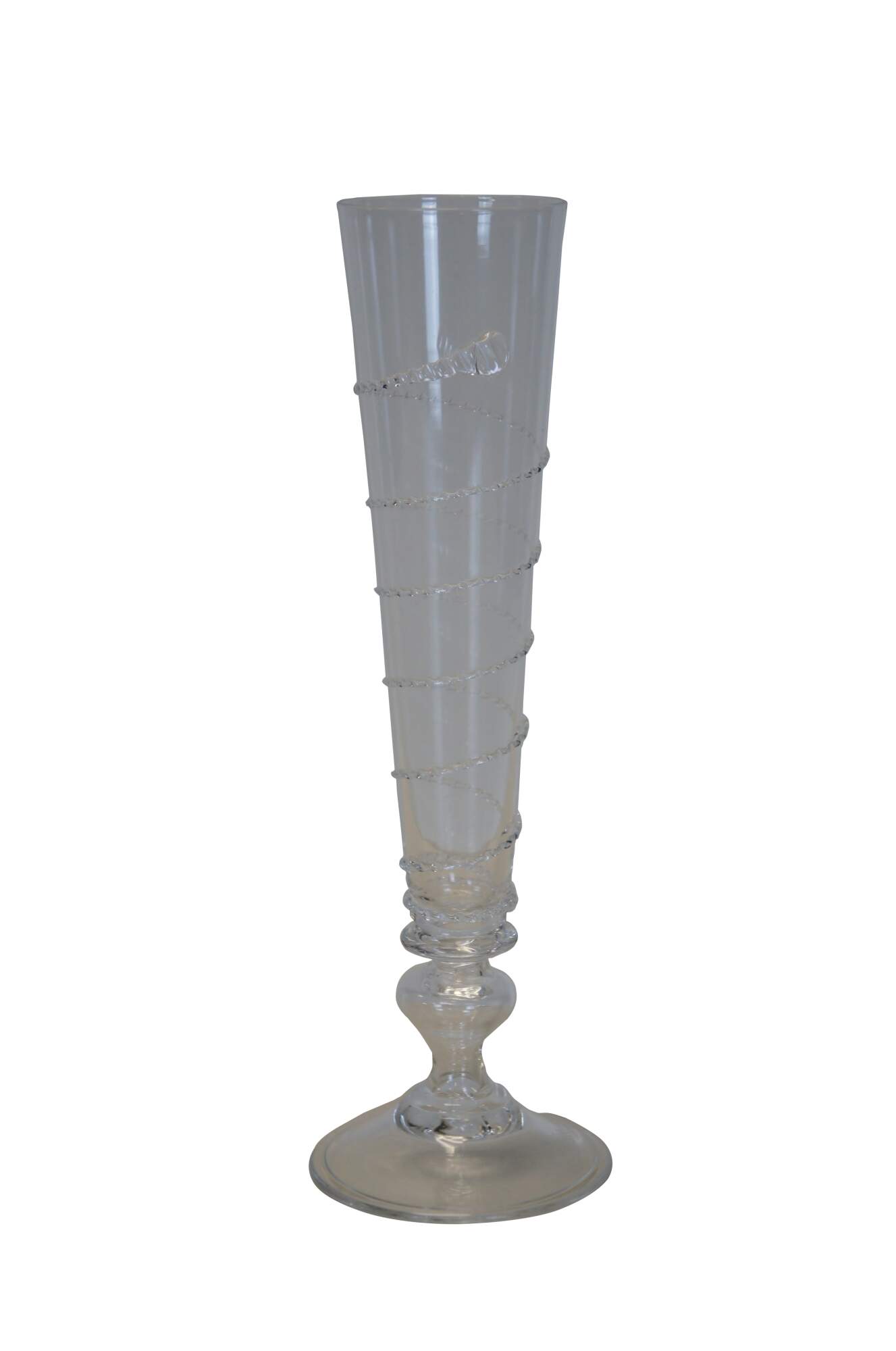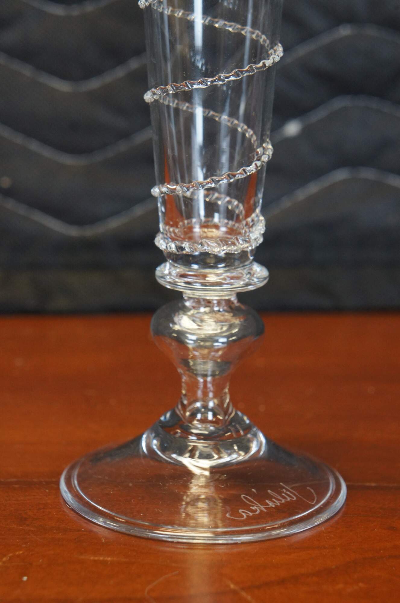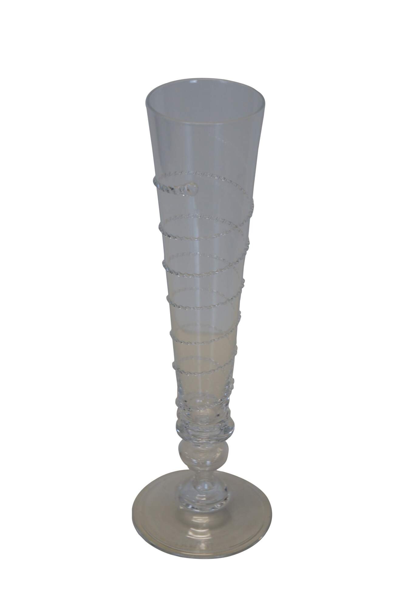 Pair of late 20th century Juliska crystal champagne toasting flutes in the Amalia pattern, featuring a decorative textured spiral and a short pedestal base. Marked on base.