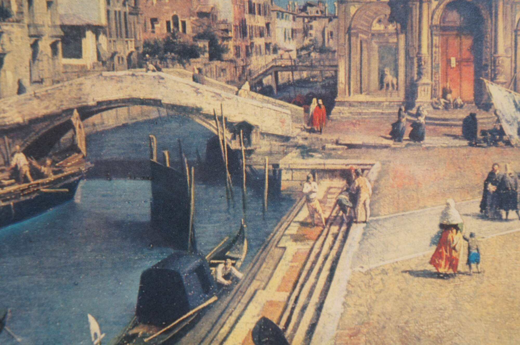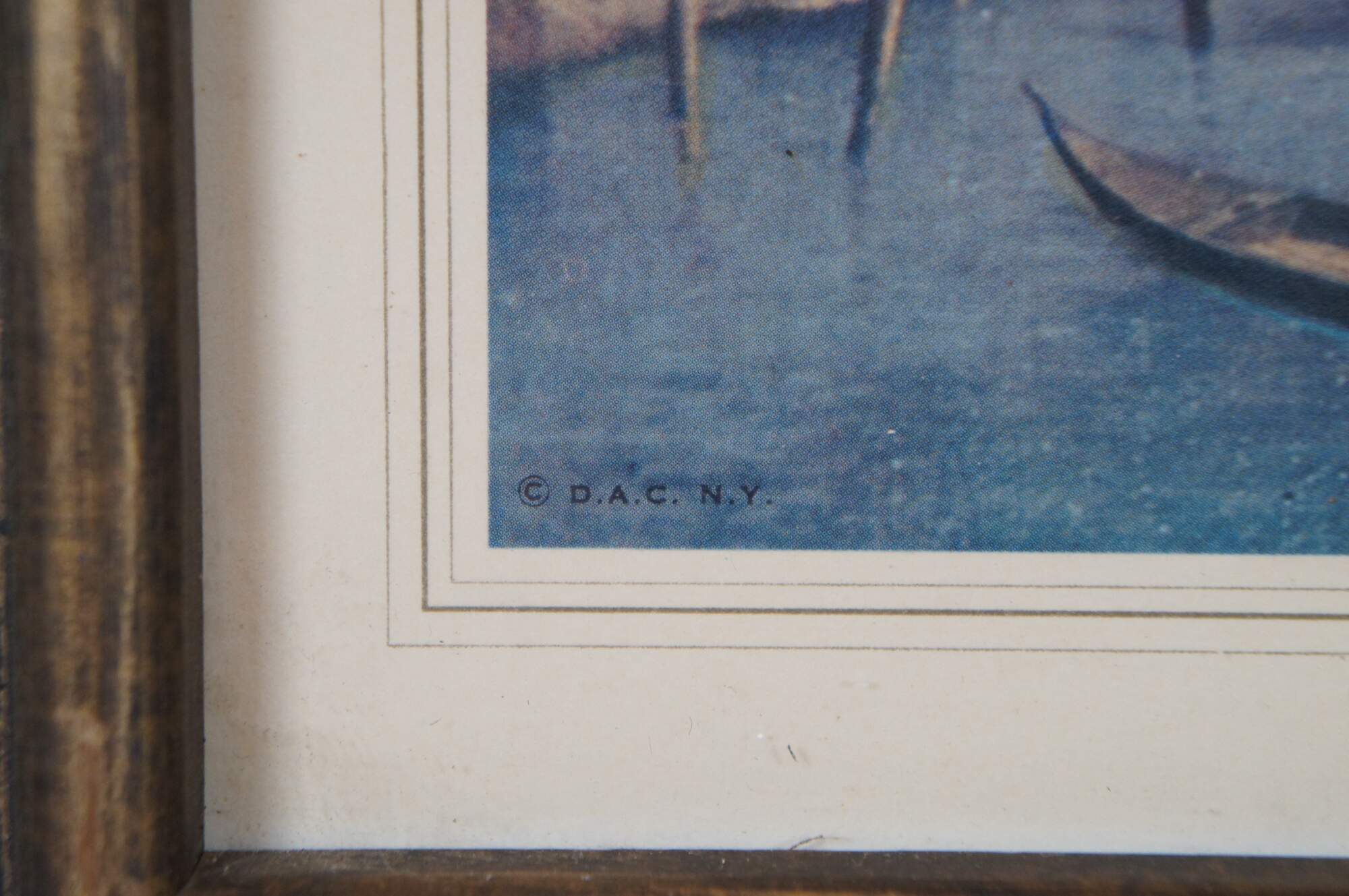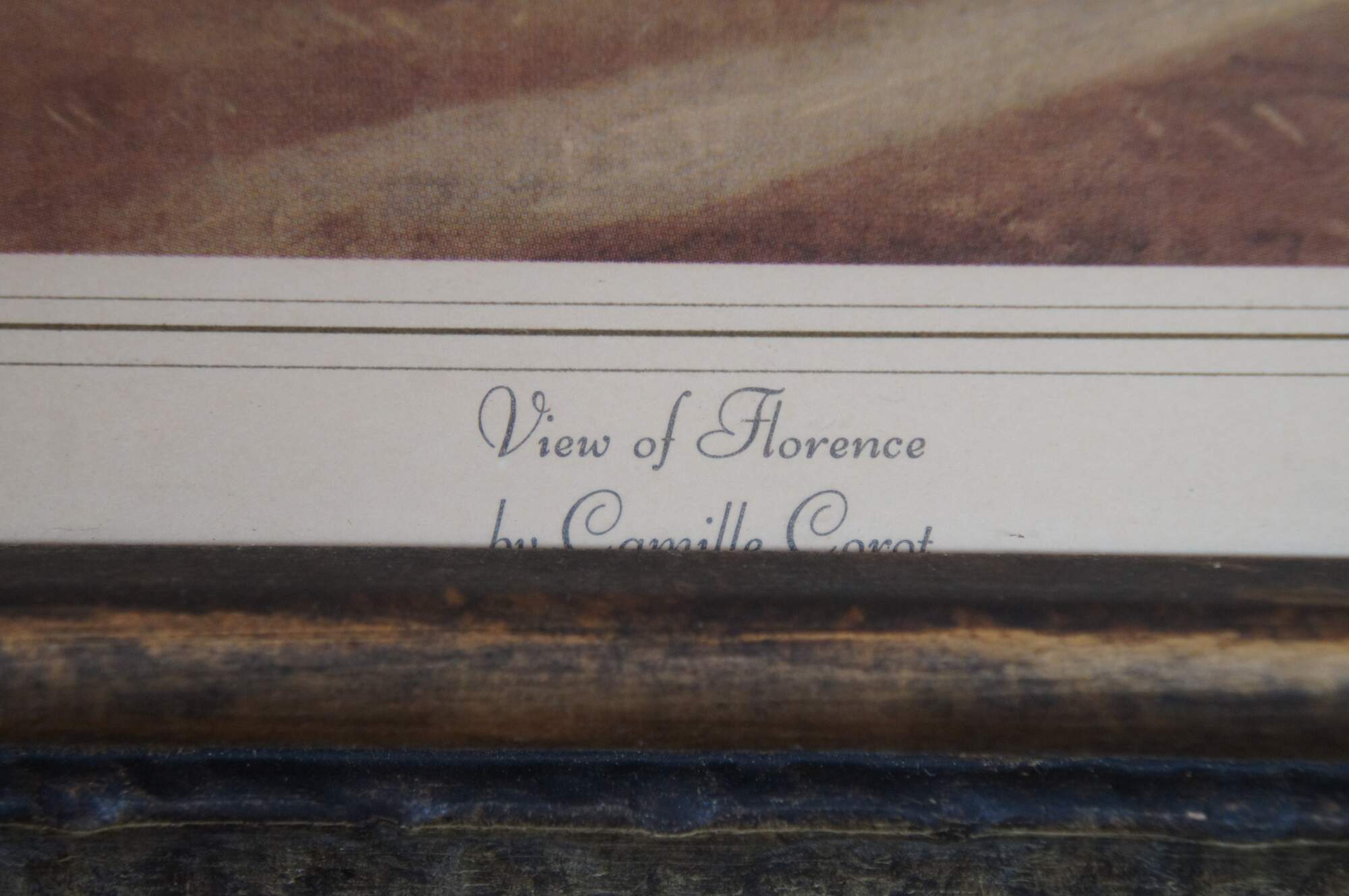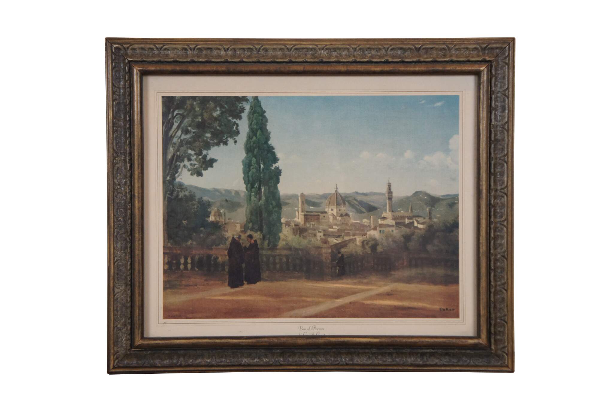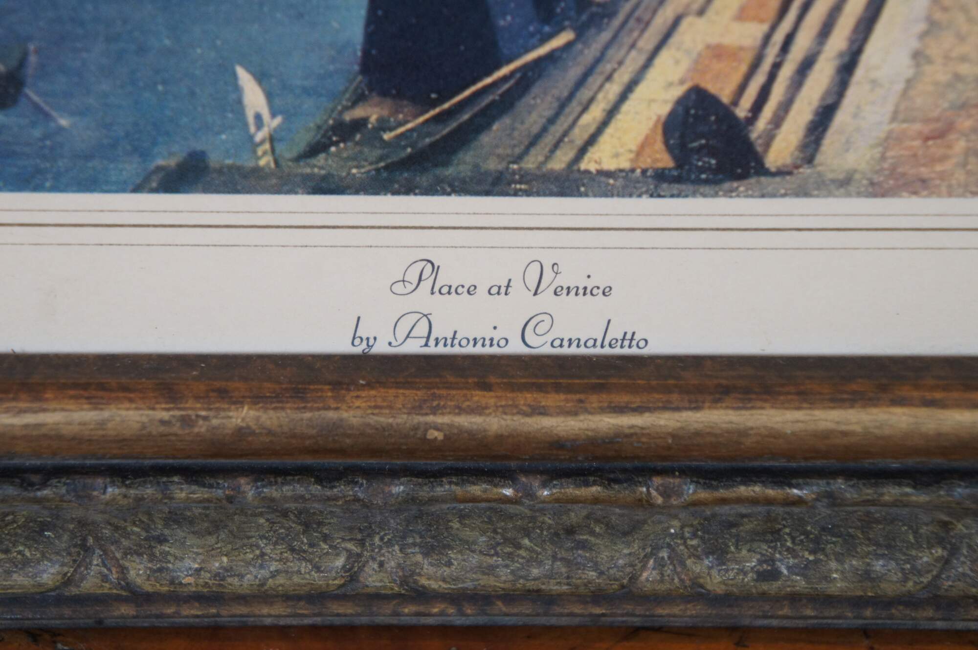 Pair of mid 20th century lithograph prints depicting two scenes of Italy - "Place at Venice" by Antonio Canaletto and "View of Florence" by Camille Corot. Published by the Donald Art Company of New York. Carved wood frame; faux mat / printed border around art.