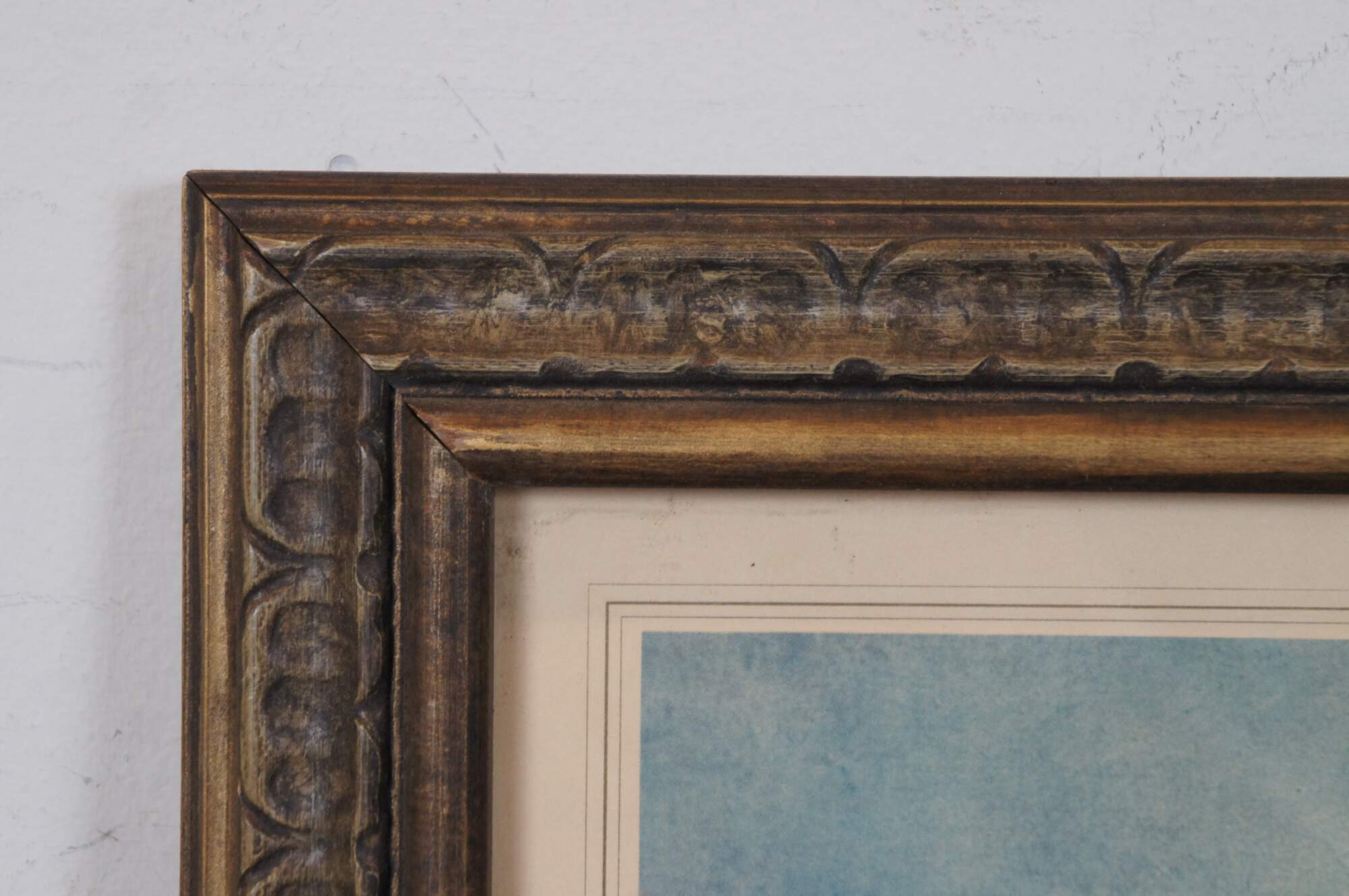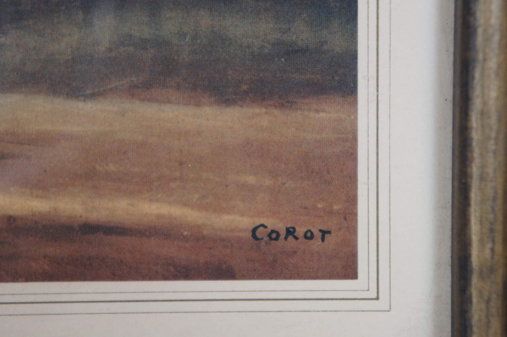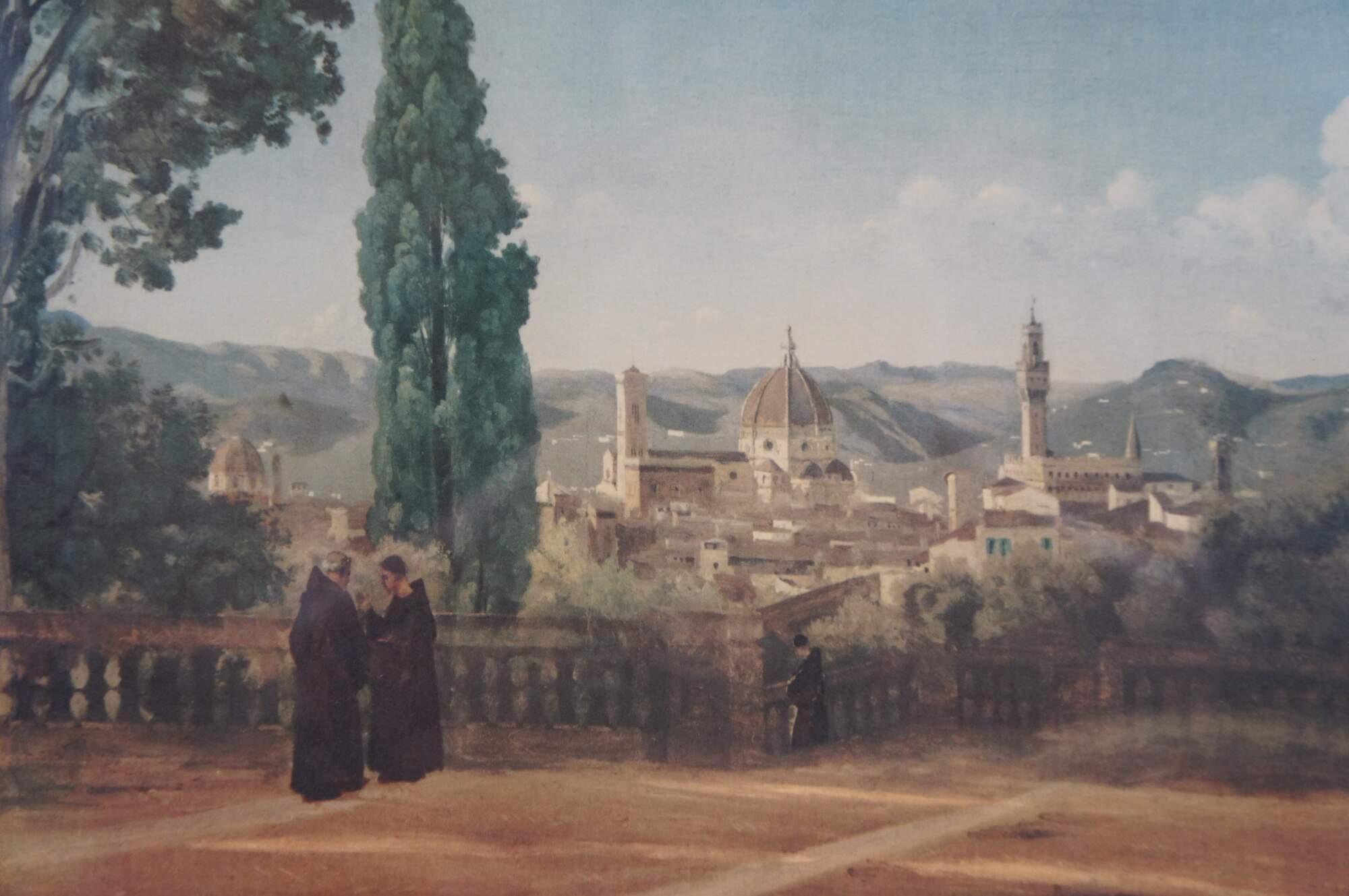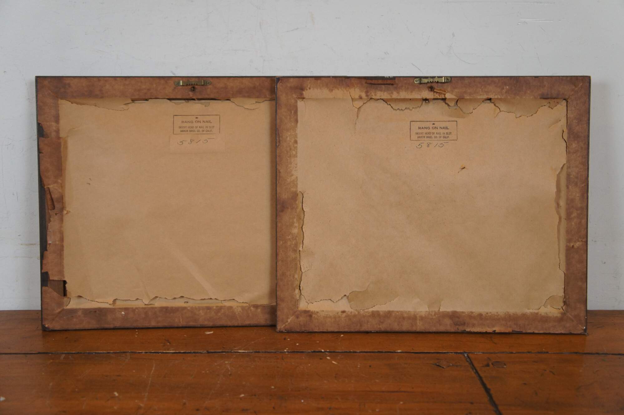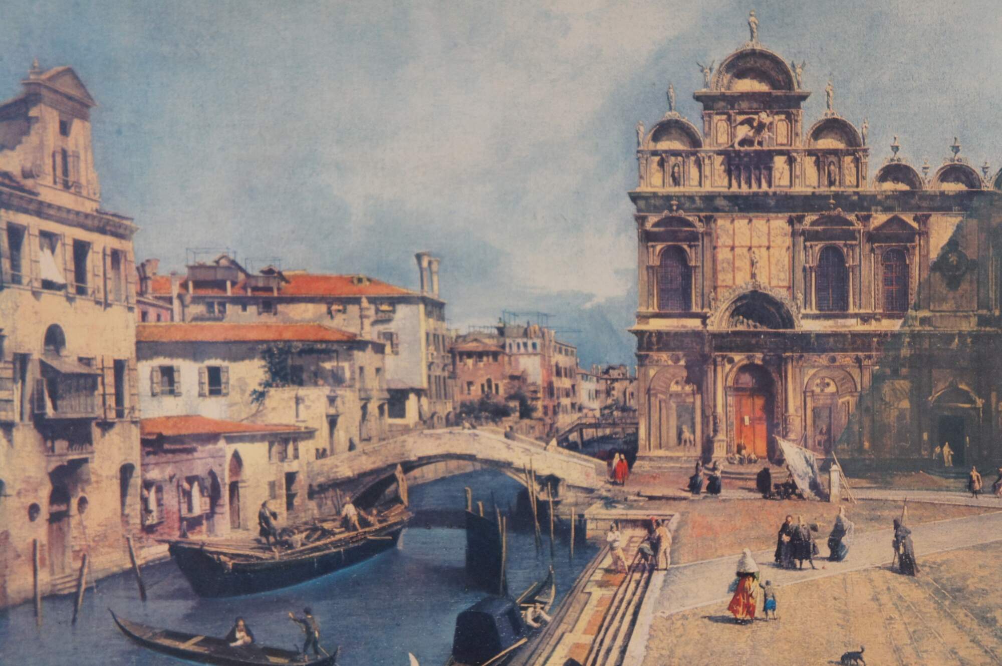 Pair of mid 20th century lithograph prints depicting two scenes of Italy - "Place at Venice" by Antonio Canaletto and "View of Florence" by Camille Corot. Published by the Donald Art Company of New York. Carved wood frame; faux mat / printed border around art.
