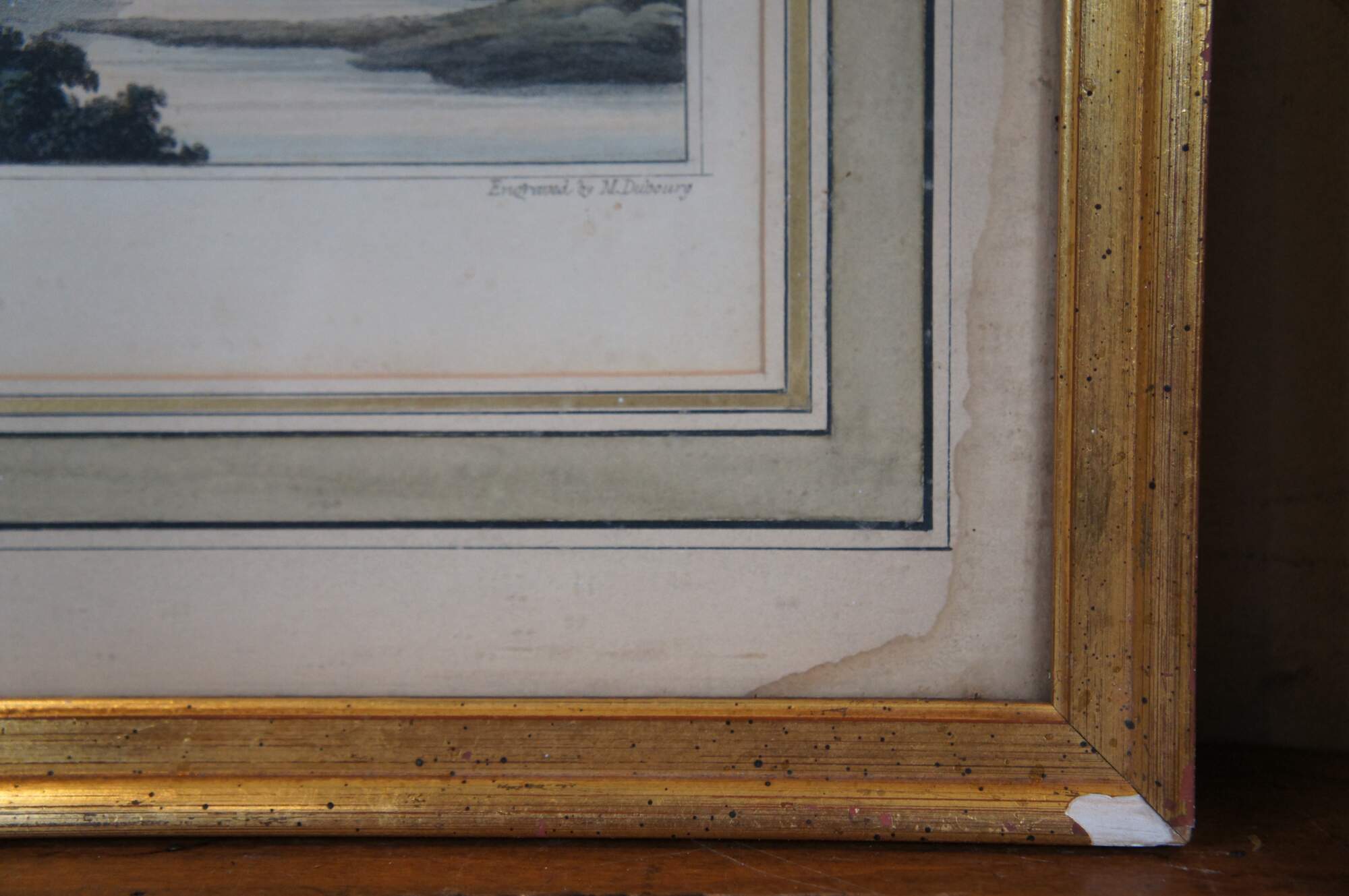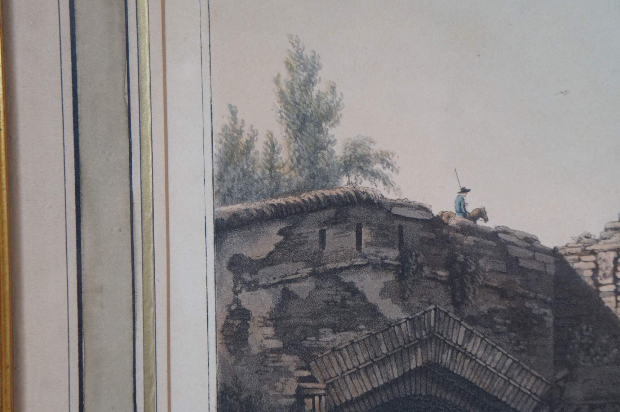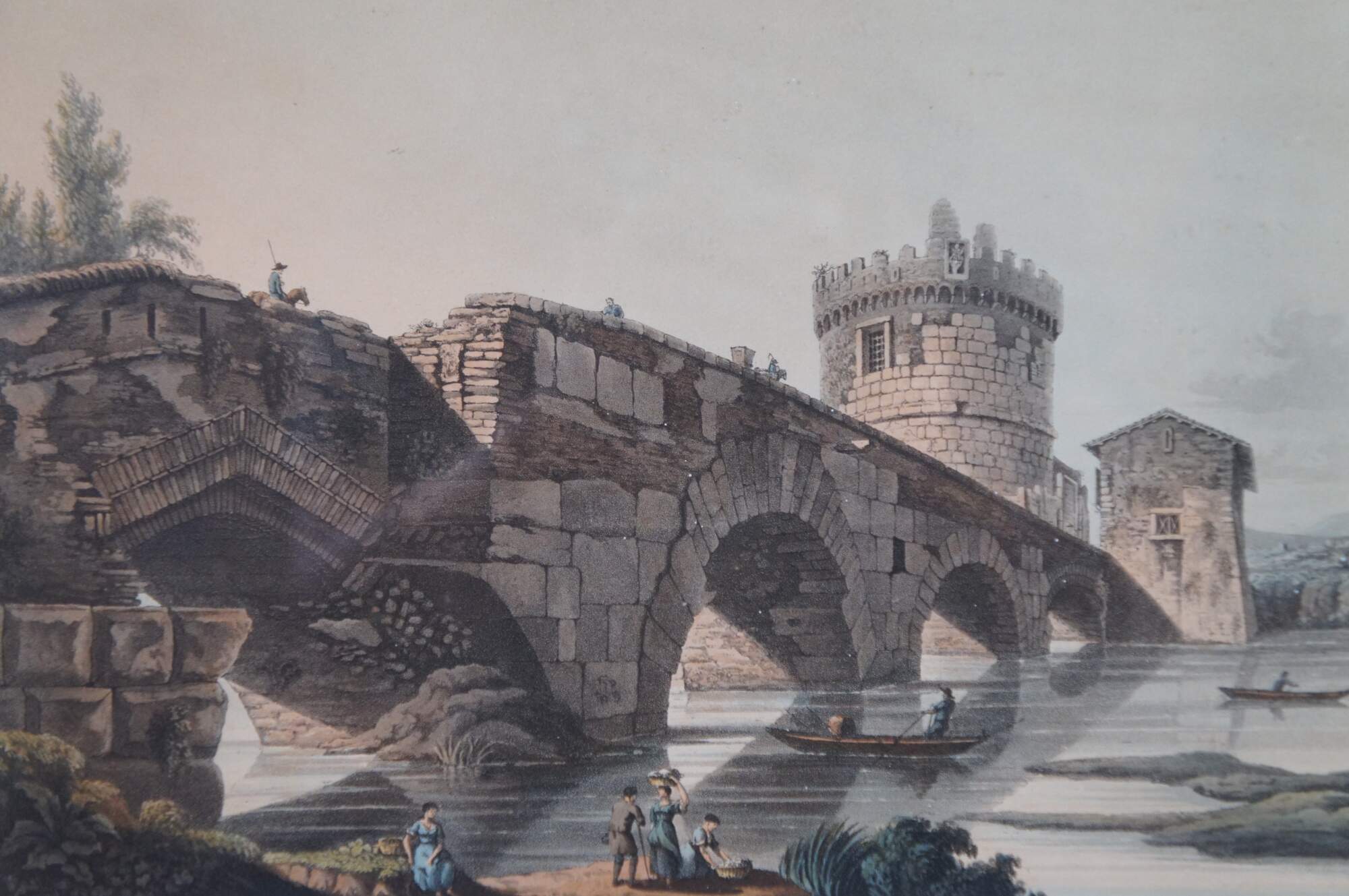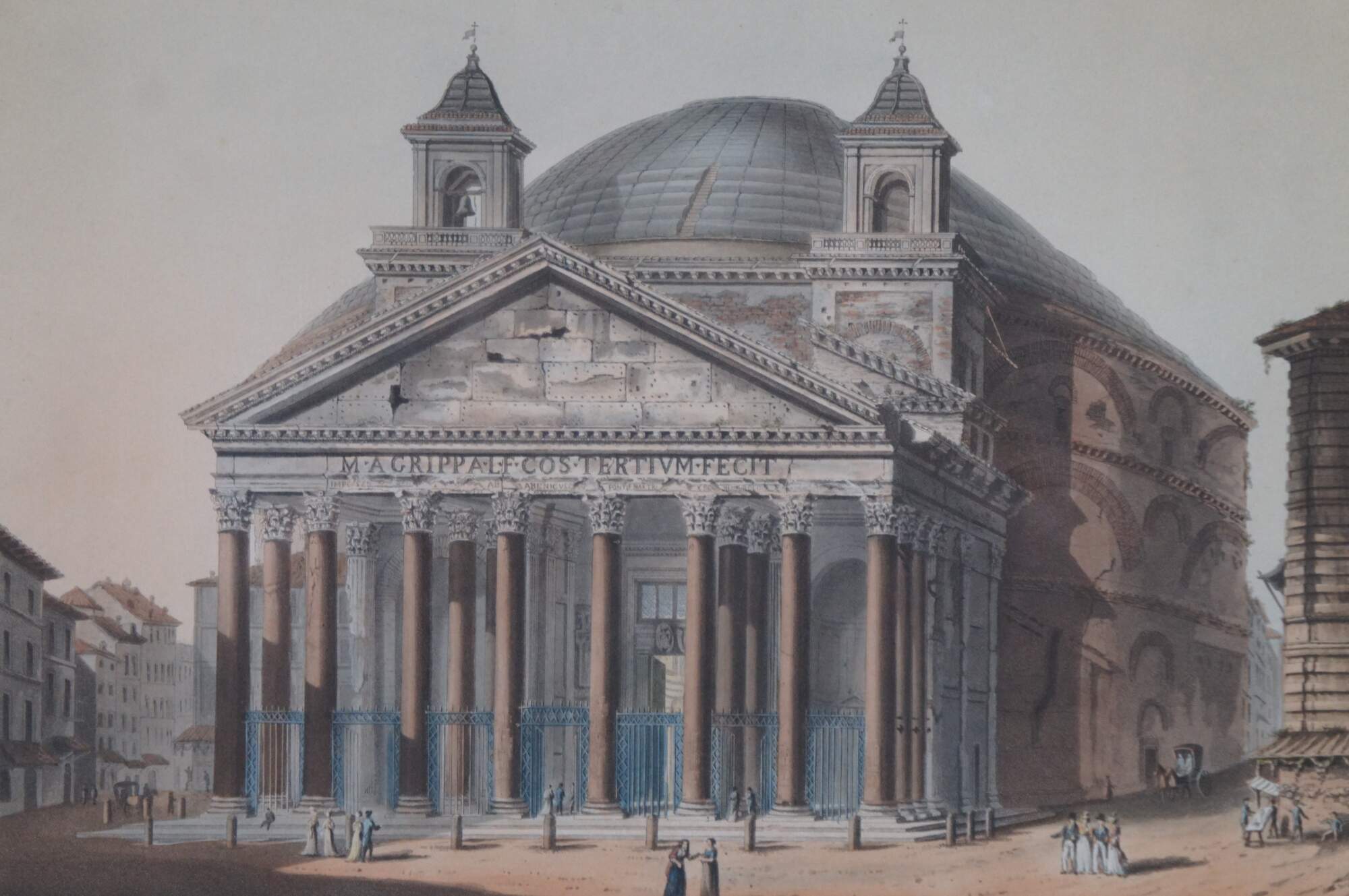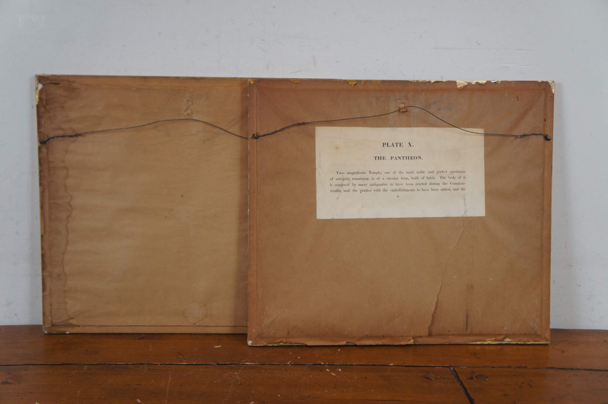 Pair of antique architectural Grecian / Roman aquatint engravings - "Plate 10 - The Pantheon" and "Plate 11 - Ponte Lucano" engraved by Matthew Dubourg, extracted from the book "Views of the Remains of Ancient Buildings in Rome and its Vicinity," first published in 1820. Beveled gilt frame; layered green and white mat with painted borders.