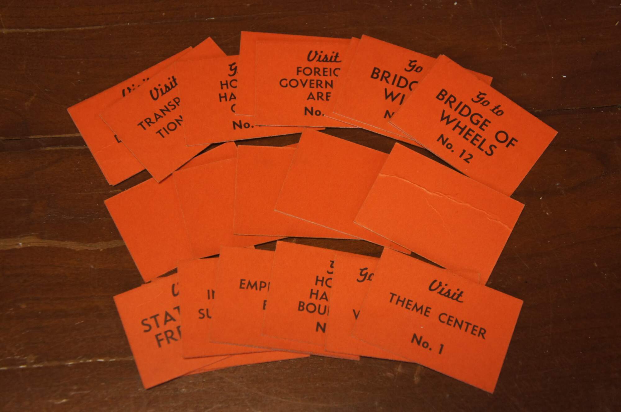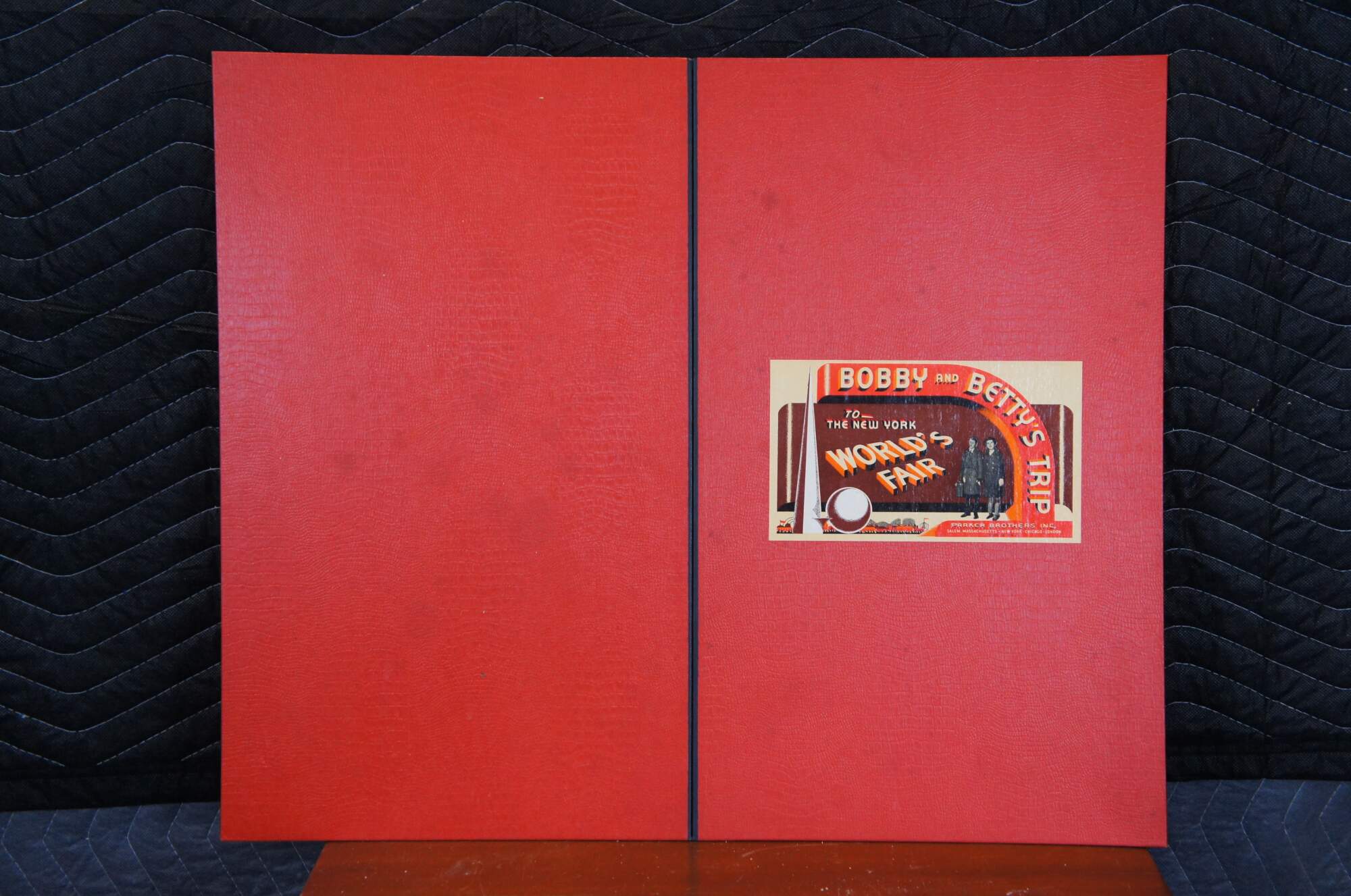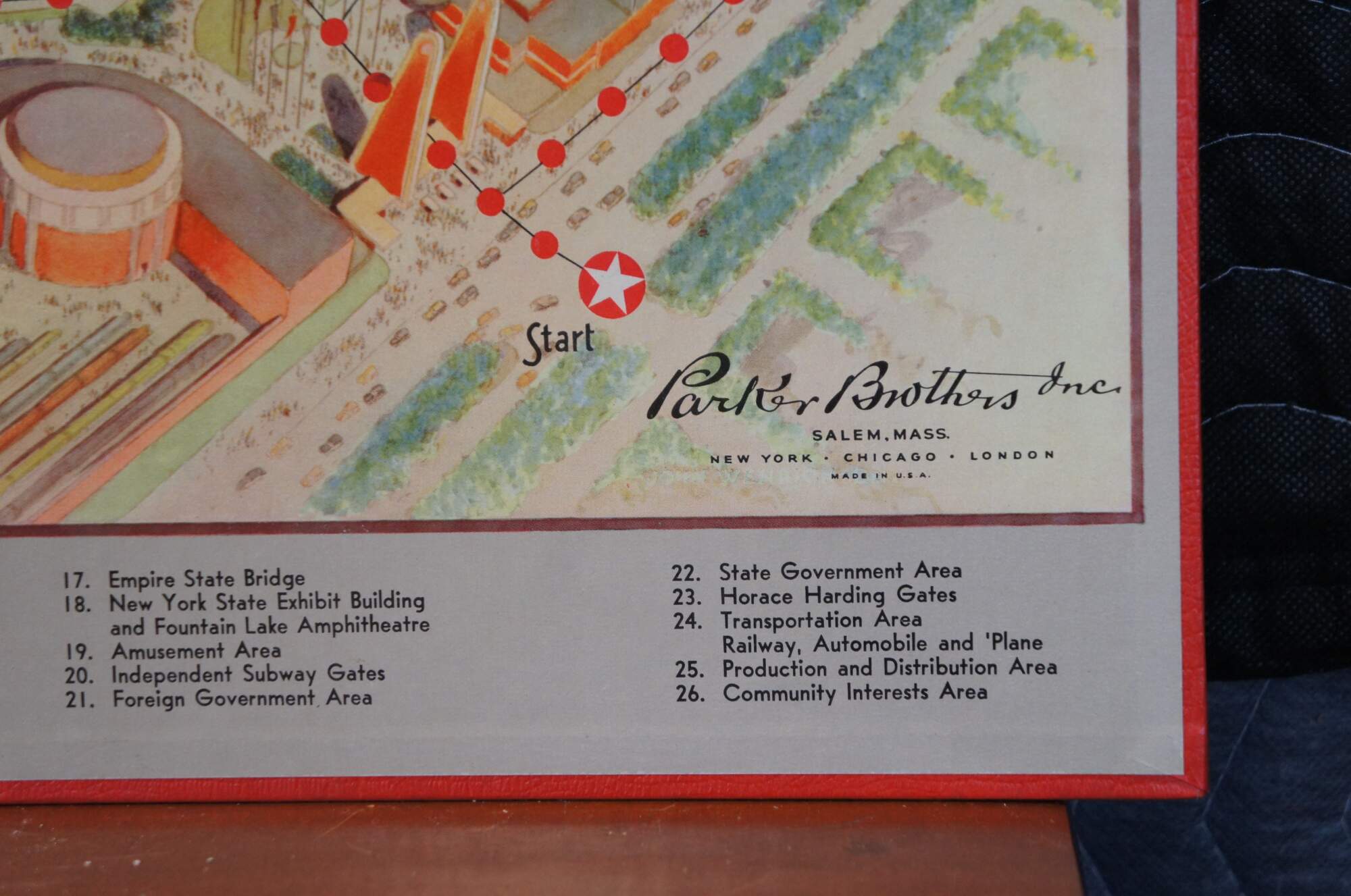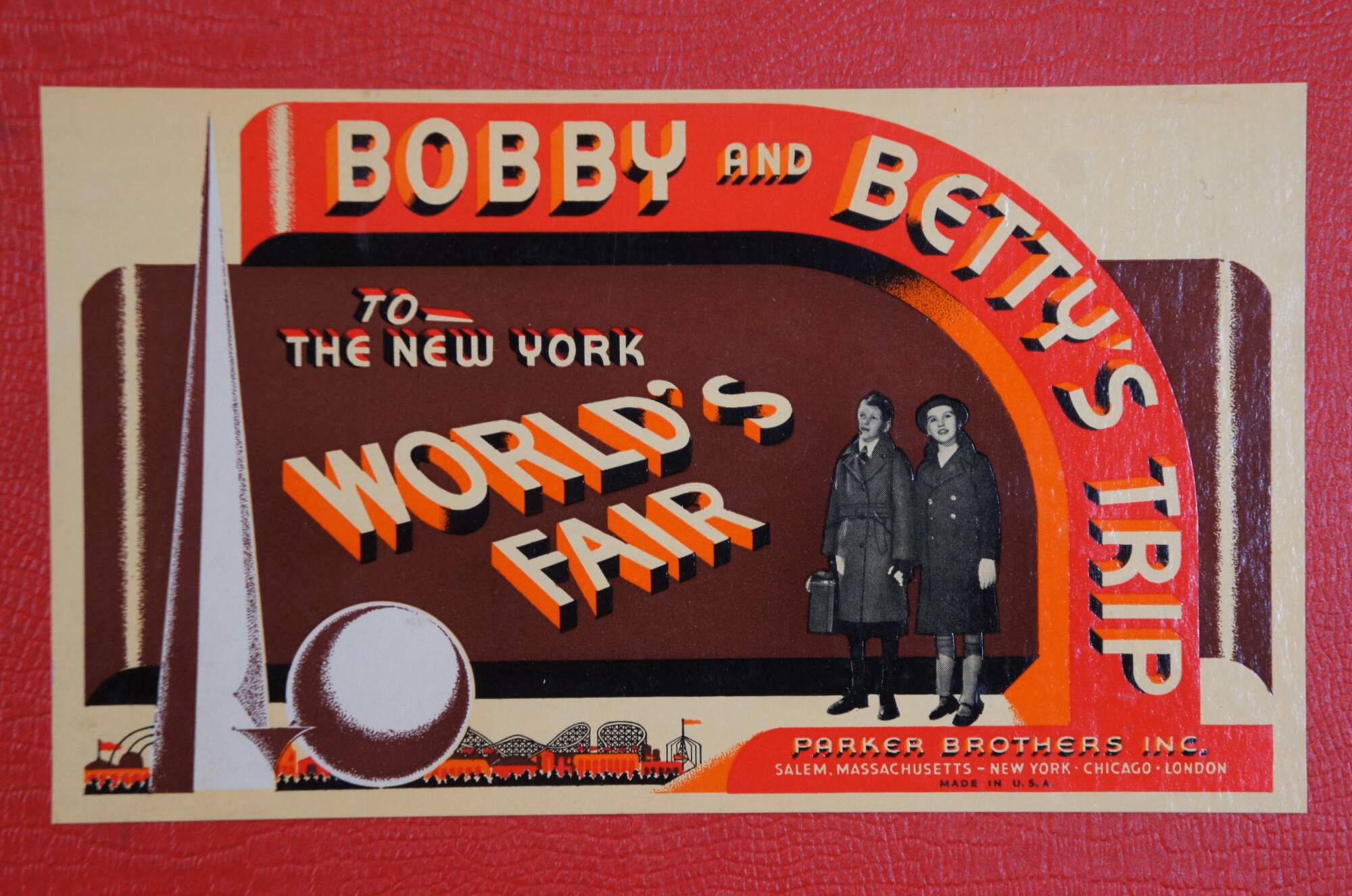 Rare antique 1939 board game, Bobby and Betty's Trip to the New York World's Fair by Parker Brothers Inc. Set includes original box, game board, instruction sheet, 25 Destination Cards, 24 character tokens, 5 dice and cardboard dice cup, and four wooden player pieces.