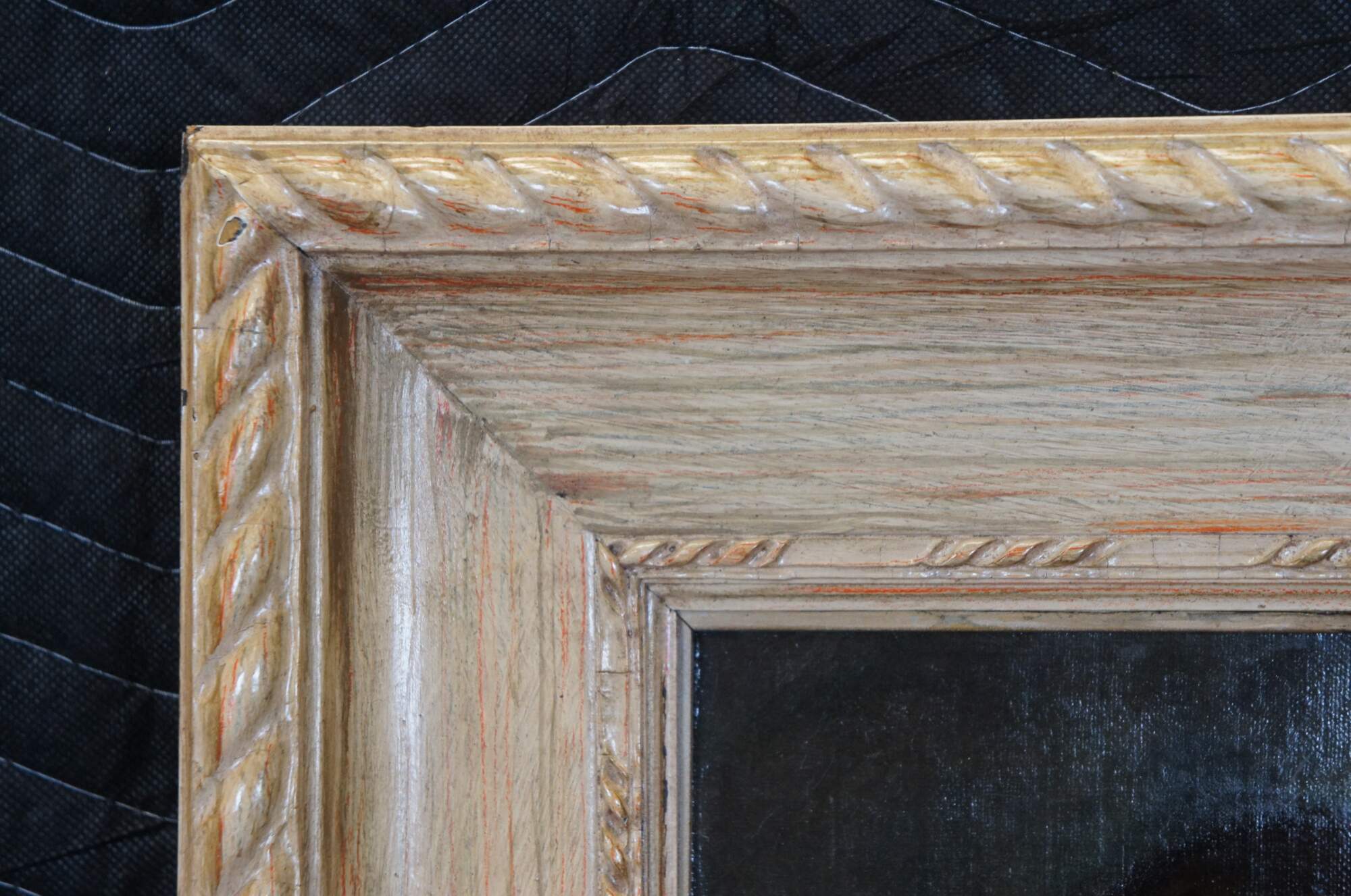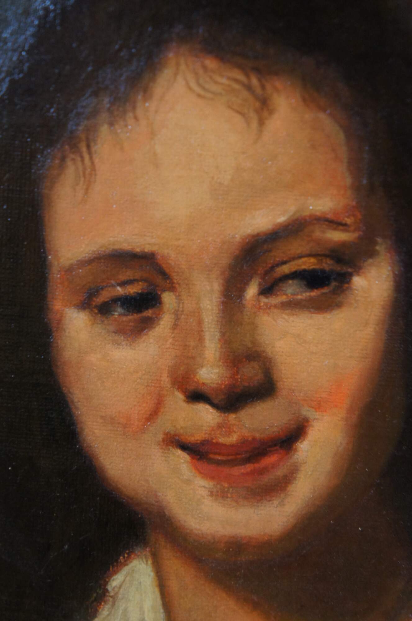 Early 20th century oil on canvas painting after Frans Hals' work known as "The Gypsy Girl." Depicts a young peasant woman with brown hair and lowf fronted blue bodice (as opposed to the original reddish orange). Beveled wood frame, painted to remeble pickled oak, with rope twist carved details. Gallery sticker from Harley L. Bickmore art collector / dealer to verso; Bickmore was long associated with the Closson Gallery Company, and owner of a gallery on 413 Race Street in Cincinnati.