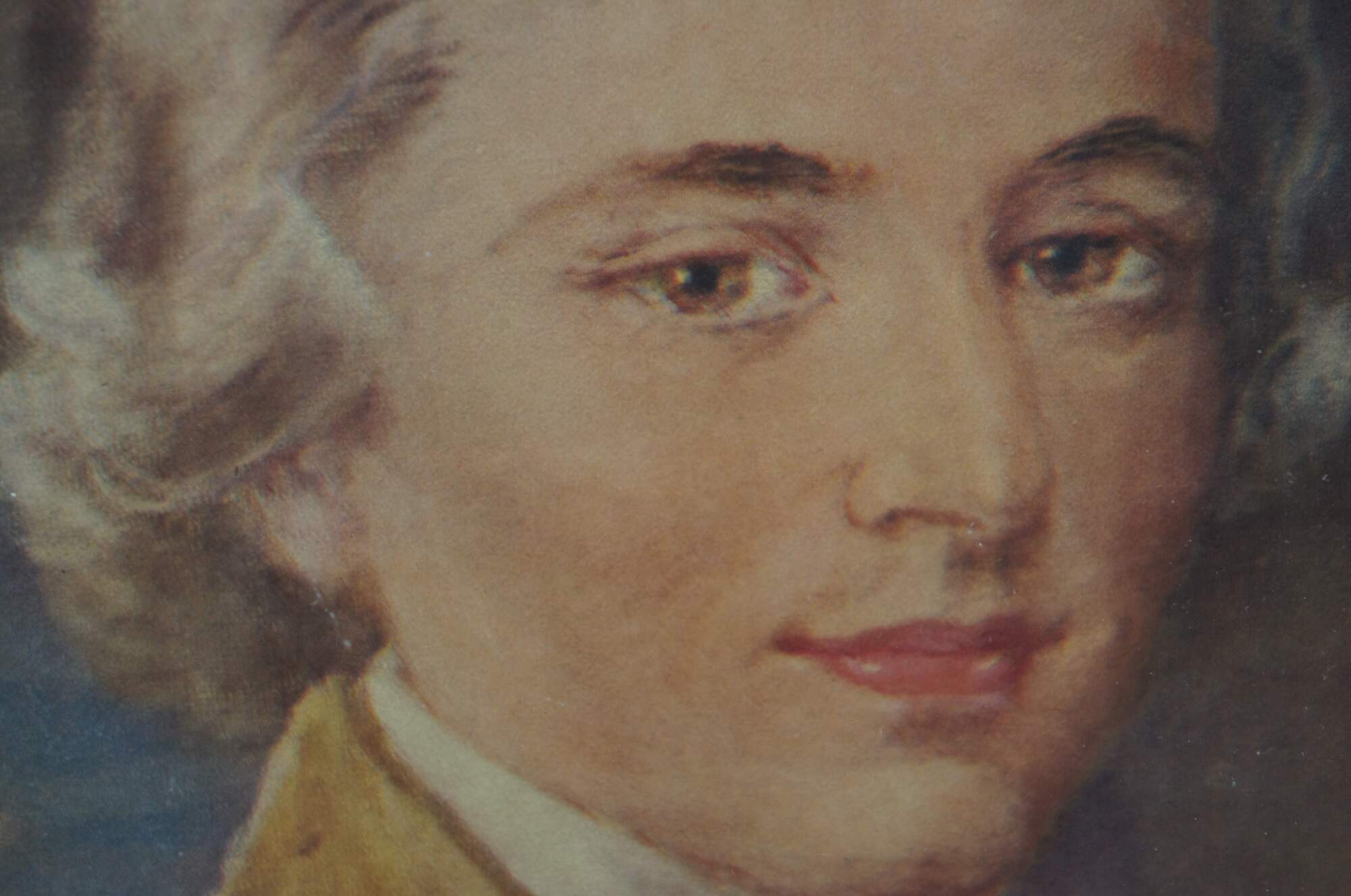 Pair of early 20th century lithograph prints depicting a pair of Colonial era figures - a woman with brown hair and beaded earring, and a man in green coat - set in painted grain "tiger oak" wood oval frames with convex / bubble glass fronts.