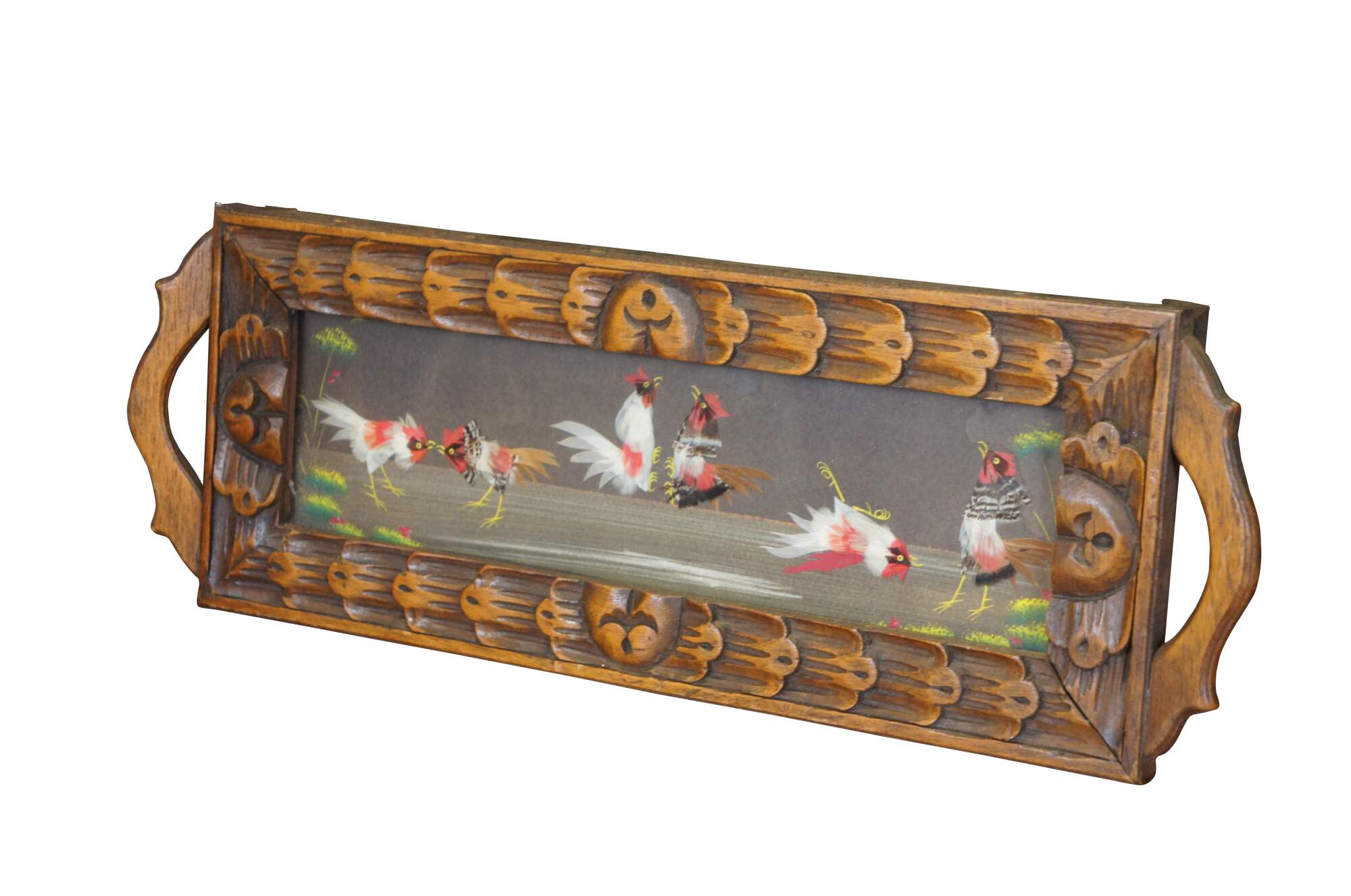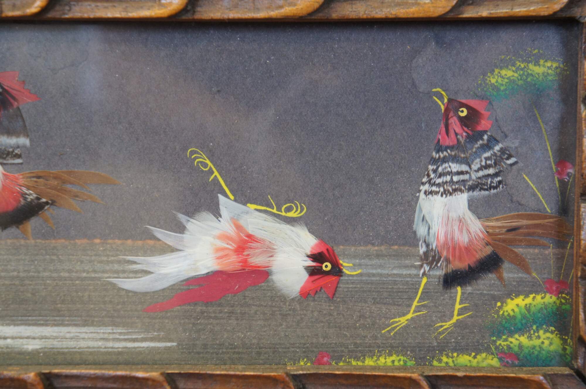 Circa mid 20th century Mexican folk art featuring a hand carved wooden tray / frame, set with a mixed media scene of six roosters cockfighting made of natural feathers on a painted backdrop. Eye hook on back for optional wall hanging.