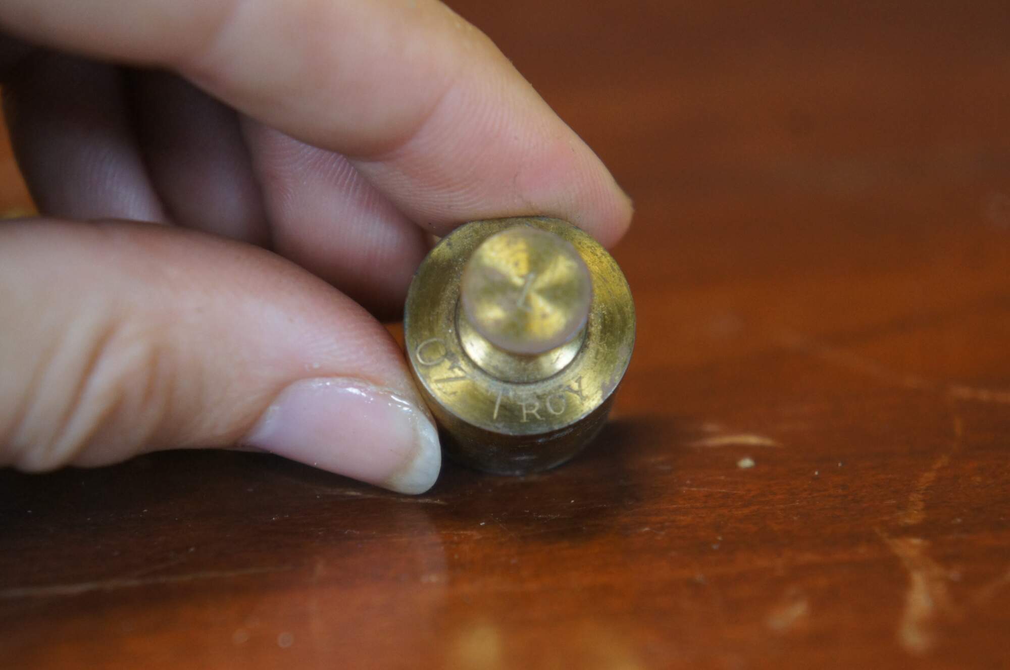 Vintage set of apothecary / parmacist's weights in white ceramic base. Includes six brass weights (1 Troy oz, 10dwt, 5, 2, and 1) and one coin shaped weight marked 23.