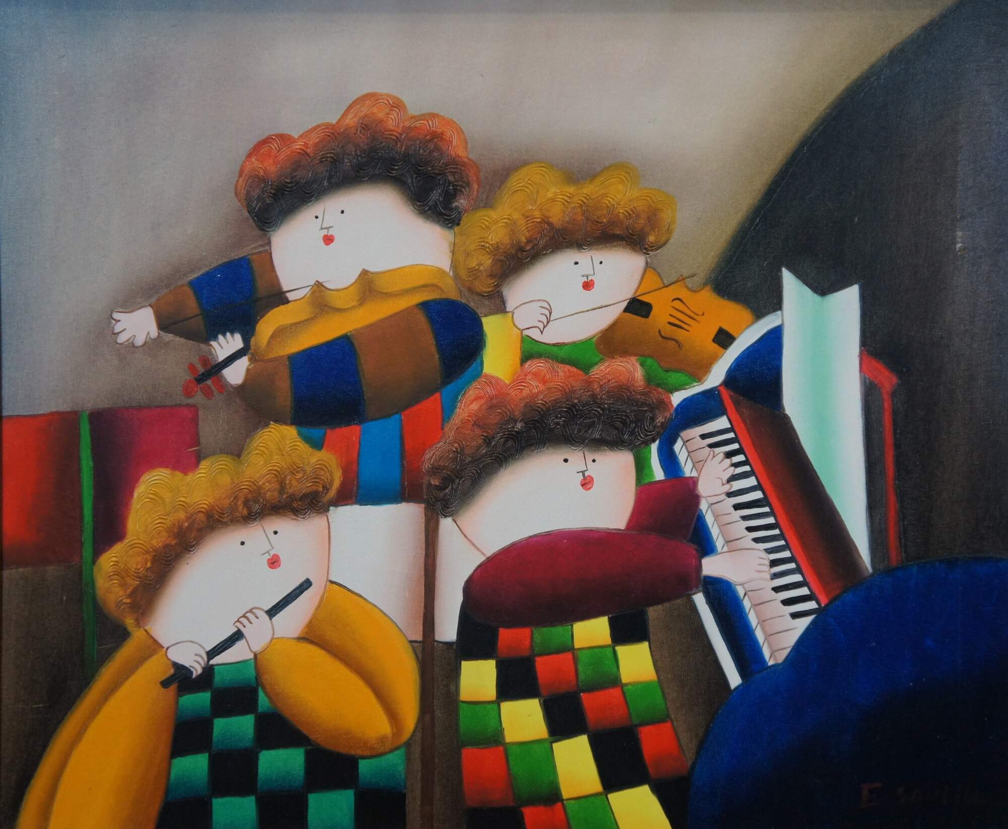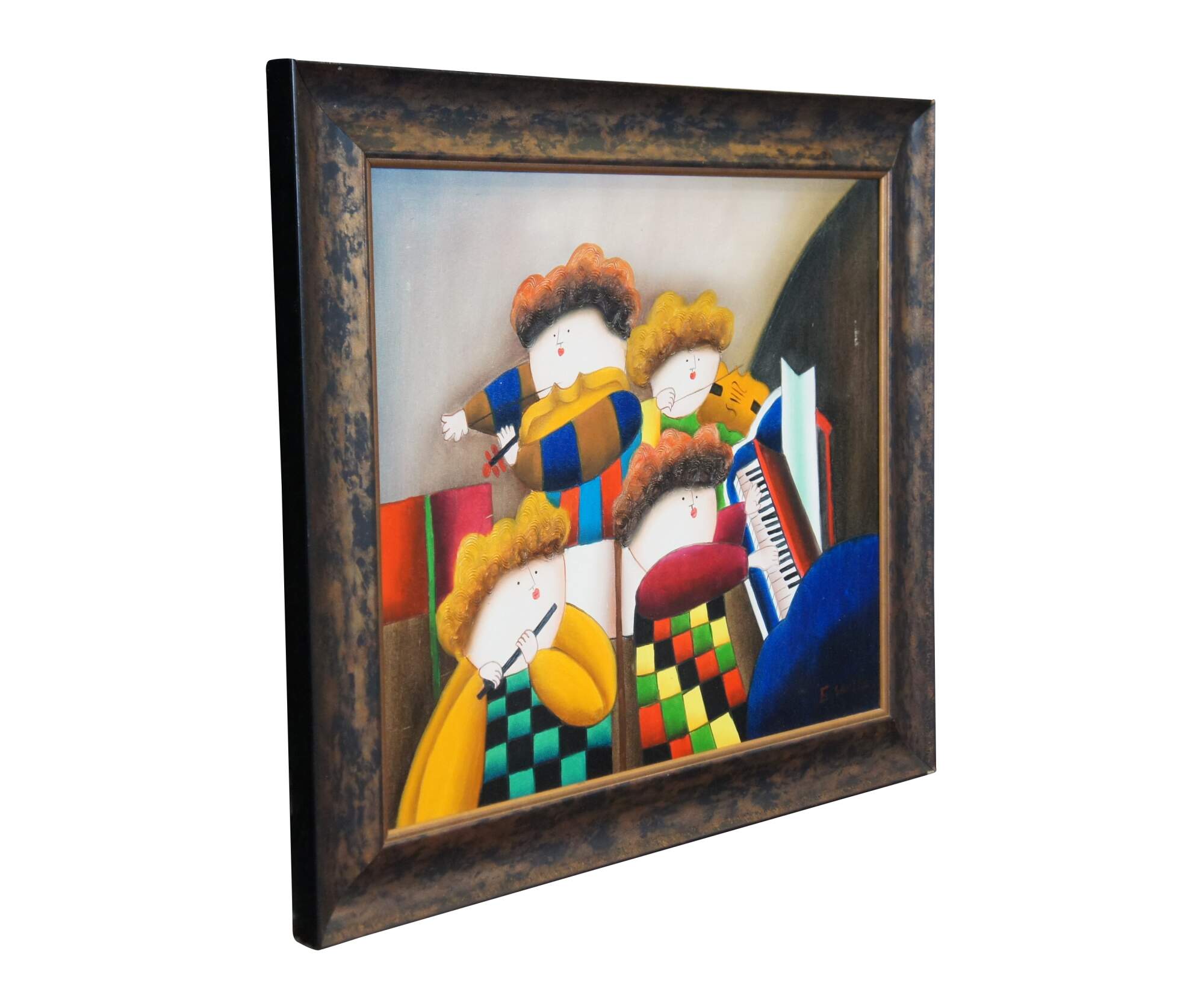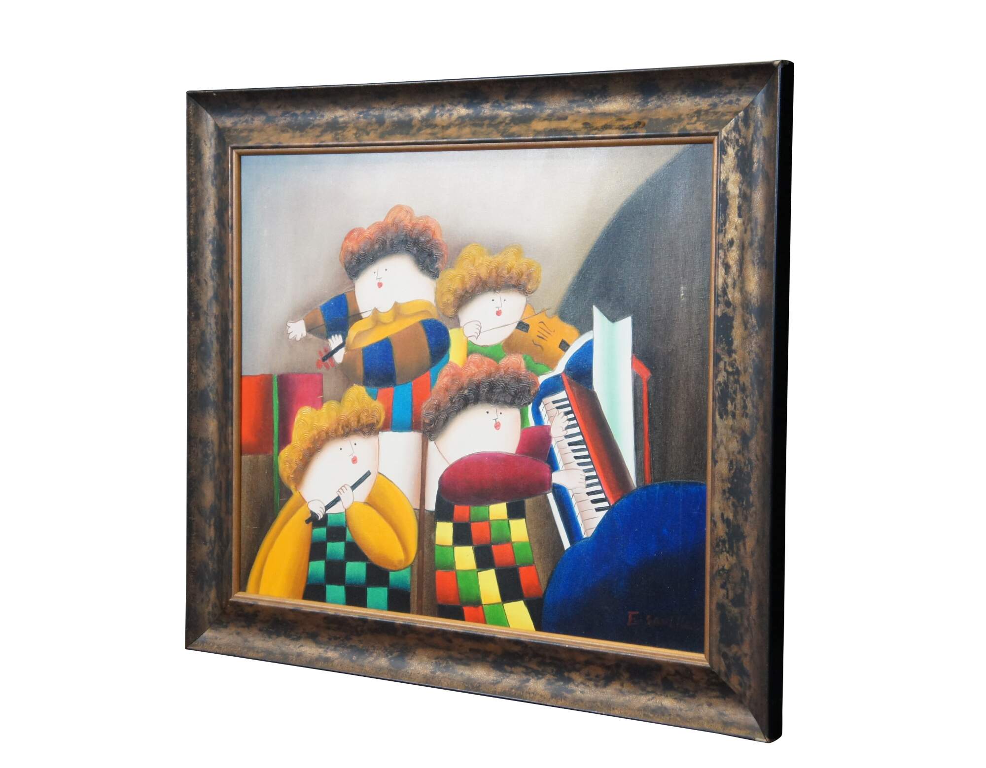 Late 20th century oil on canvas painting depicting a set of four orchestral musicians playing instruments in brightly colored clothing. Signed E. Saville in lower right corner. In the style of Graciela Rodo Boulanger and after works attributed to Joyce Roybal. Mottled brown beveled frame with gilt border.