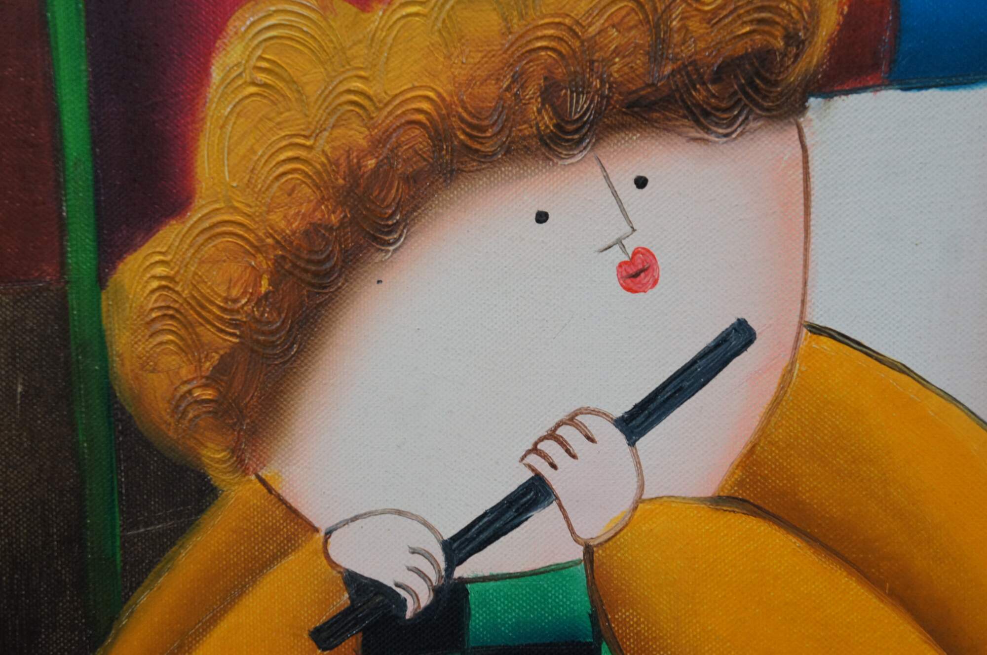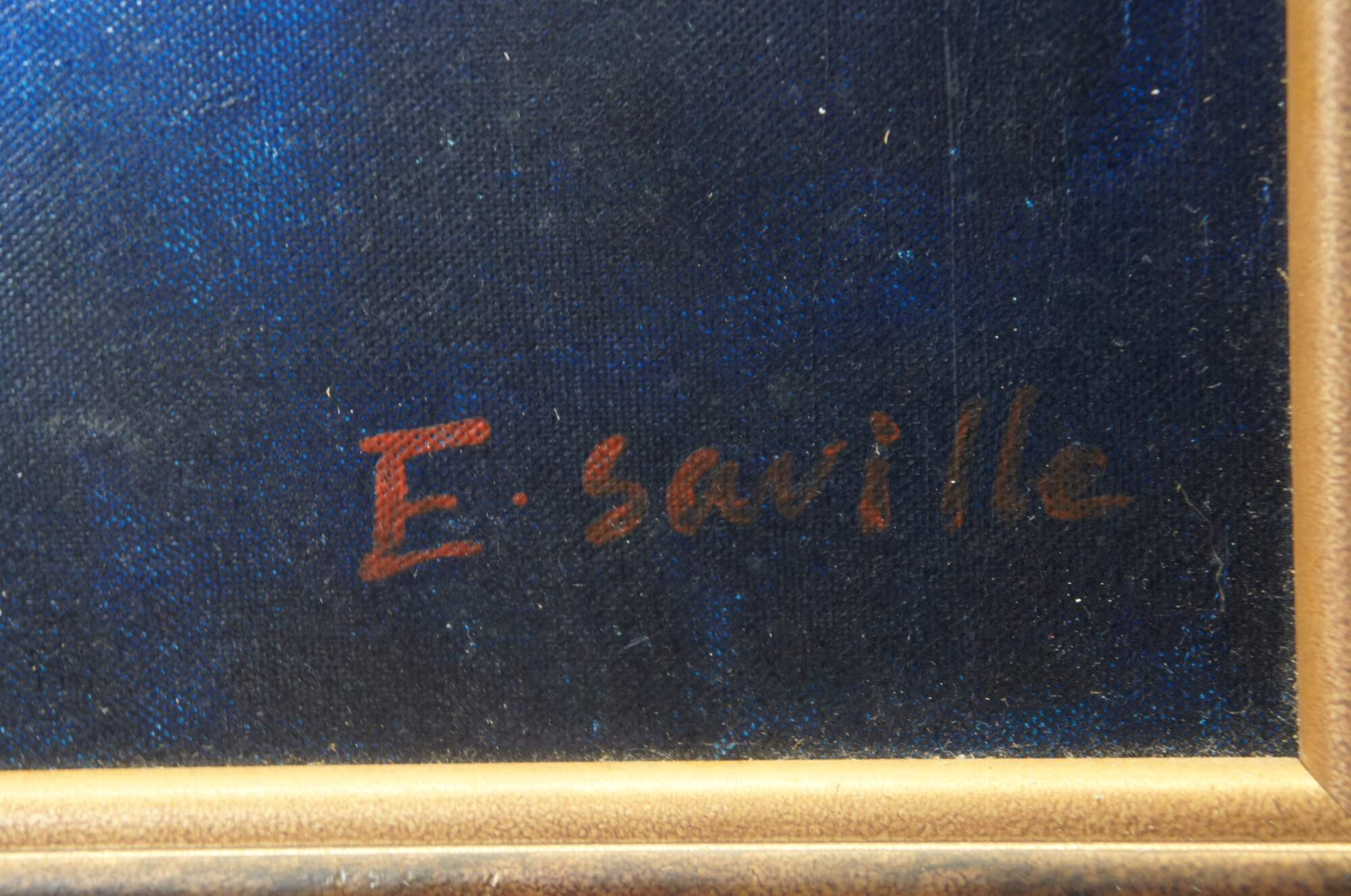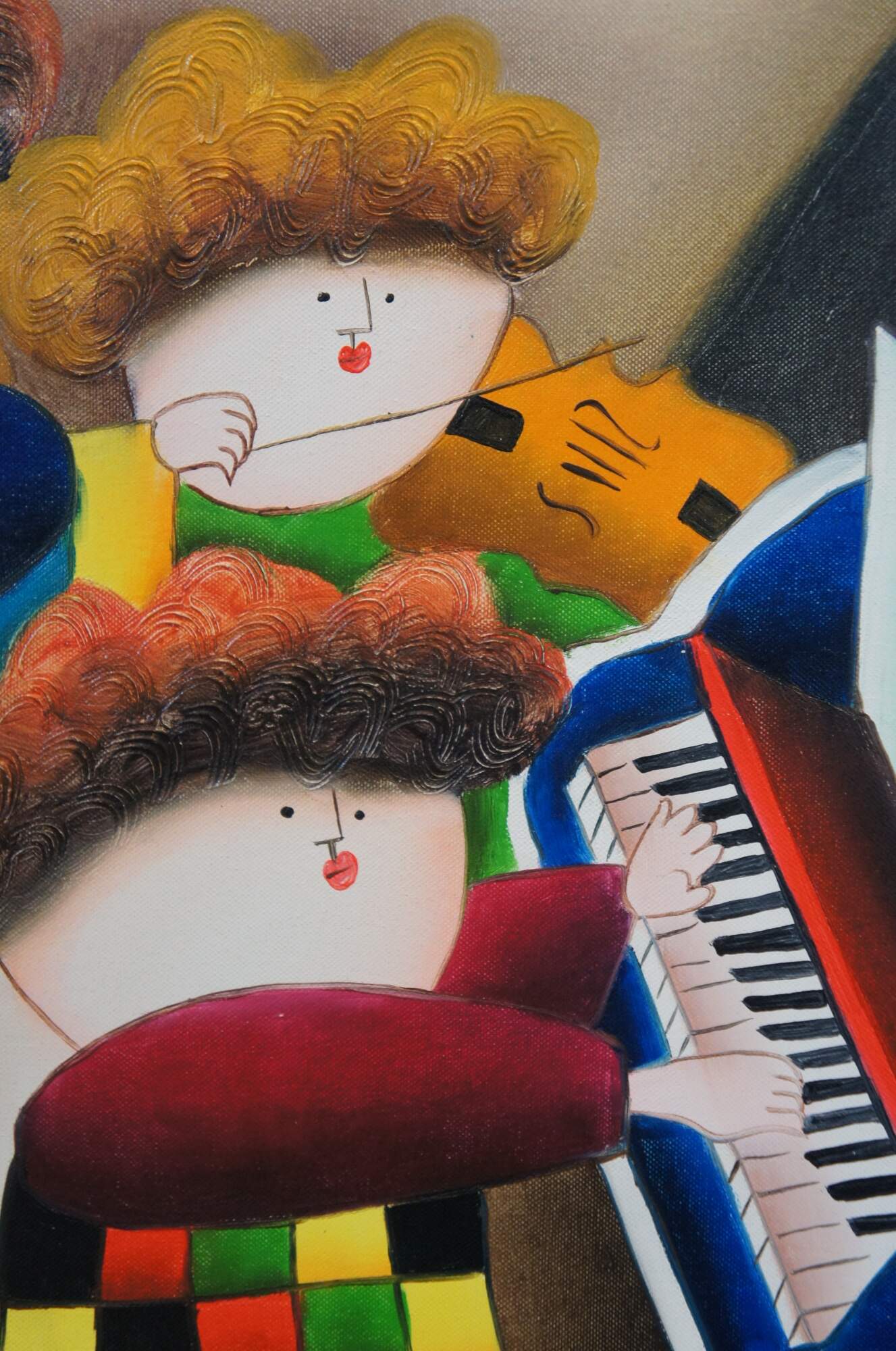 Late 20th century oil on canvas painting depicting a set of four orchestral musicians playing instruments in brightly colored clothing. Signed E. Saville in lower right corner. In the style of Graciela Rodo Boulanger and after works attributed to Joyce Roybal. Mottled brown beveled frame with gilt border.