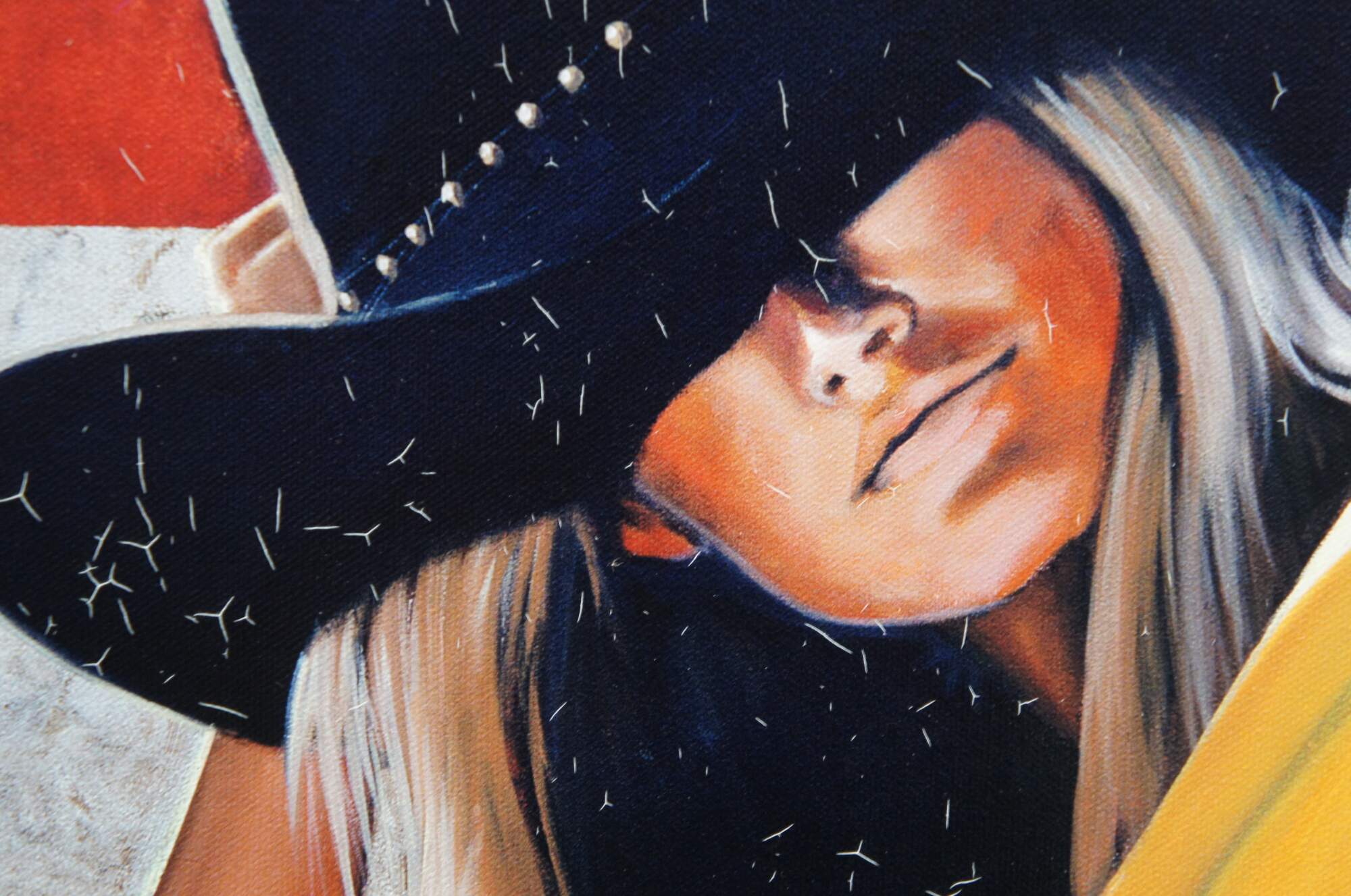 Vintage limited edition giclee on canvas print of "It's All Great by David DeVary. Depicts a seated southwestern / western female cowgirl figure in long studded cowboy boots, yellow duster, and black Stetson hat in front of an American flag. Signed and numbered 10/150 in lower right corner. This is the large edition.