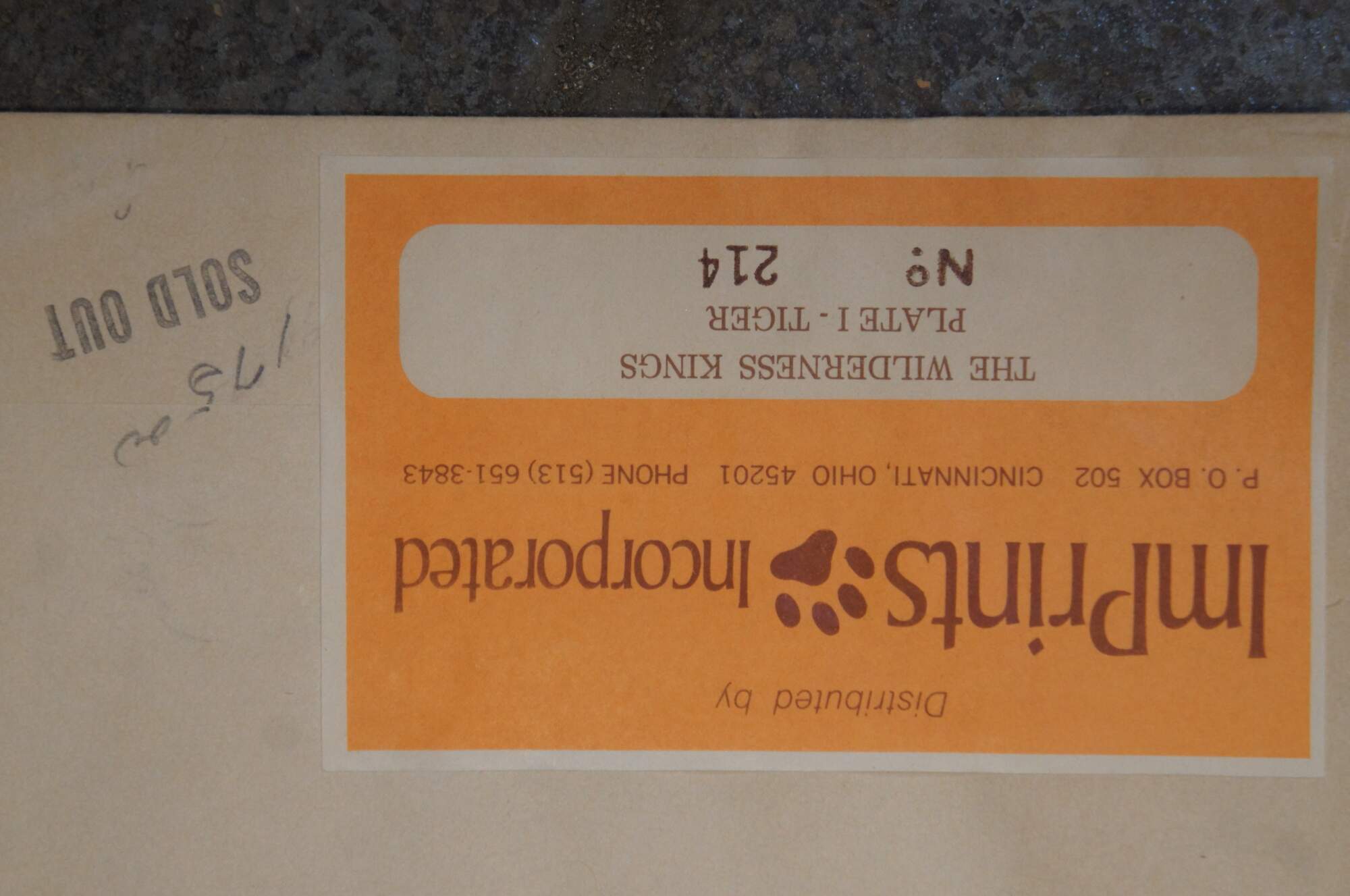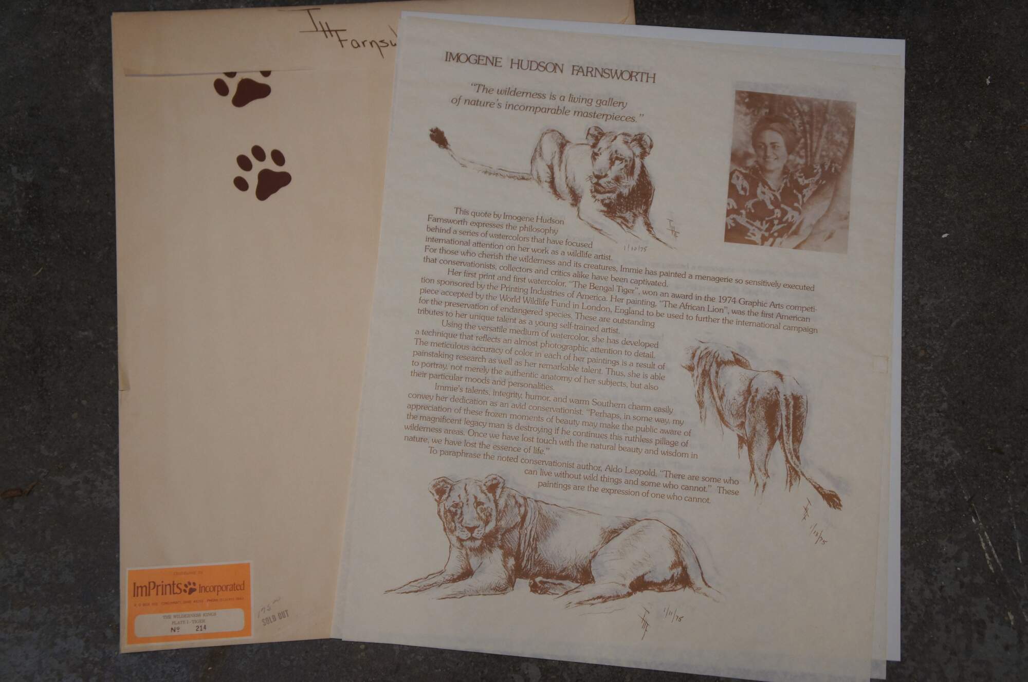 Pair of late 20th century limited edition lithograph prints by Imogene Hudson Farnsworth. "The Wilderness Kings - Plate I - Tiger" (Includes biography and original envelope; No. 214/3000) and "African Lioness and Cubs" (Includes Certificate of Registration and Authentication, No. 2192/3000). Both signed and numbered in lower right. Produced by ImPrints Incorporated. Beveled wood frame; tan and brown layered mat.