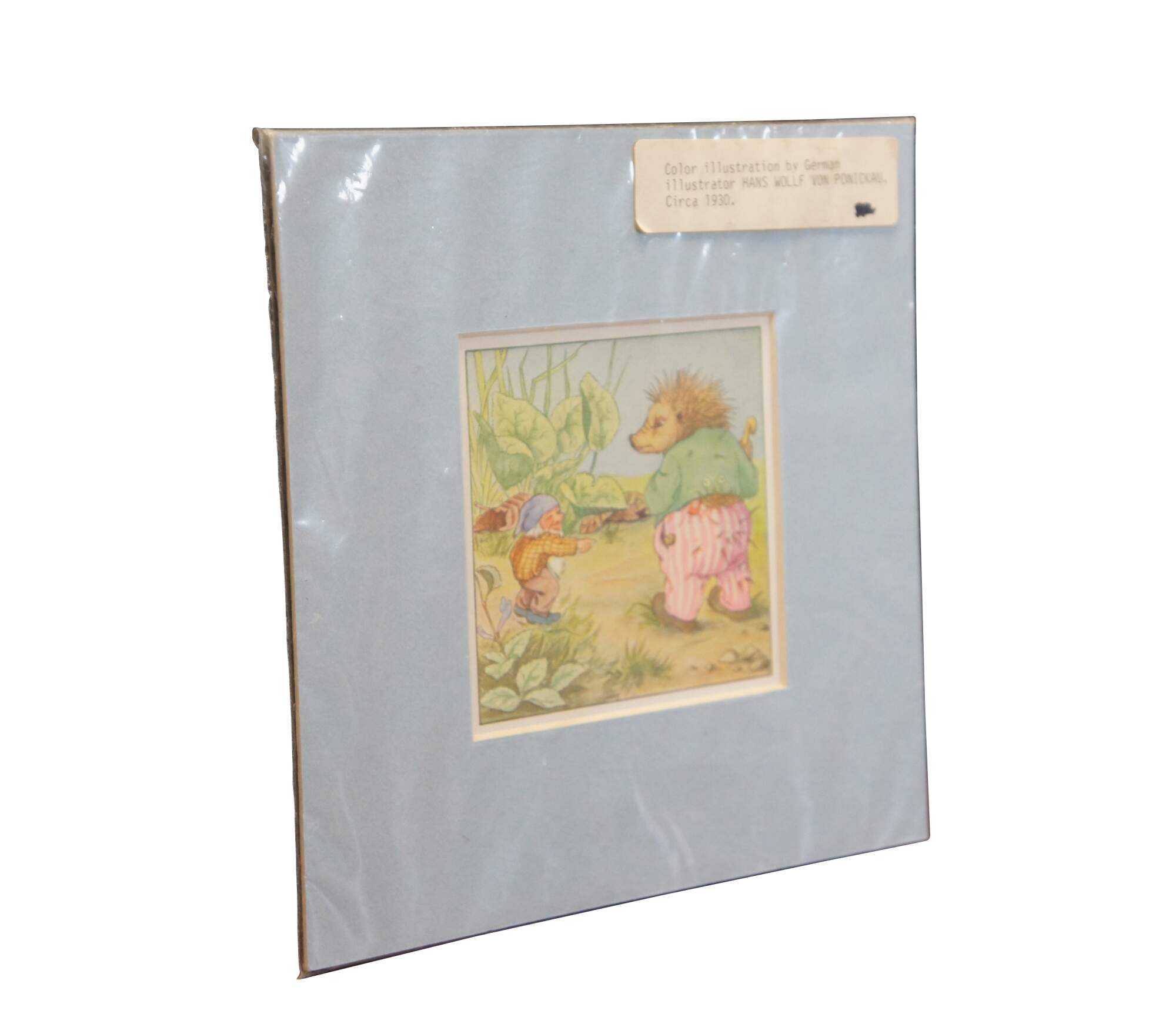 Circa 1930s color lithograph print depicting an illustration by Hans Wolff von Ponickau from a German children's fairy tale book, showing an anthropomorphic hedgehog being teased by a small garden gnome. A charming, whimsical image to dcorate a baby's room. Baby blue mat; sealed in plastic.