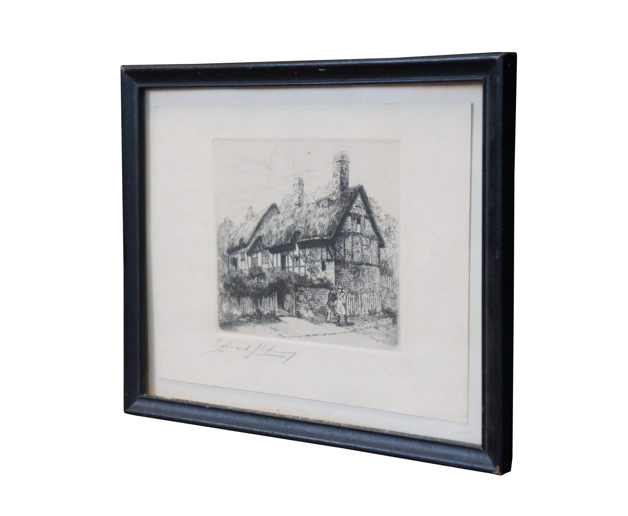 Vintage 20th century black and white etching by edward J. Cherry depicting a view of two men walking in front of the cottage of anne Hathaway (wife of William Shakespeare). Pencil signed along lower edge.