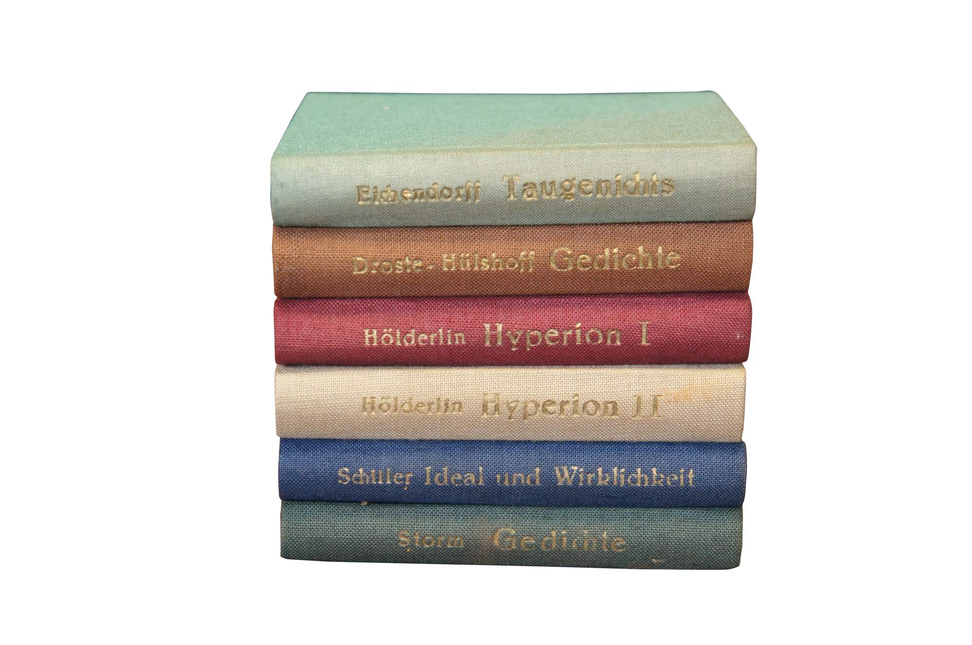 Set of six circa mid 20th century German language miniature books in a cardboard holder by the Hyperion Publishing House. Cloth bound hard covers. Set includes: