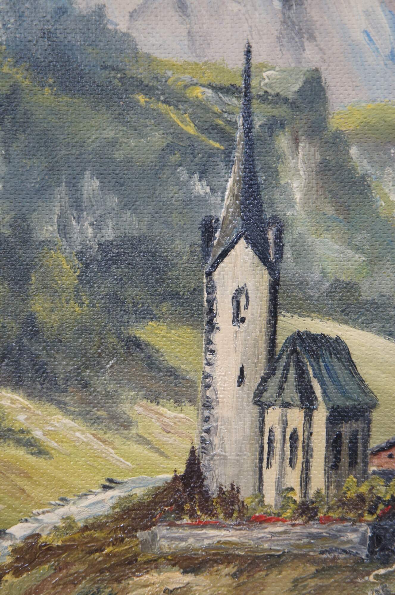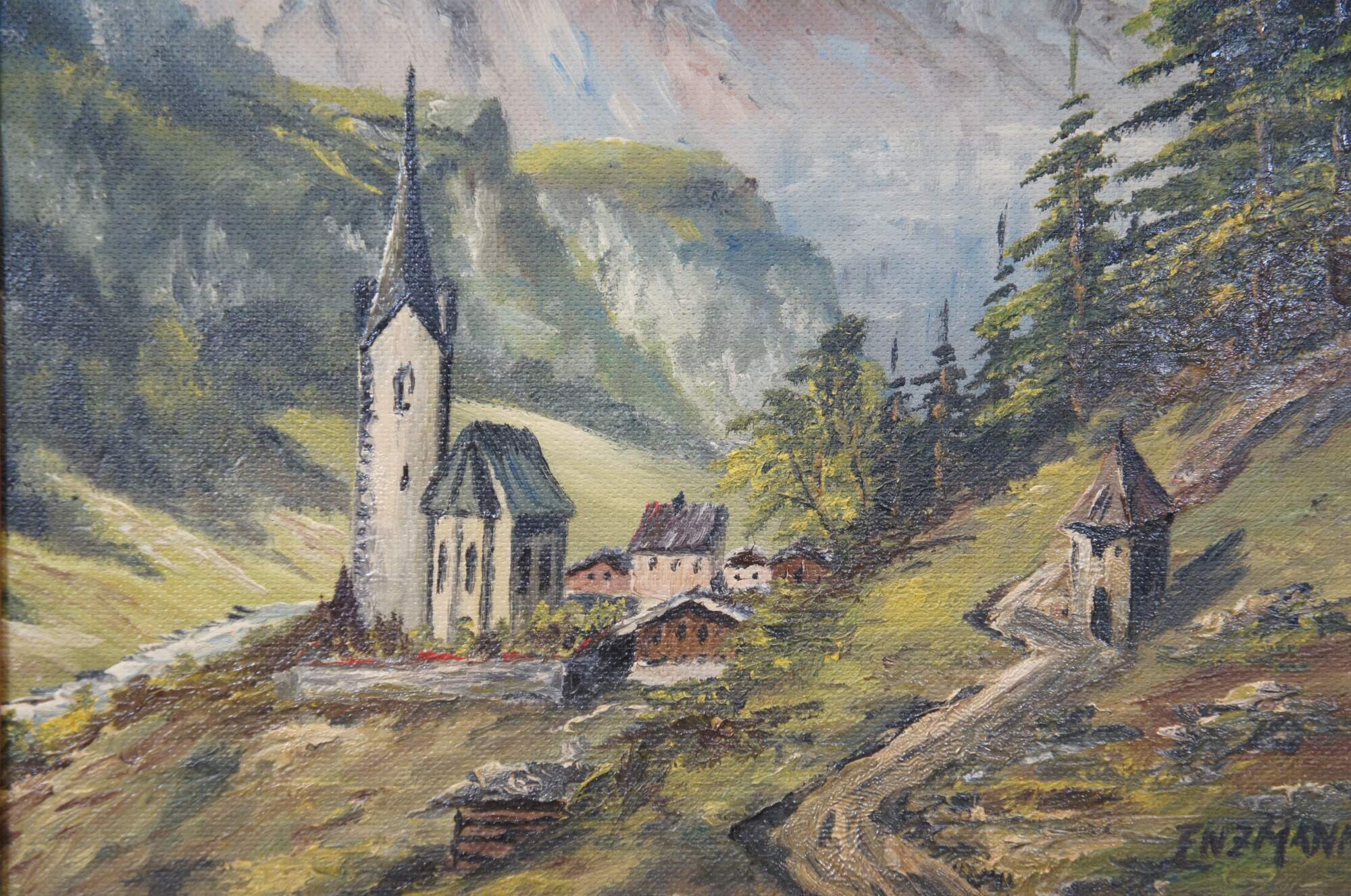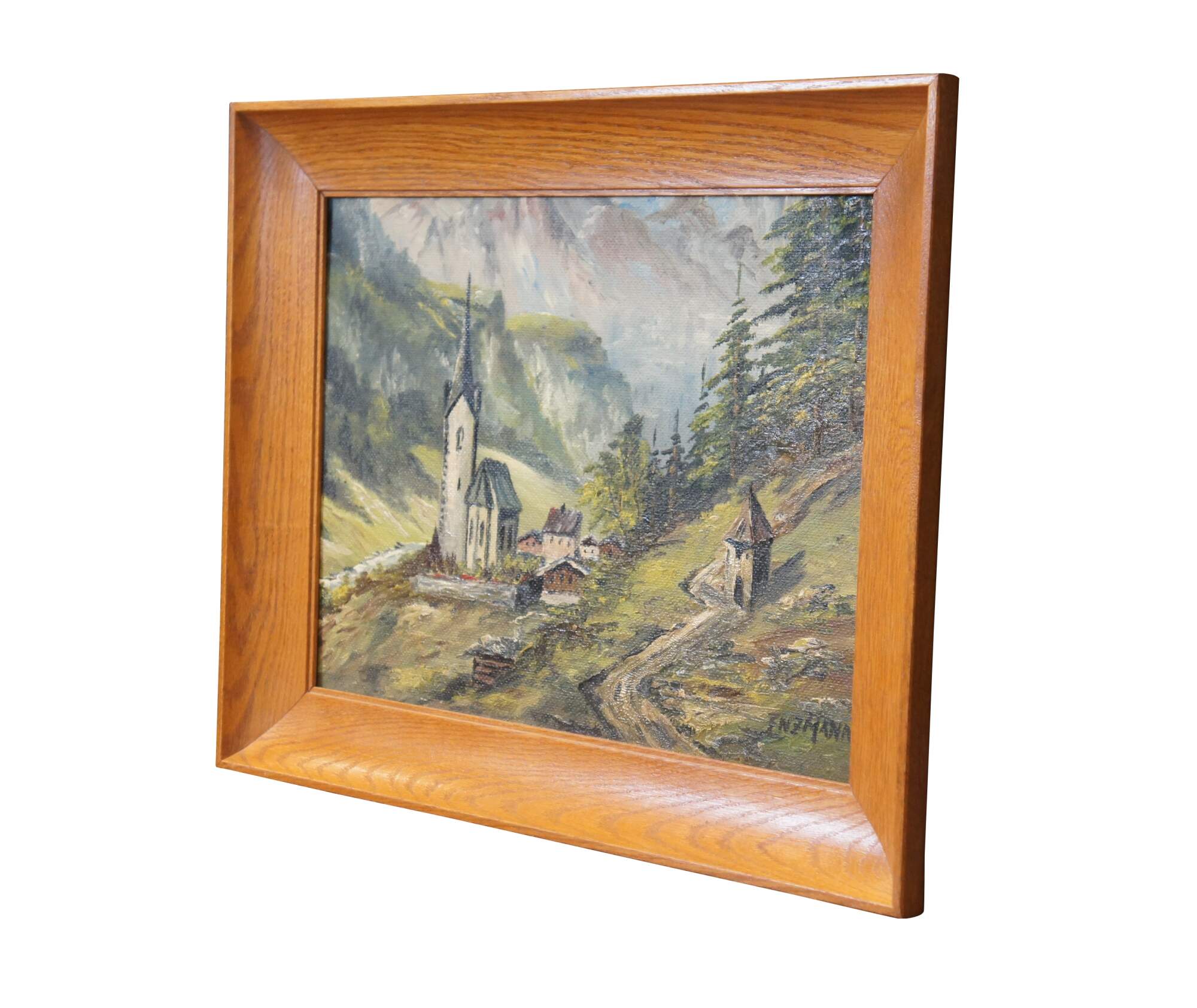Early to mid 20th century oil on board landscape painting depicting a church steeple in a little Alpine mountain village. Signed Enzmann in lower right. Beveled wood frame.