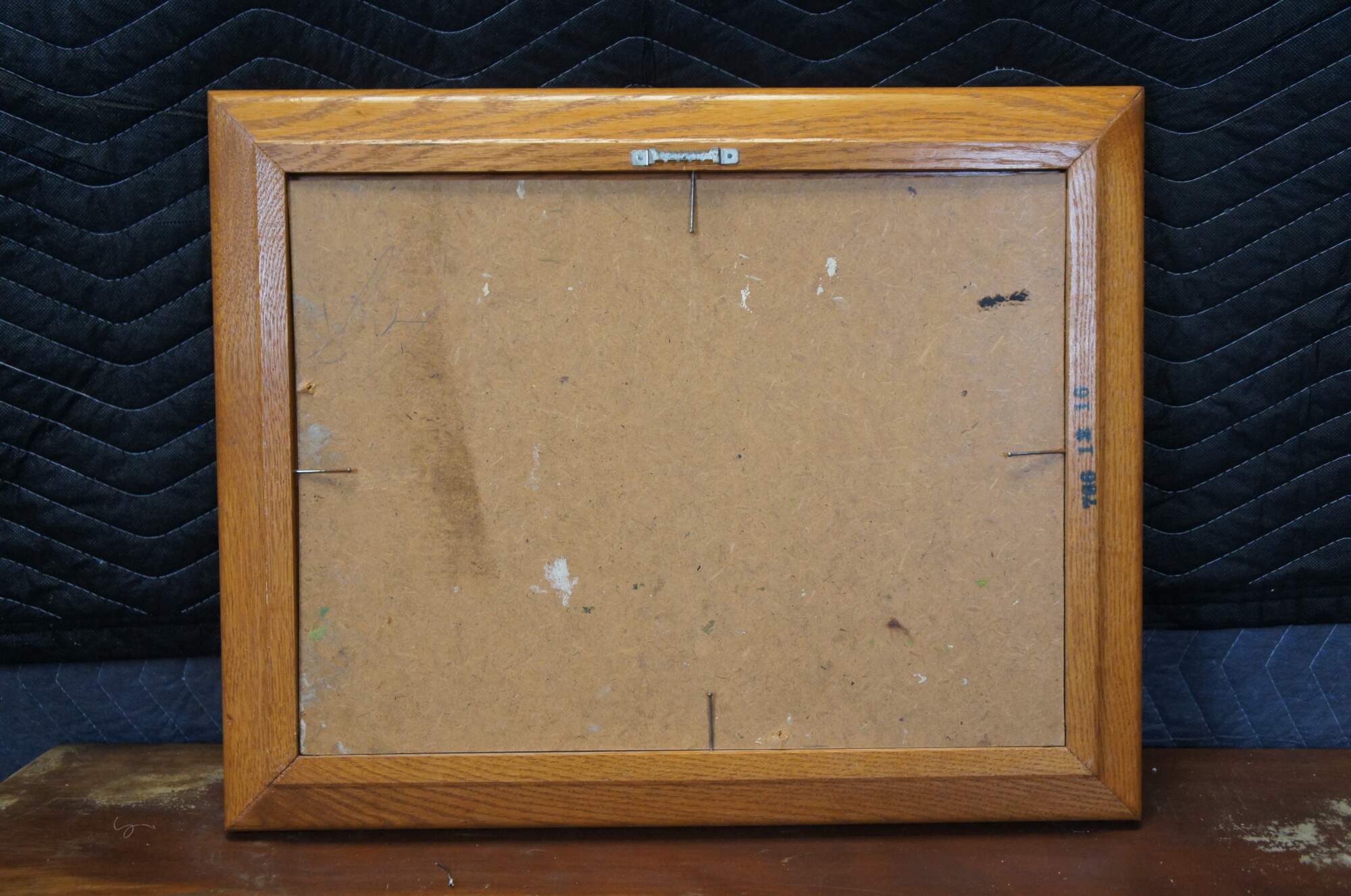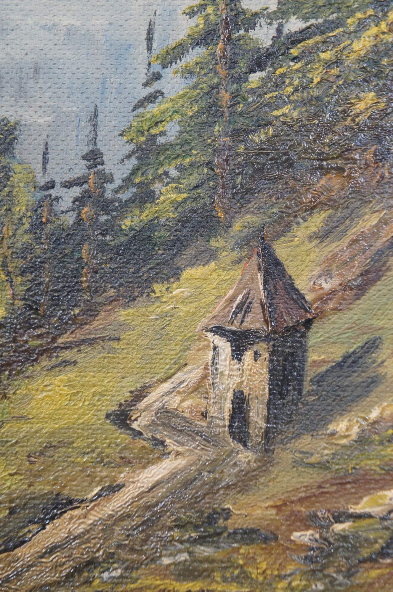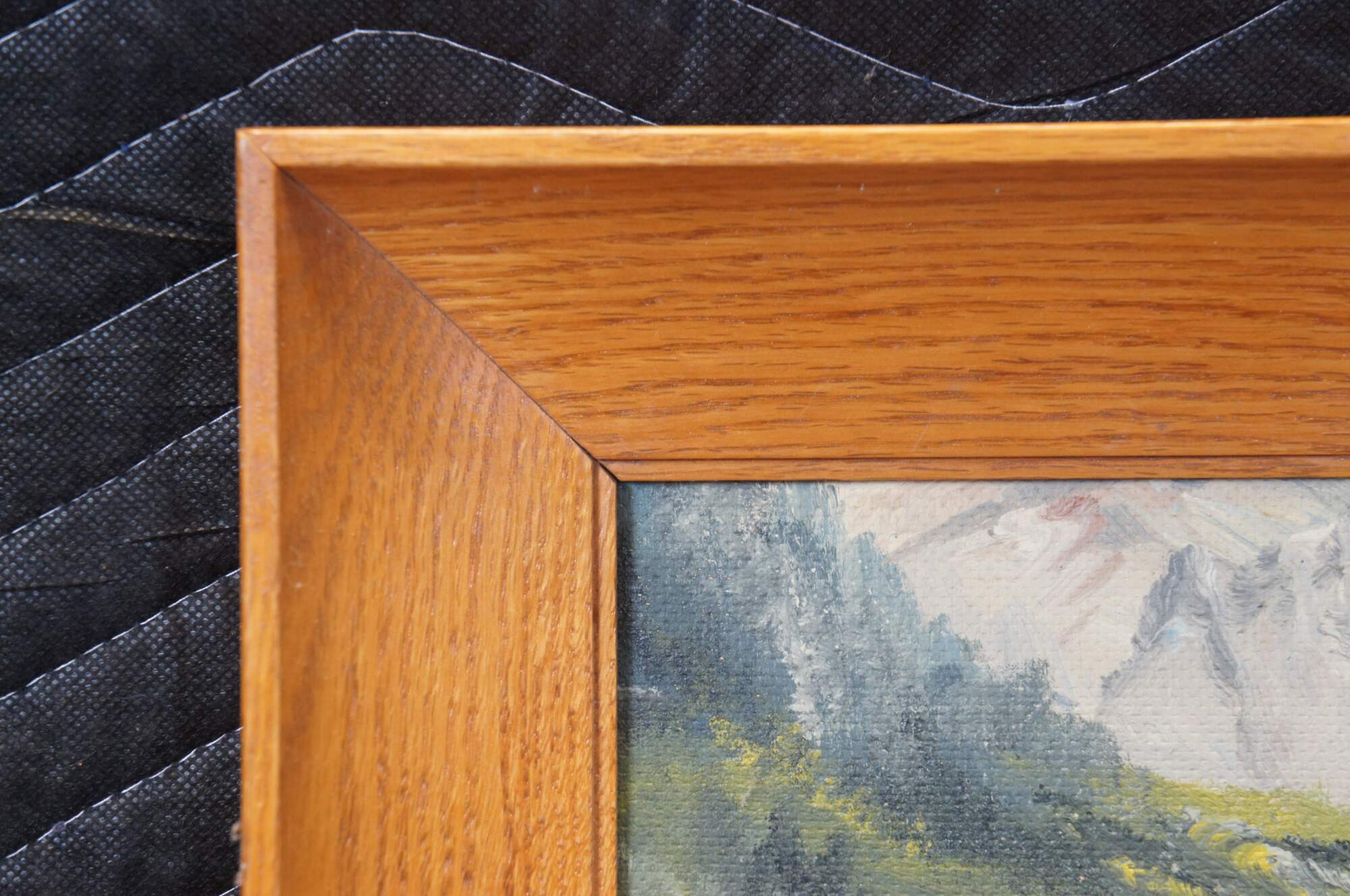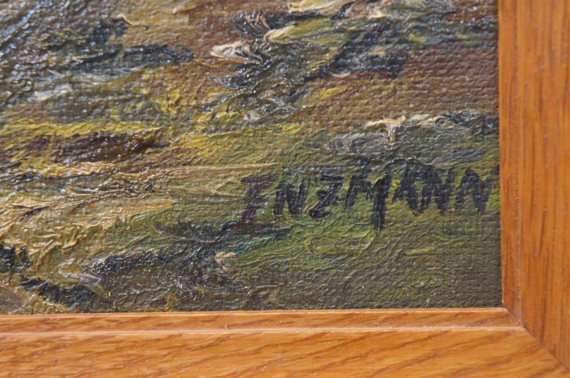 Early to mid 20th century oil on board landscape painting depicting a church steeple in a little Alpine mountain village. Signed Enzmann in lower right. Beveled wood frame.