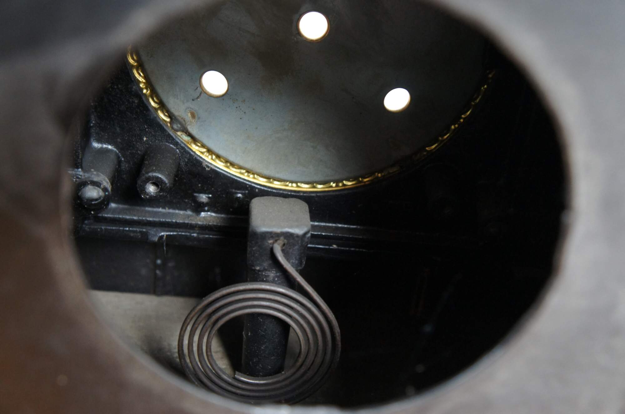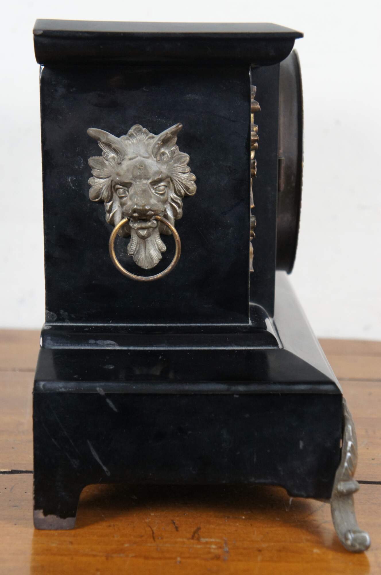 Early 20th century mantel clock case by the New Haven Clock Company. Black enameld cast iron case, rectangular form with footed base and pediment. Cornucopia shaped brass feet on front corners; brass dog / wolf / lion heads with ring handles on each side; floral vines flanking stamped brass frame around face. White face with black Arabic numerals. No movement / hands; case / parts only.