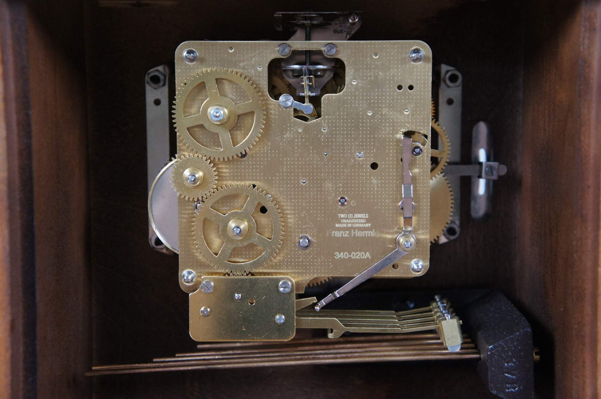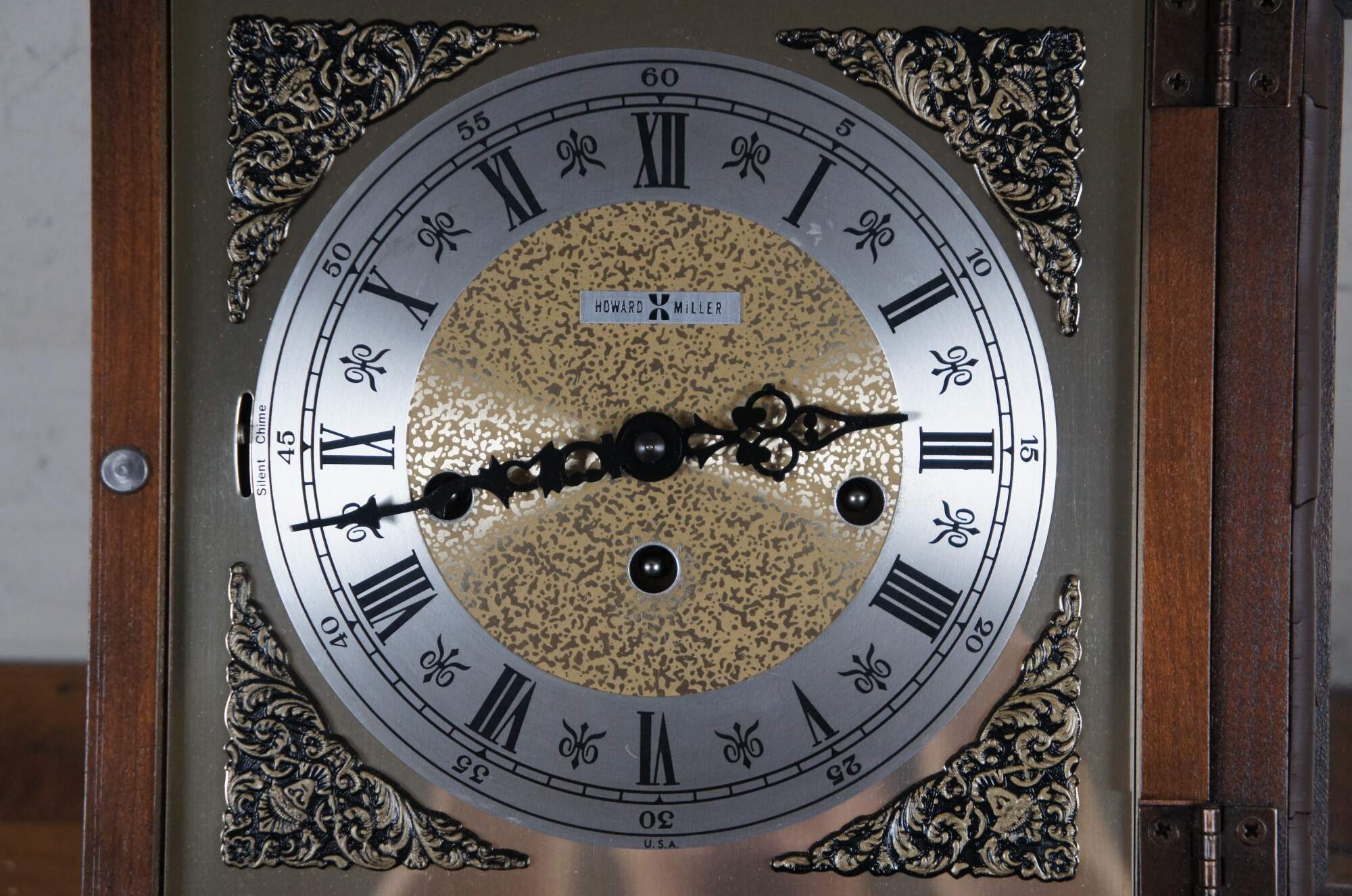 Vintage late 1970's Model 4999, No 141 Westminster Chime Key Wind Movement bracket style mantel clock by Howard Miller Clock Company / Barwick Clock Division. Walnut case with footed base and pediment, topped with brass handle. Silver tone face with black Roman numerals framed with mottled gold tone center, brass foliate / face corners. Plaque on front reads: "C.R. Thomas In Appreciation of 25 Years Service Western Electric 1978." New movement 2003 - Frans Hermle - Two Jewels Unadjusted - Made in Germany - 340-020A.