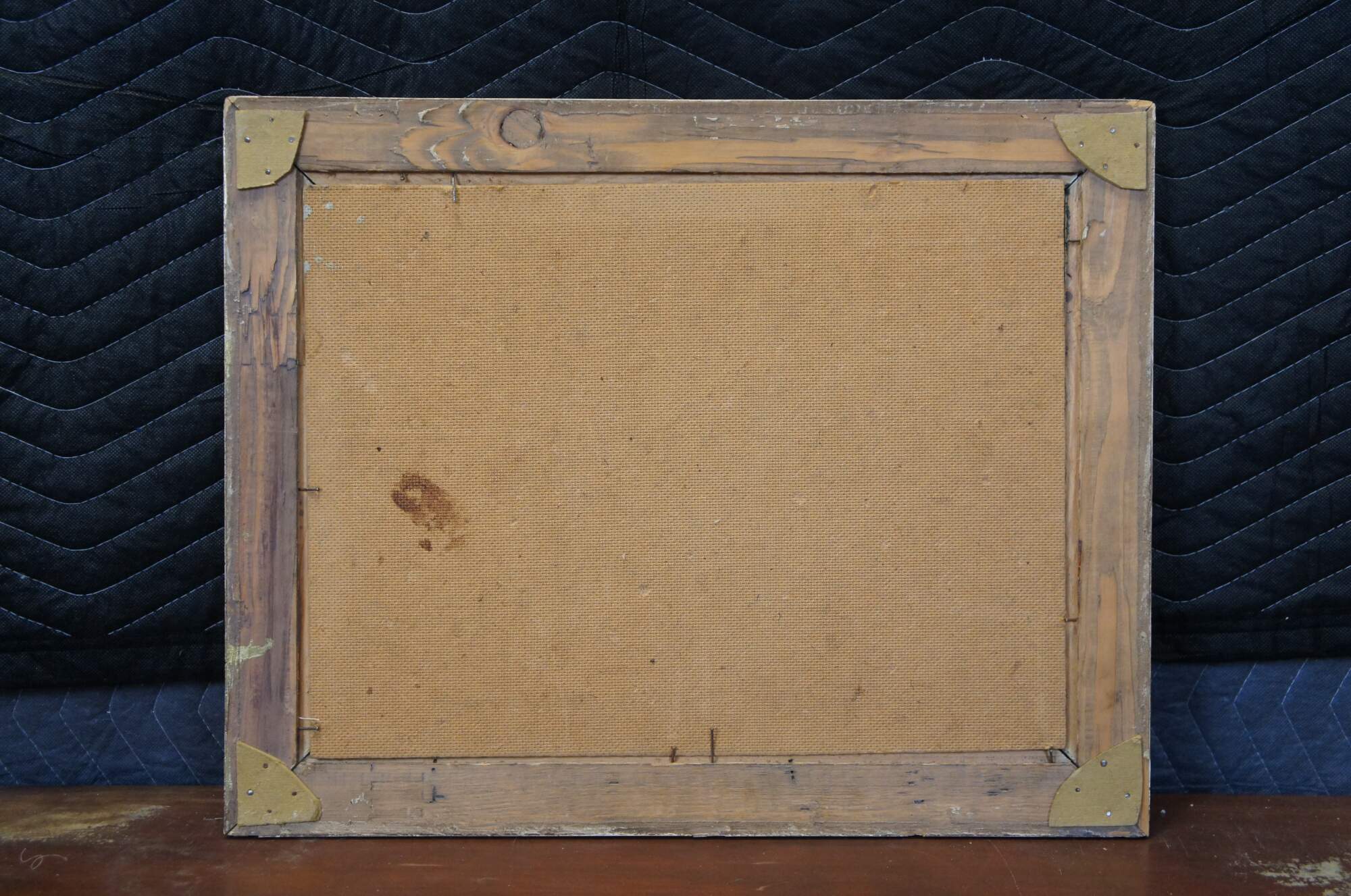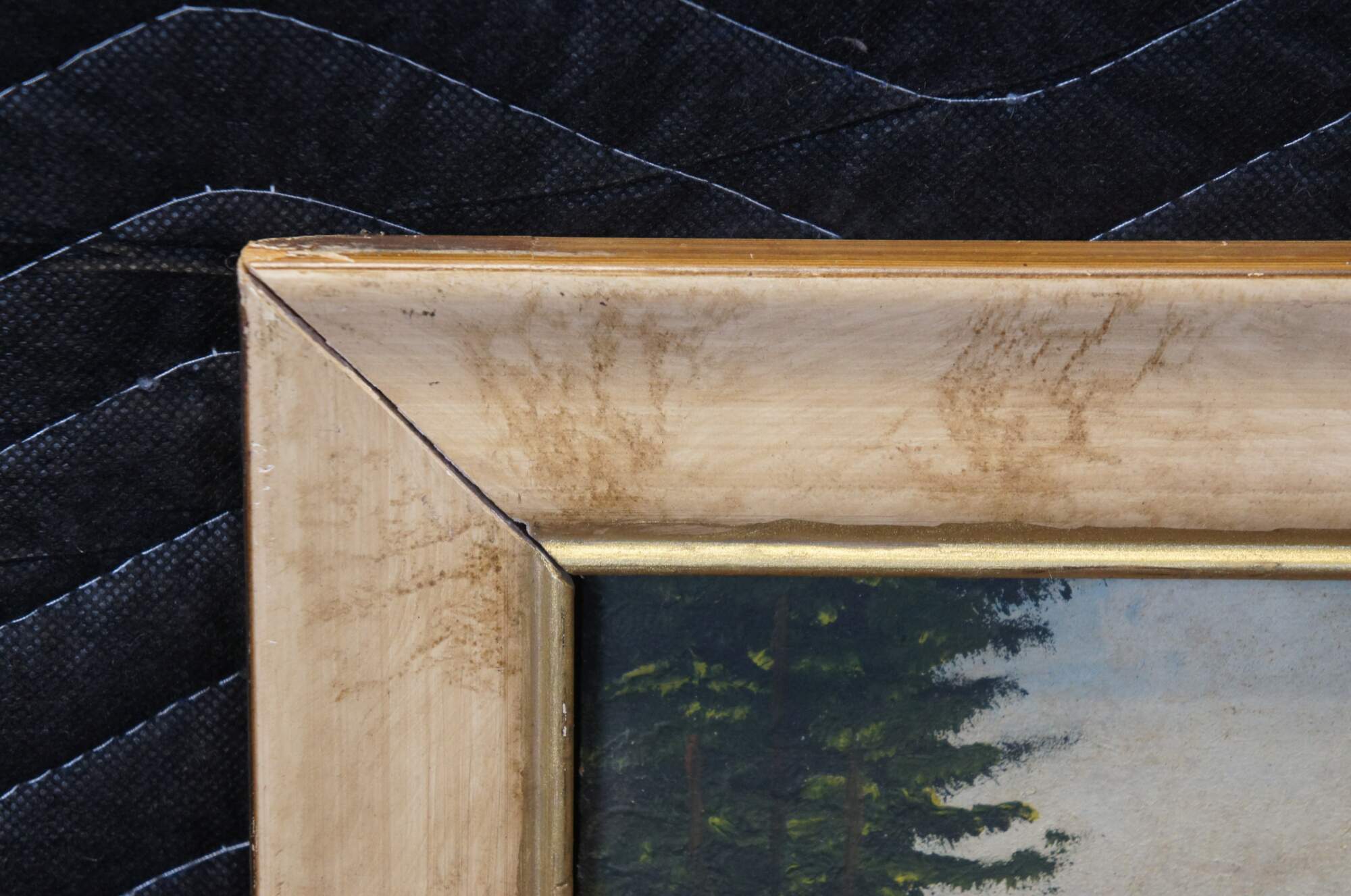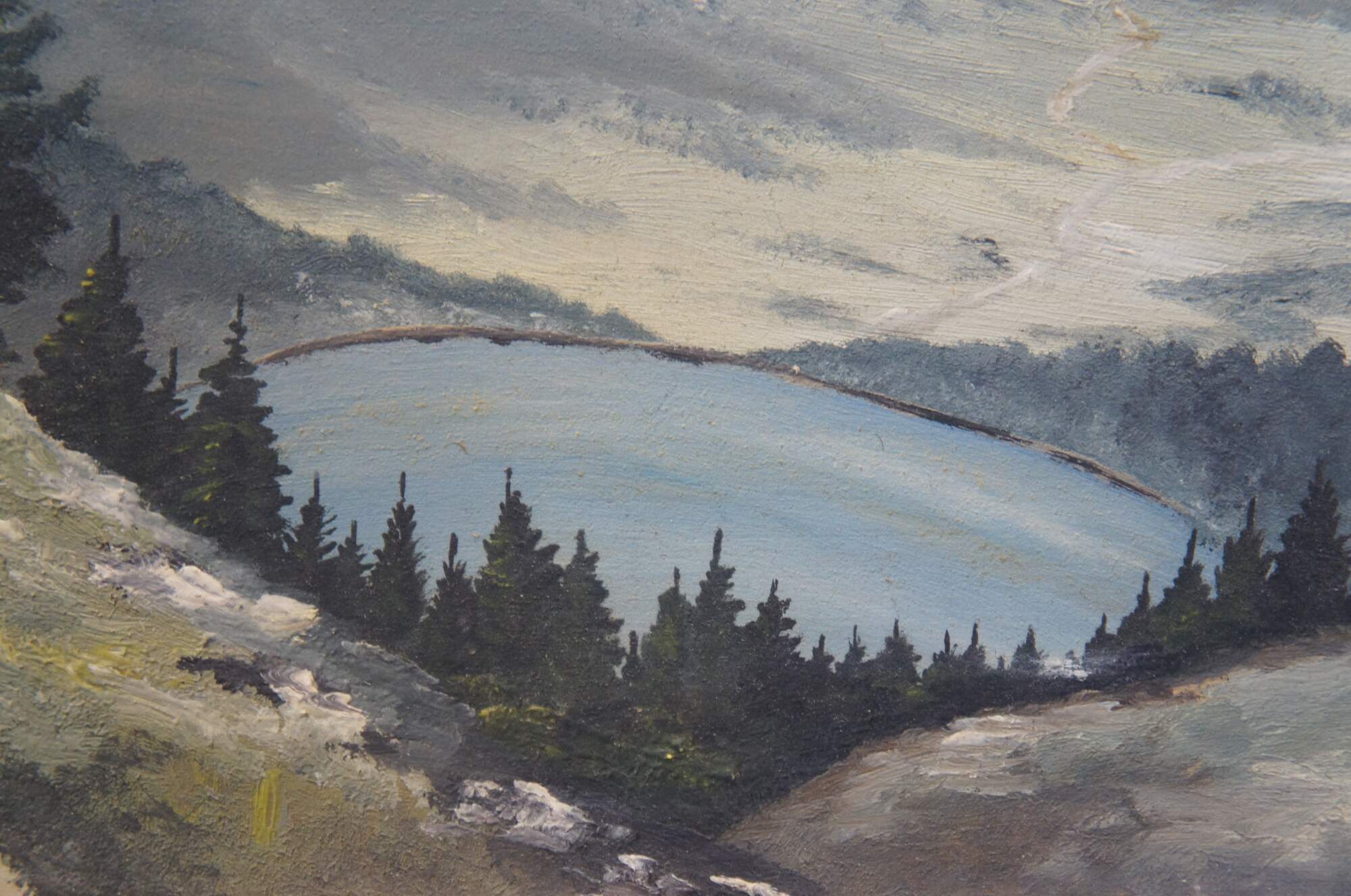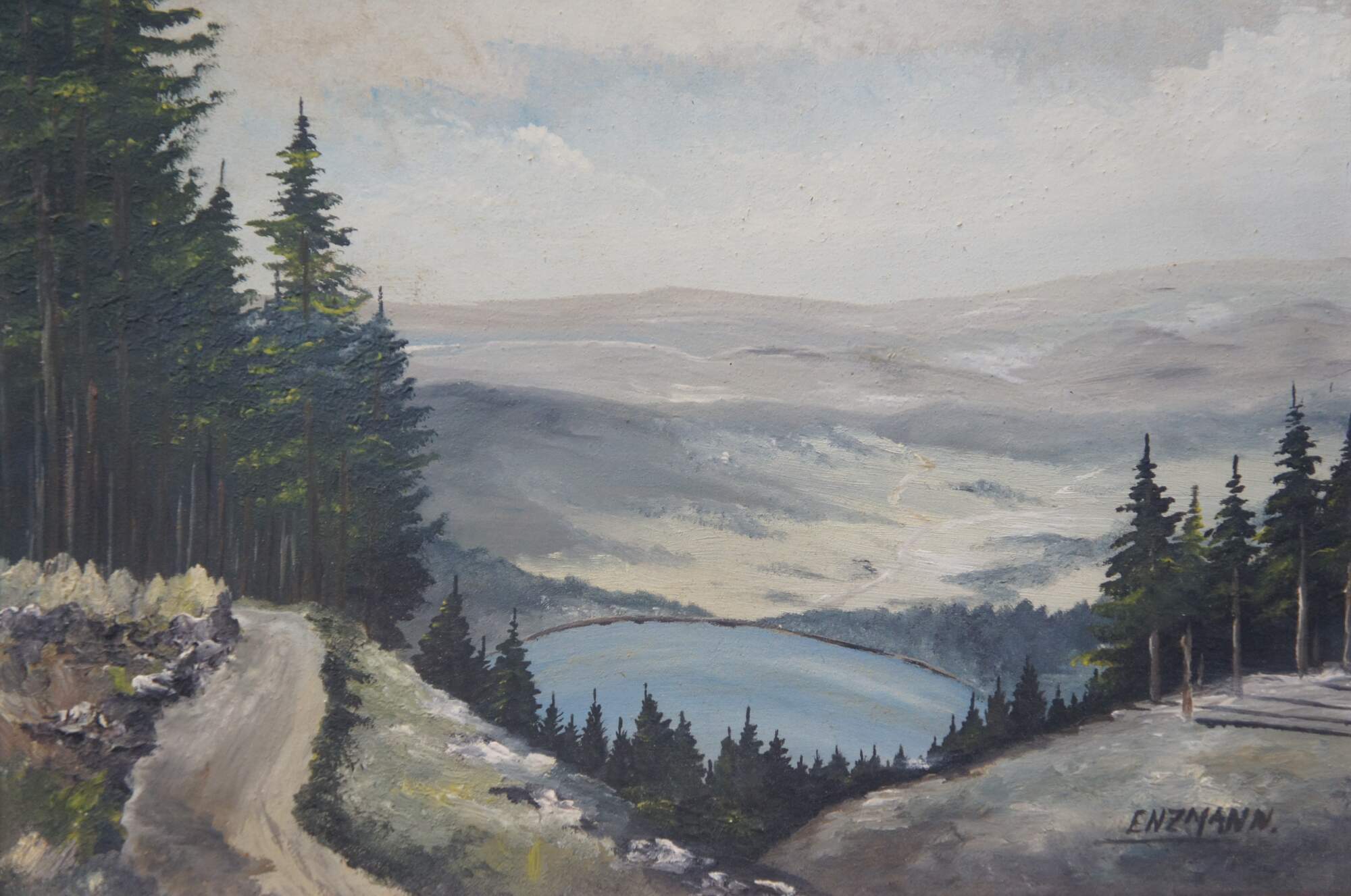 Early to mid 20th century oil on board landscape painting depicting an Apline mountain lake viewed from a pine covered hilltop. Signed Enzmann in lower right - attributed to Eduard Enzmann. Beveled painted wood frame with gold edge.