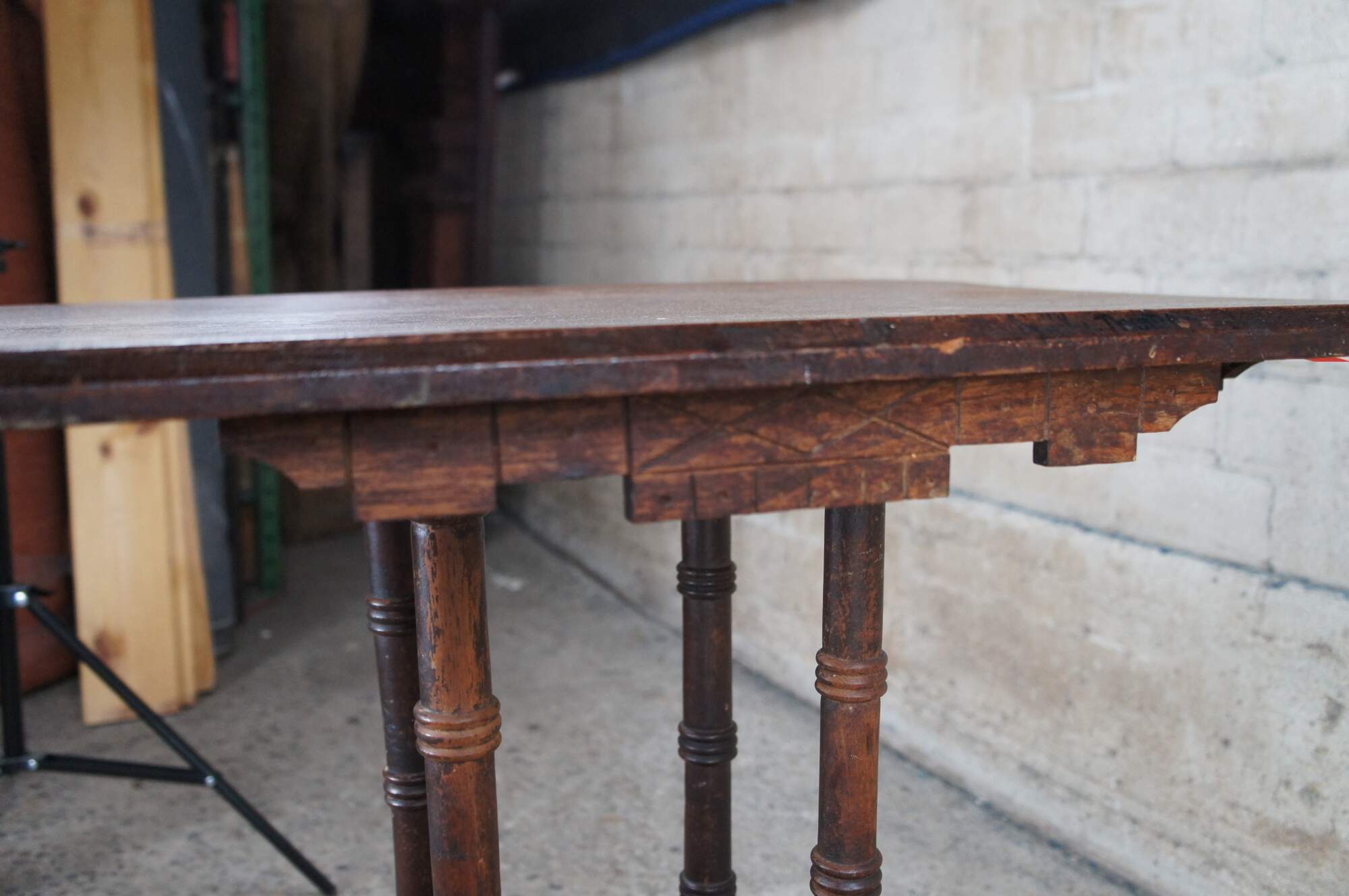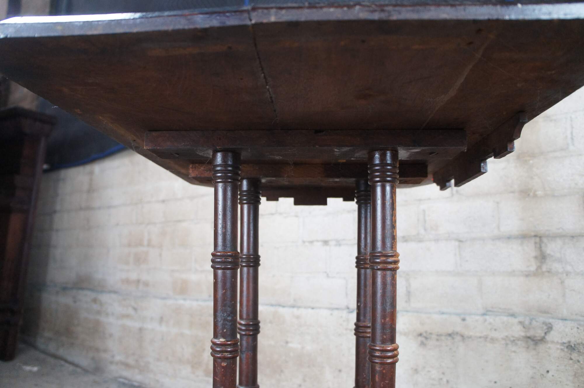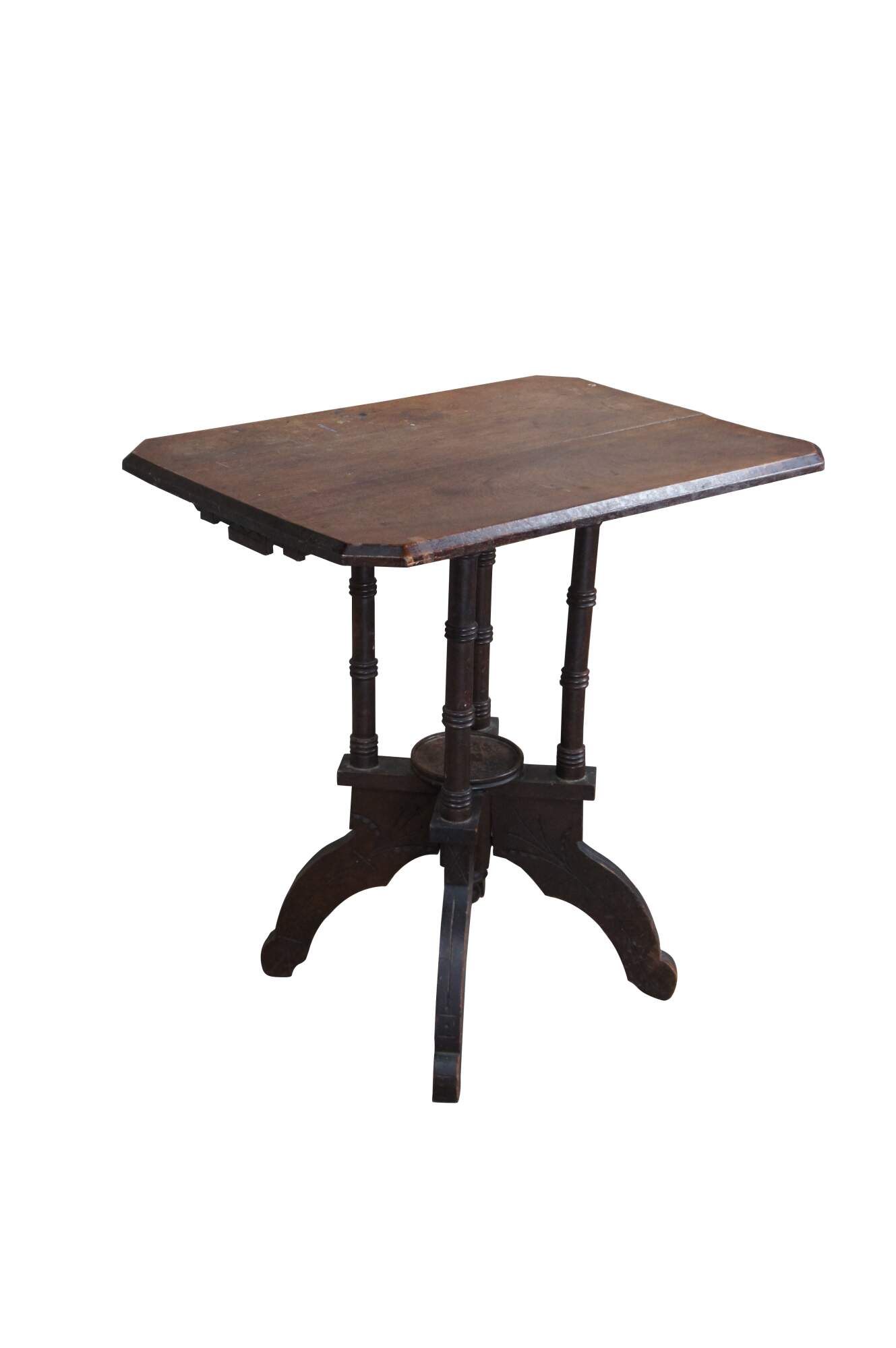 An antique Victorian Era parlor table. Features a walnut finish with a rectangular top over faux bamboo style ribbed supports, a central pedestal for a candle or sculpture and downswept legs centered around a drop finial.