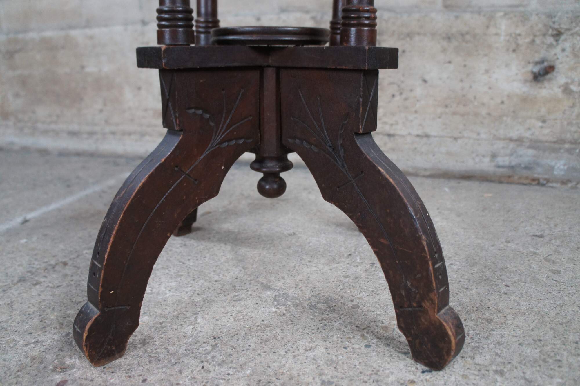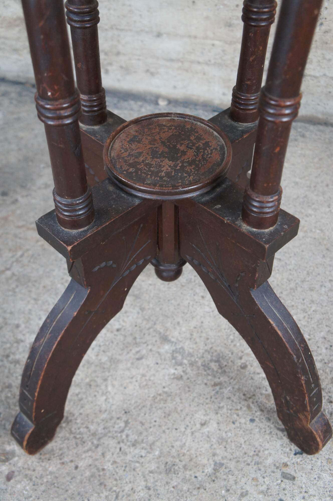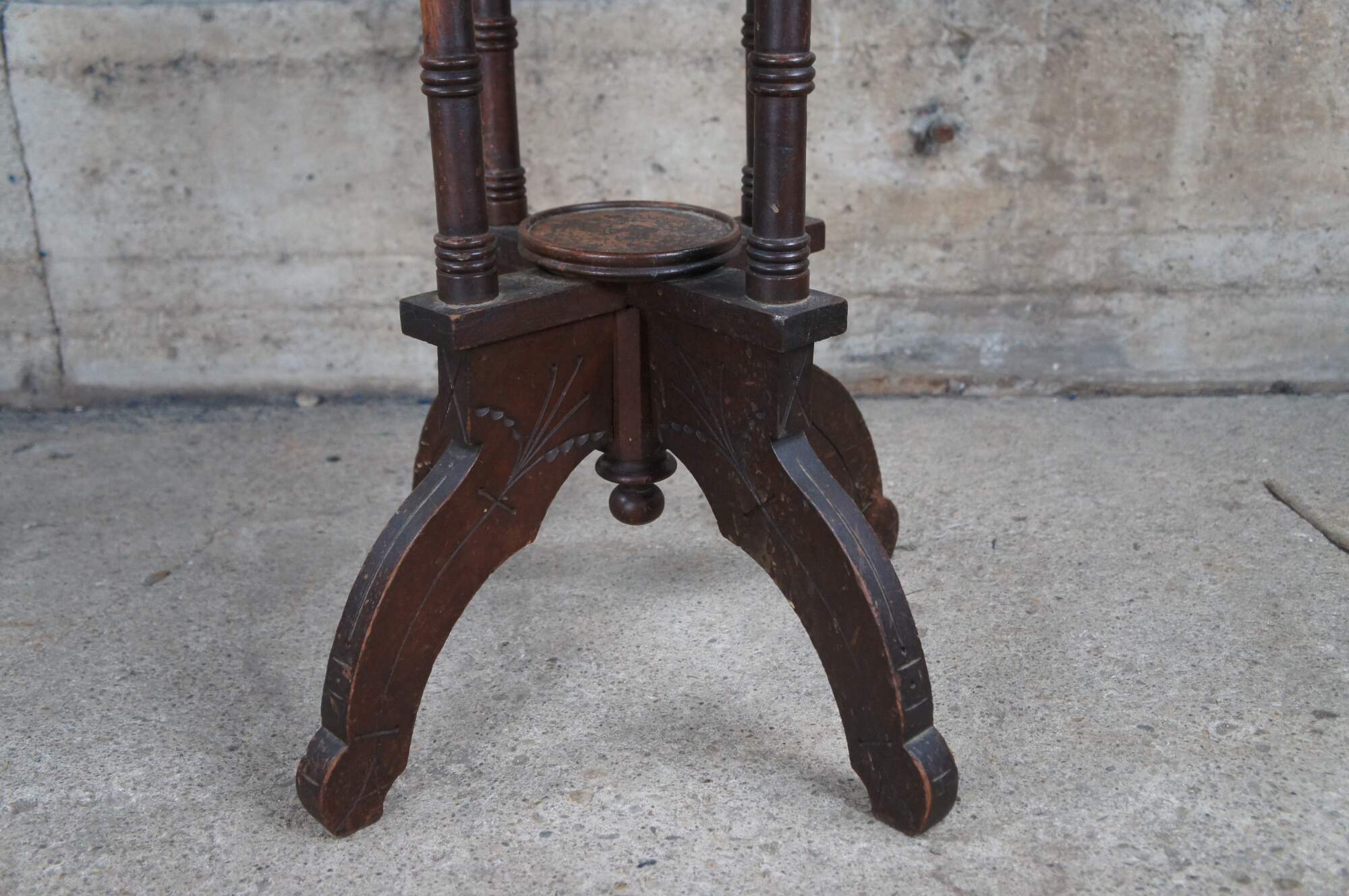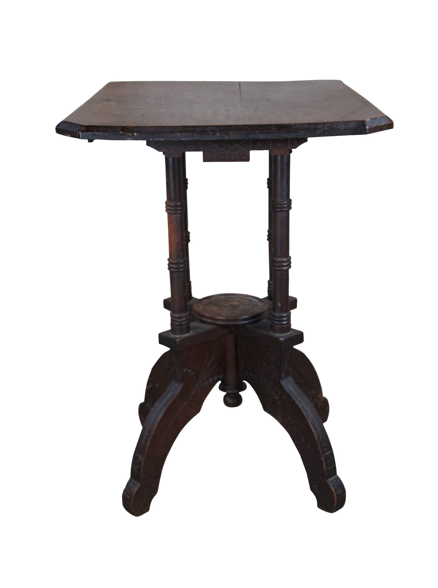 An antique Victorian Era parlor table. Features a walnut finish with a rectangular top over faux bamboo style ribbed supports, a central pedestal for a candle or sculpture and downswept legs centered around a drop finial.