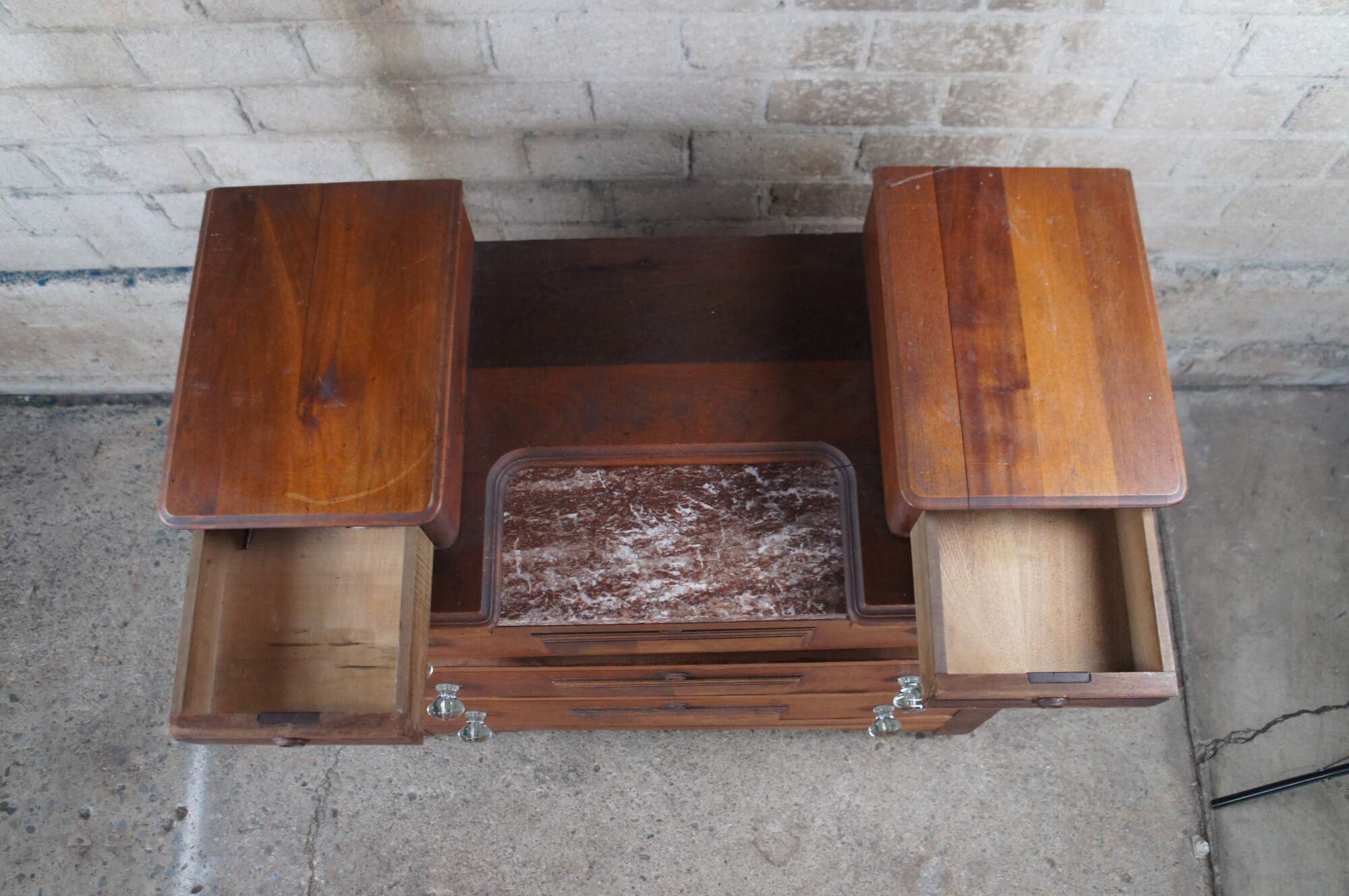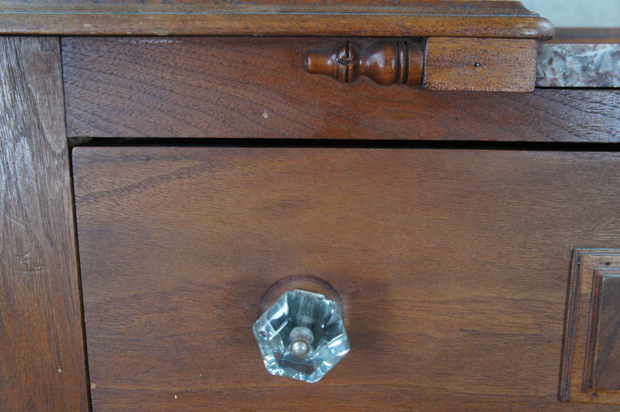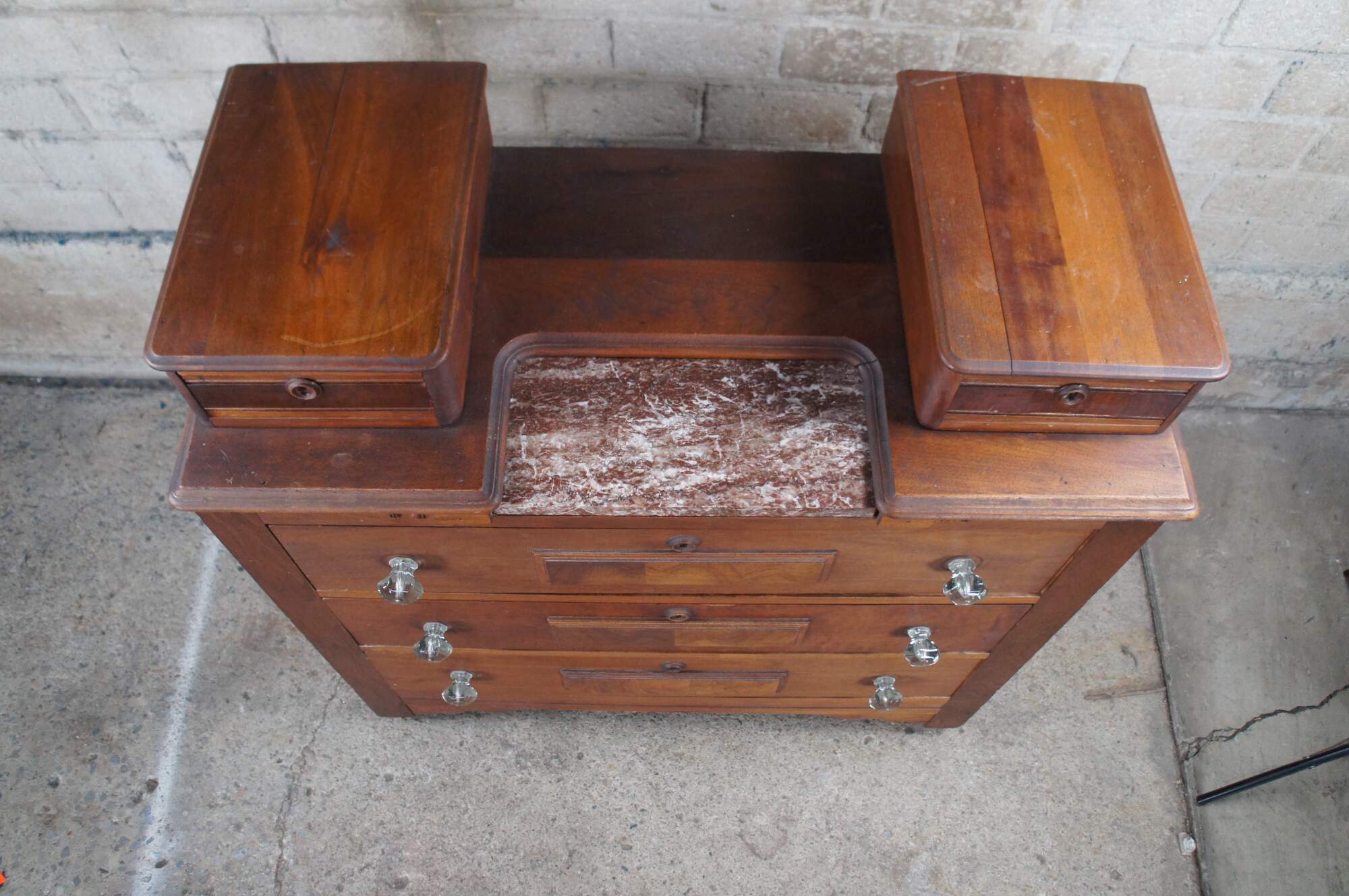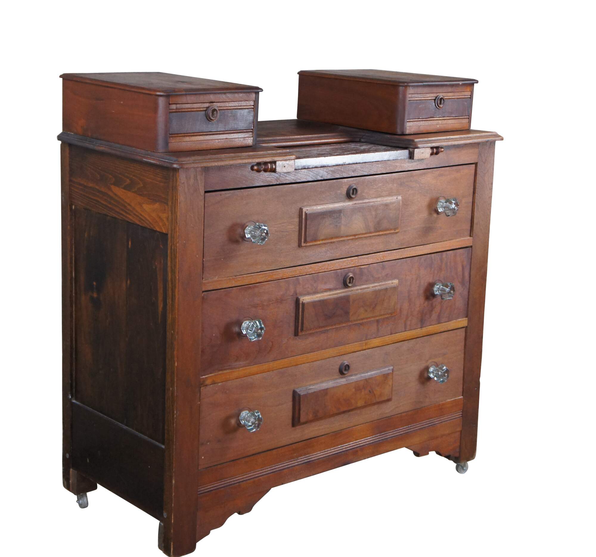Circa 1880s Victorian dresser. Made from walnut with two glovebox drawers flanking a marble insert and three larger lower hand dovetailed drawers with paneled trim, glass knob pulls, wooden key hole escutcheons, over castors.