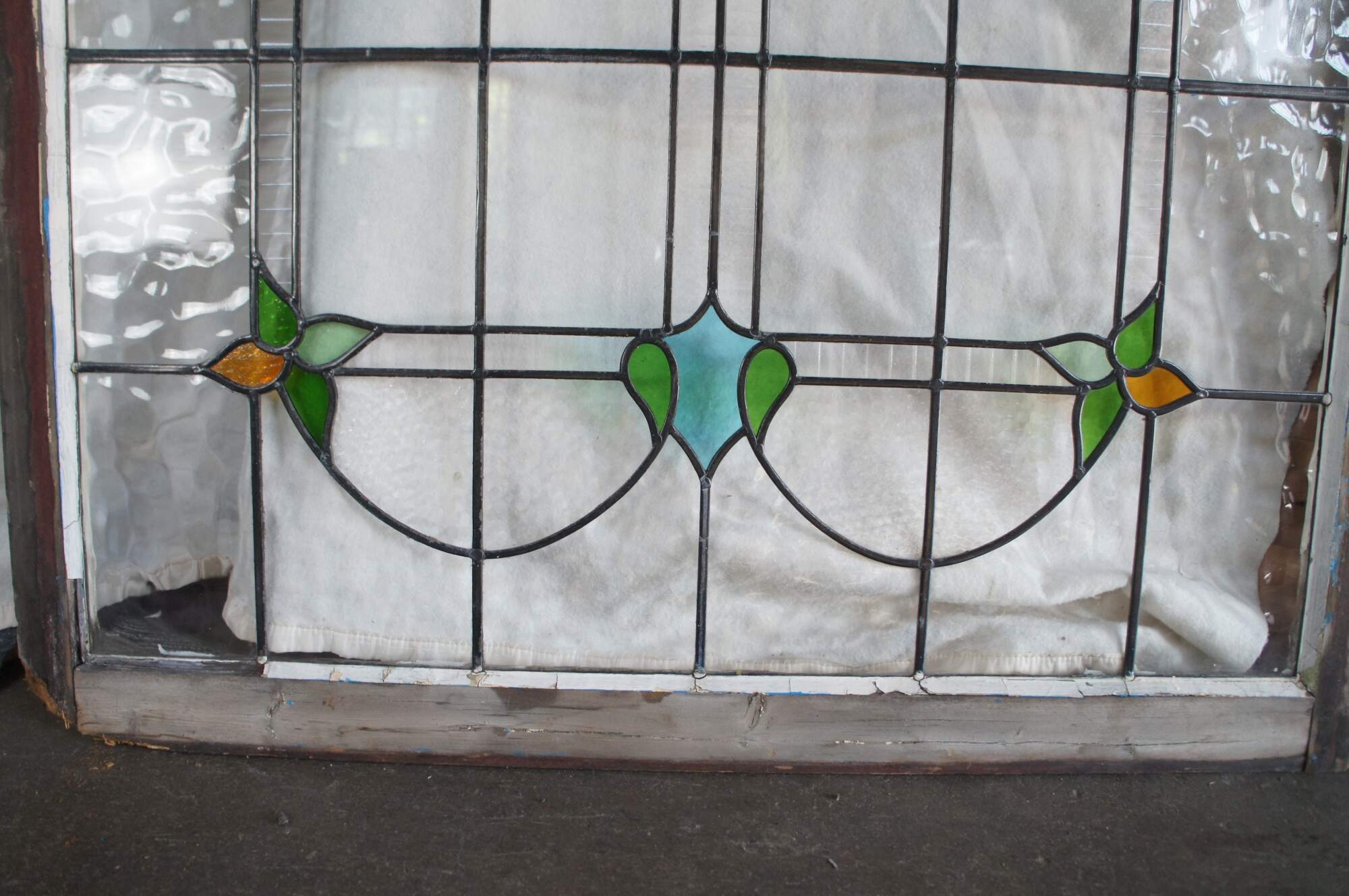 An exquisite pair of 19th century leaded stained glass windows. Features a large rectangular frame with arched area beneath a transom that opens via hinge to allow fresh air in. Each window is designed with clear, pebbled and textured glass set around ornate floral designs showcasing colors of blue, green, amber and purple. The glass is set within large original pine frames. A monumental set that will make for the perfect addition to any space.