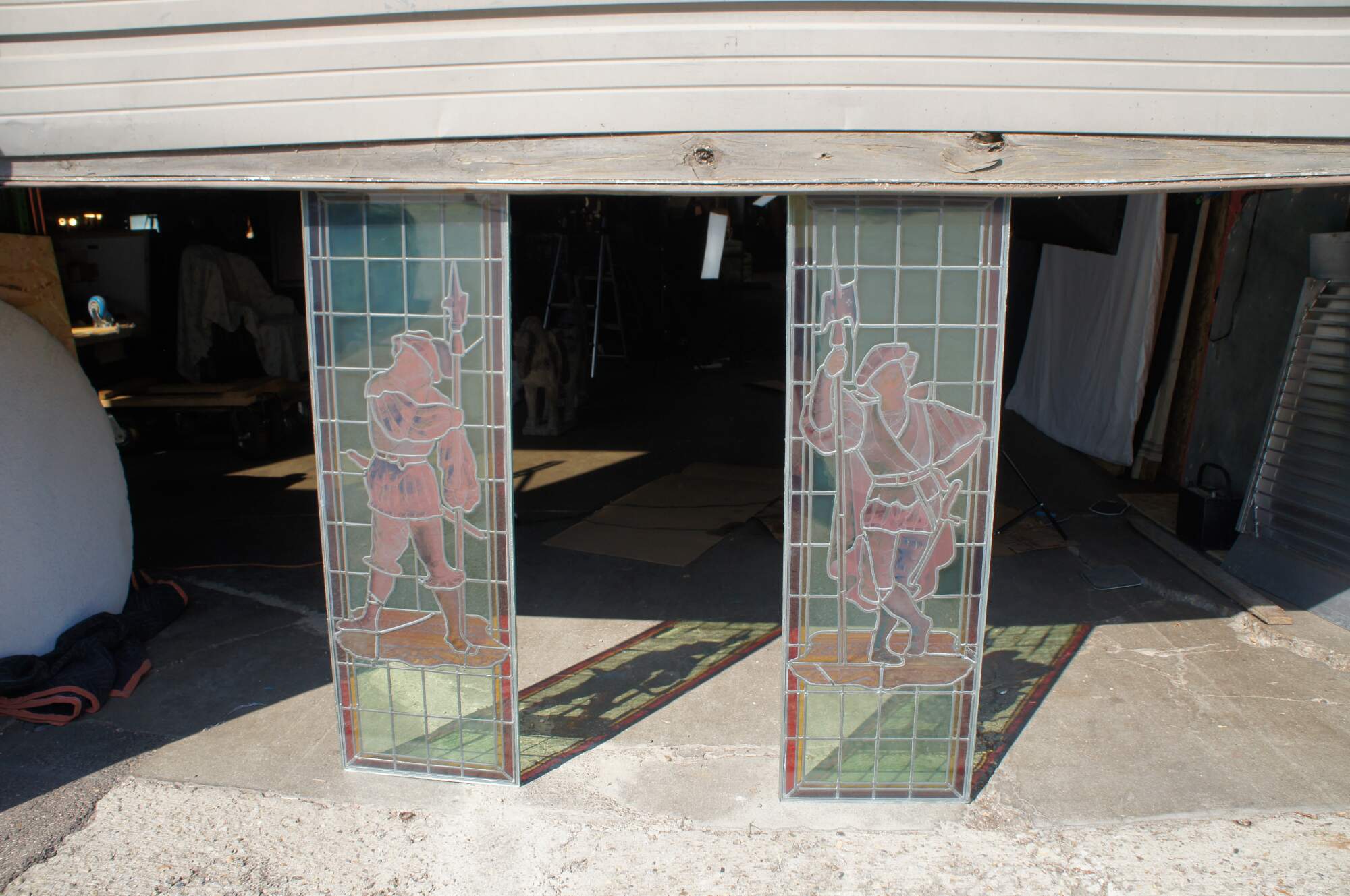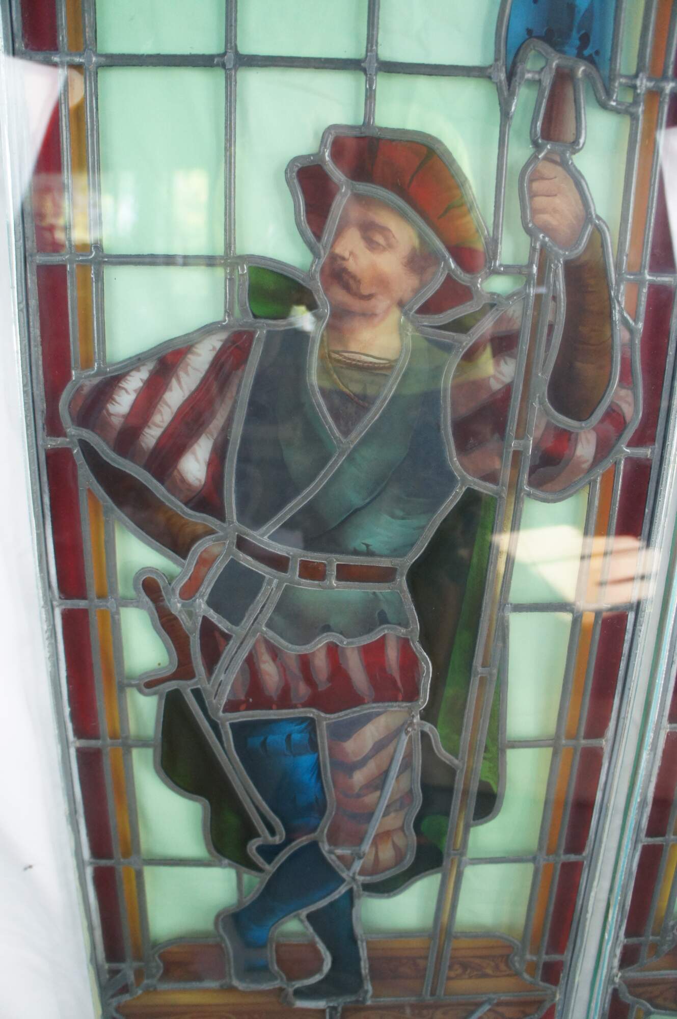 An impressive Pair of stained glass windows of the highest quality, painted with grisaille and enamels on cathedral glass, circa 19th century. Representing two Renaissance Halberdiers or Swiss Guards in colorful attire with swords along their waistline. Each is set in the middle of a tinted lattice background, framed in amber and red stained glass. The windows were fully restored by one of the best restorations specialist in the united stated around 1980. Each is sandwiched between two tempered glass panels for protection. Great for hanging within an existing space, or re-purposed for use in doors.