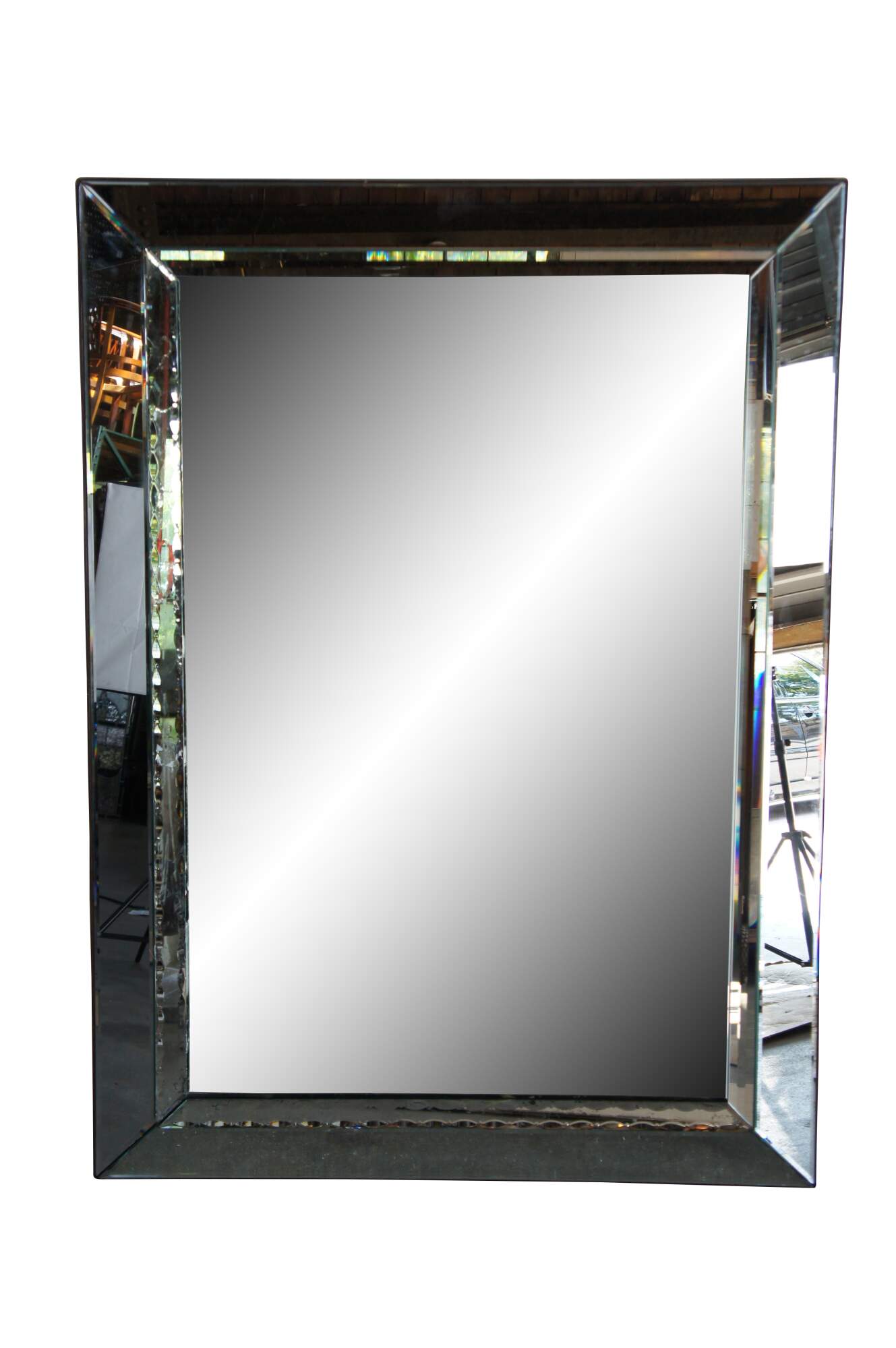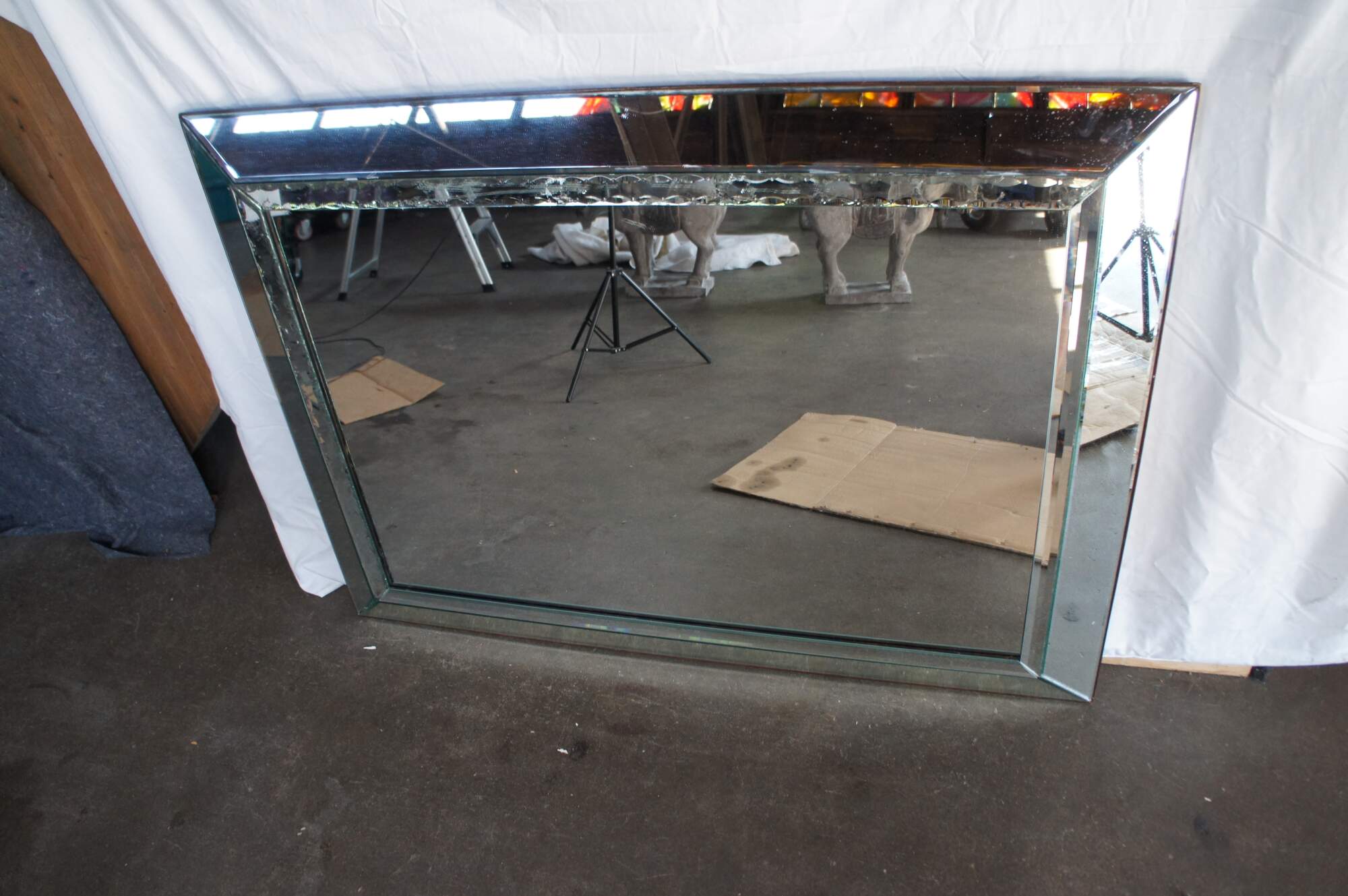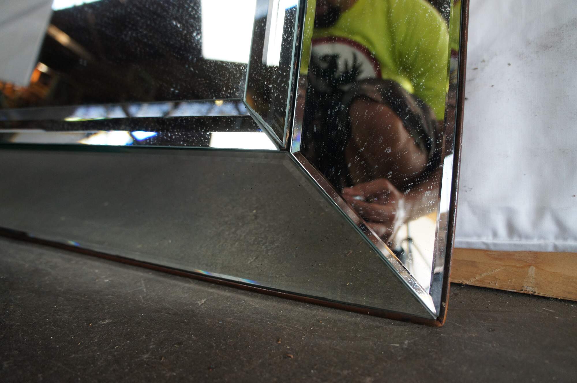 1970s Vintage Venetian style mirror. Features a beveled frame with cut glass accents. Great for use over a mantel, as a vanity or along a wall.