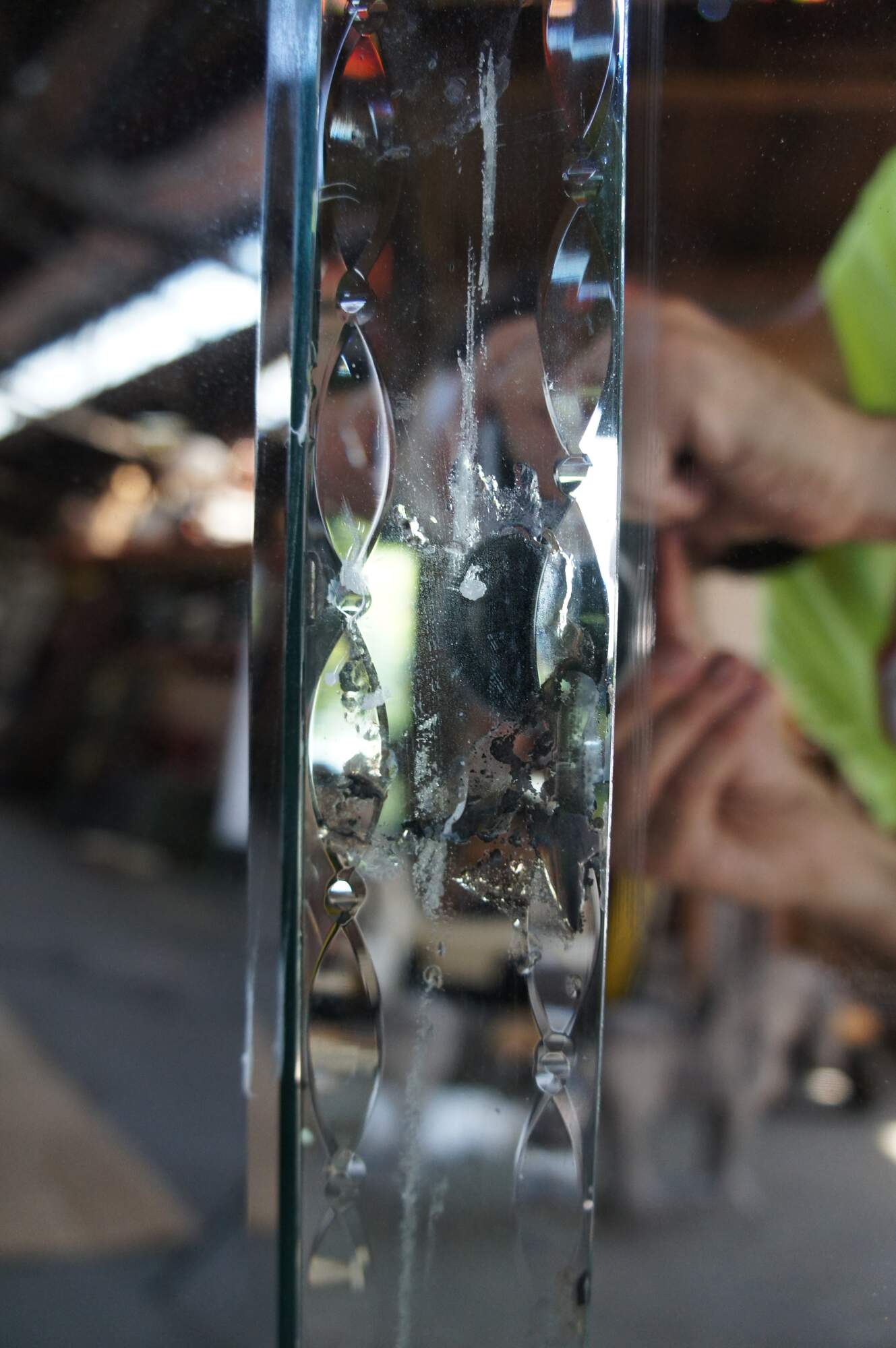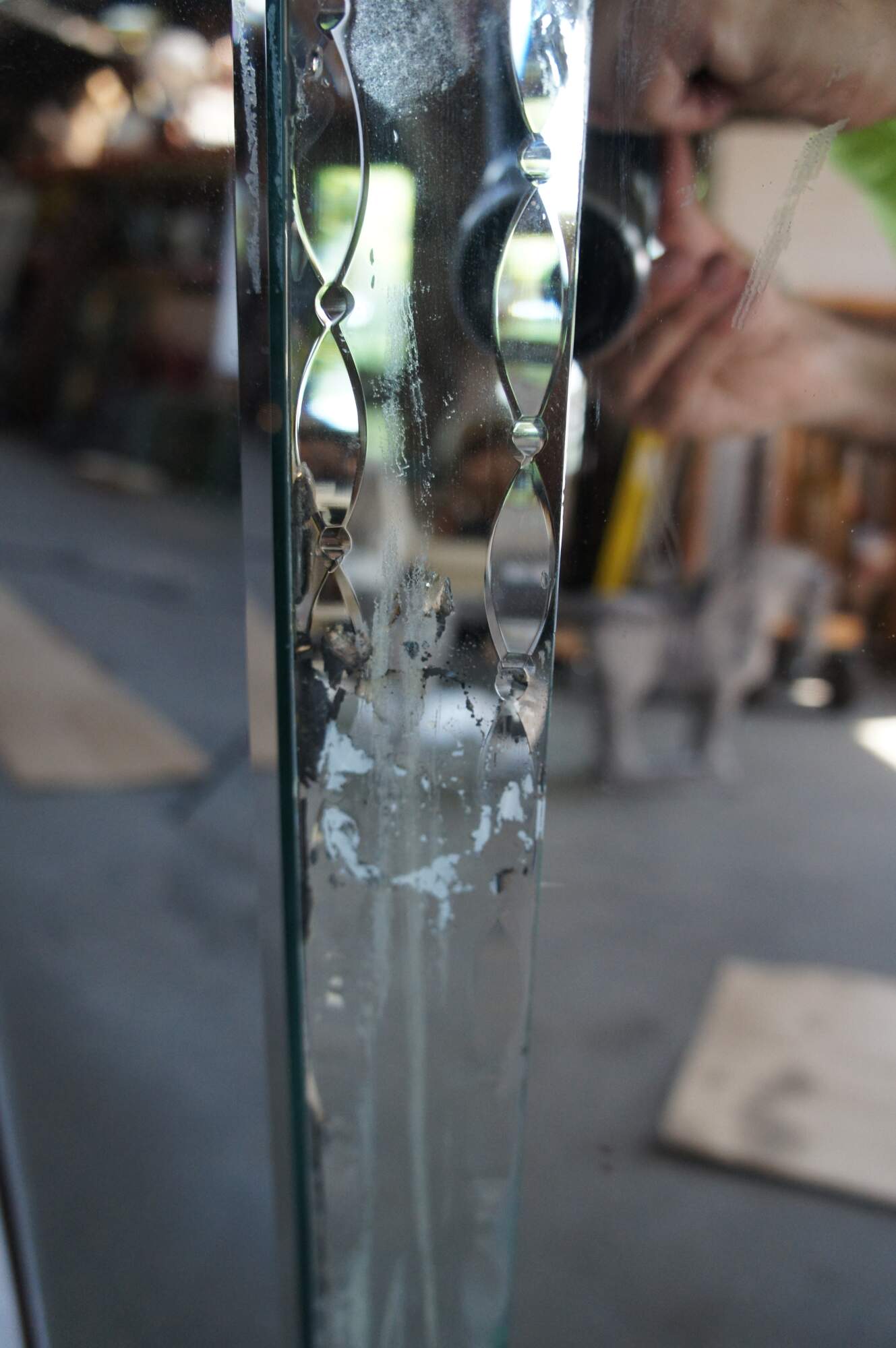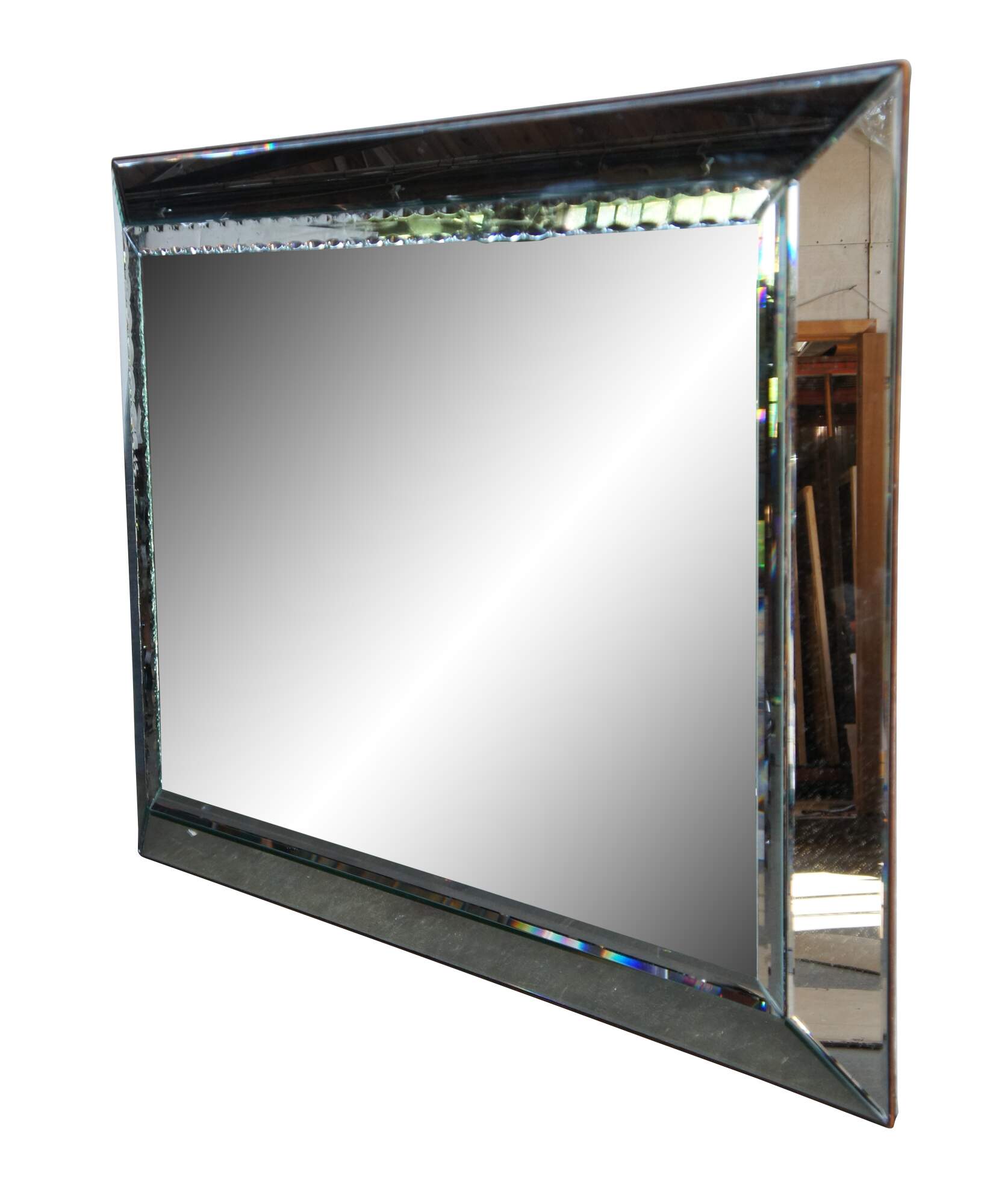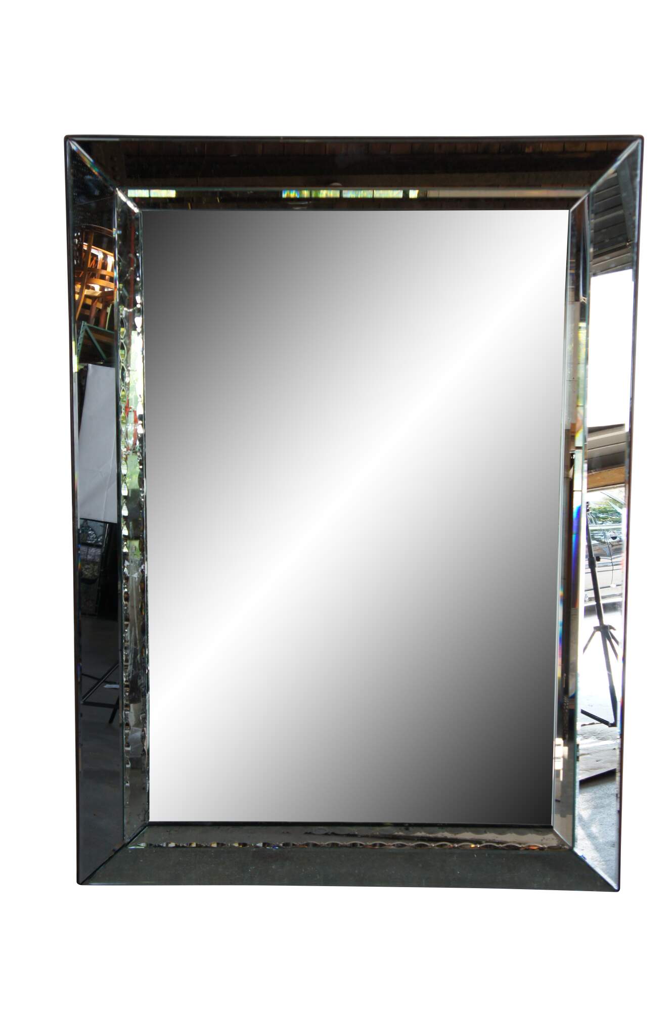 1970s Vintage Venetian style mirror. Features a beveled frame with cut glass accents. Great for use over a mantel, as a vanity or along a wall.
