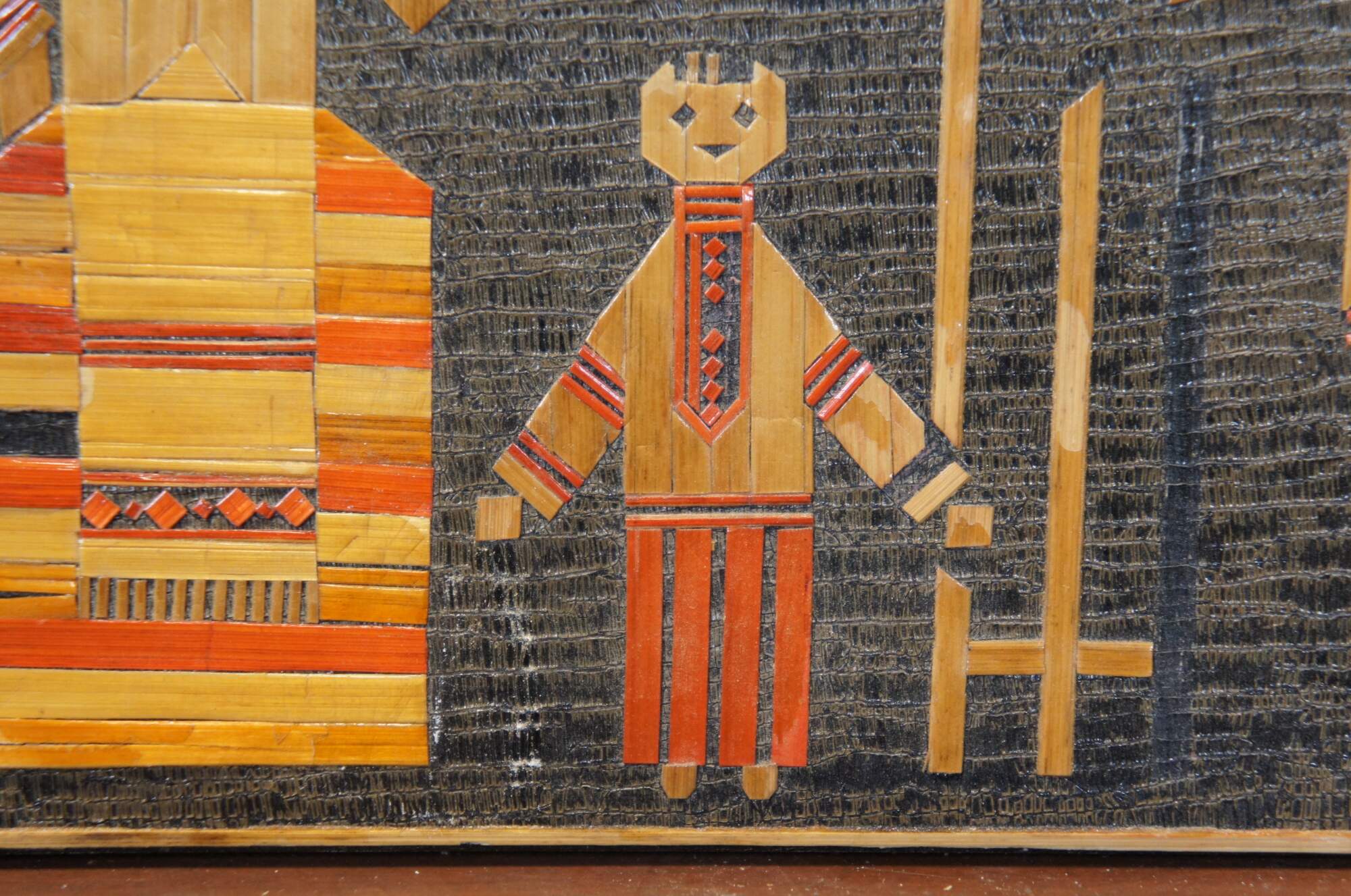 Vintage Russian folk art wall plaque titled "Housewarming," featuring a black painted wood background on which is laid a marquetry style scene of a family standing under a tree beside their farm / cottage, done in cut pieces of plain and colored straw. USSR - Factory of Art, Inlaying, Zholbin - Product Name Panel "Housewarming" - Item MMIT-50 - Work Order 22/44693 - Zak. 339