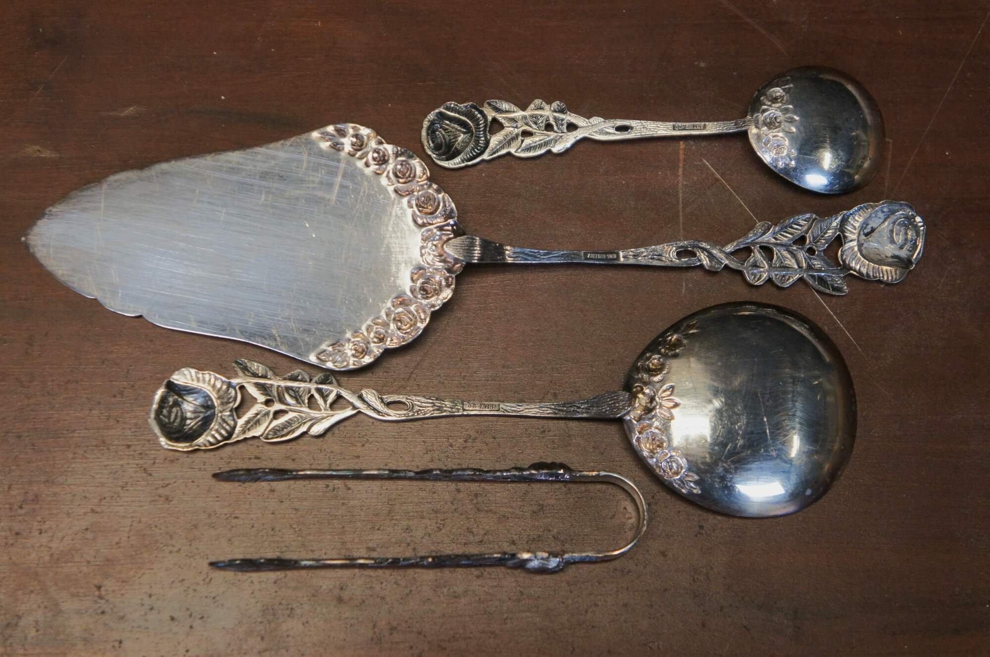 Vintage set of four Antiko 100 silverplated serving pieces in the Hildesheimer Rose pattern. Includes cake server, two spoons, and tongs. Includes original boxes. Originally purchaces at Hambach-Kalb, Fulda.