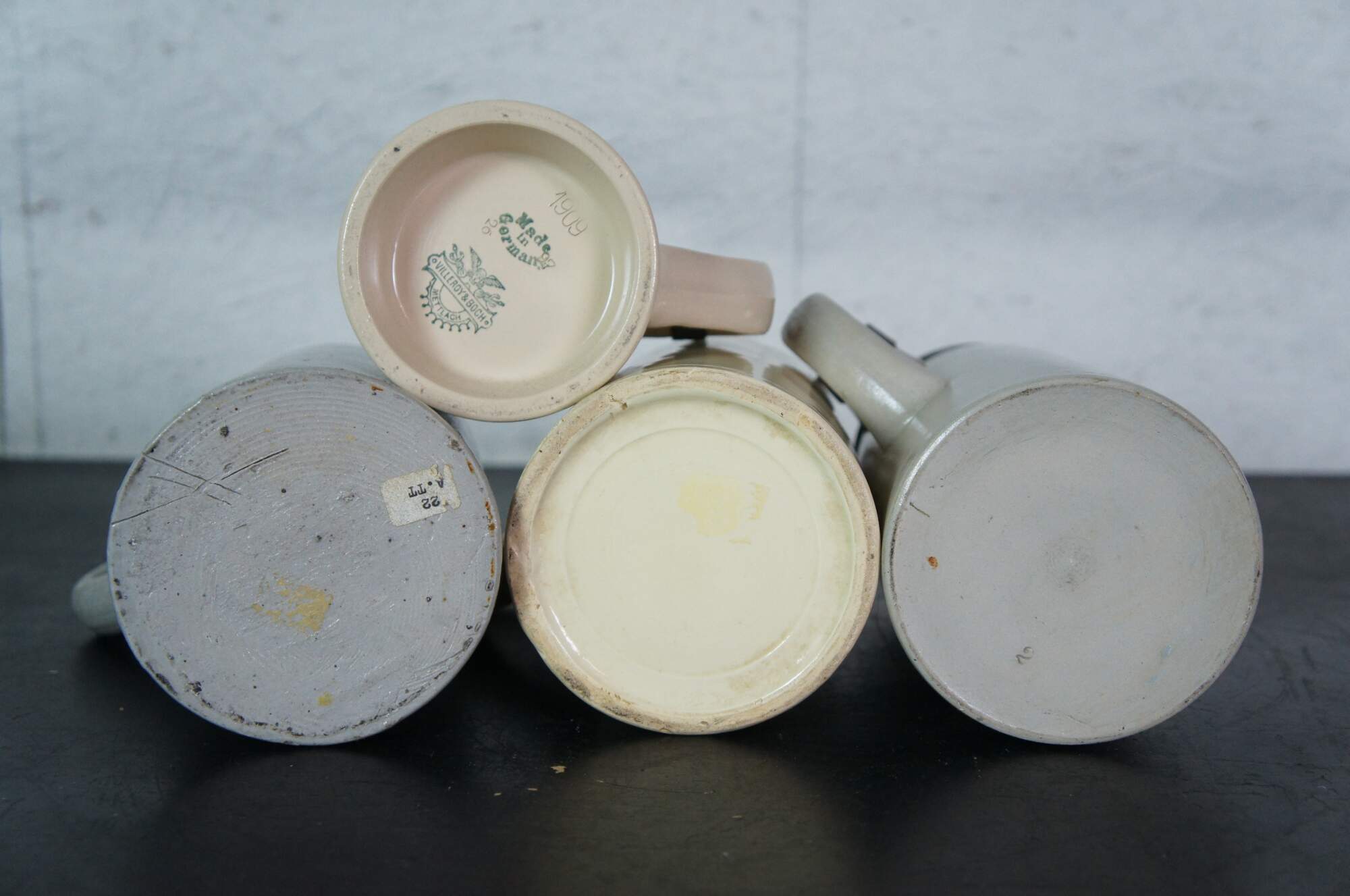 Set of four 20th century plain German stoneware / ceramic / salt glaze / stoneware Mettlach beer steins with tin flip top lids. Smallest capacity, 3/10 Liter. All others capacity, 1 Liter. One by Villeroy & Boch - Made in Germany - 1909. One features a painted porcelain inlay on lid.