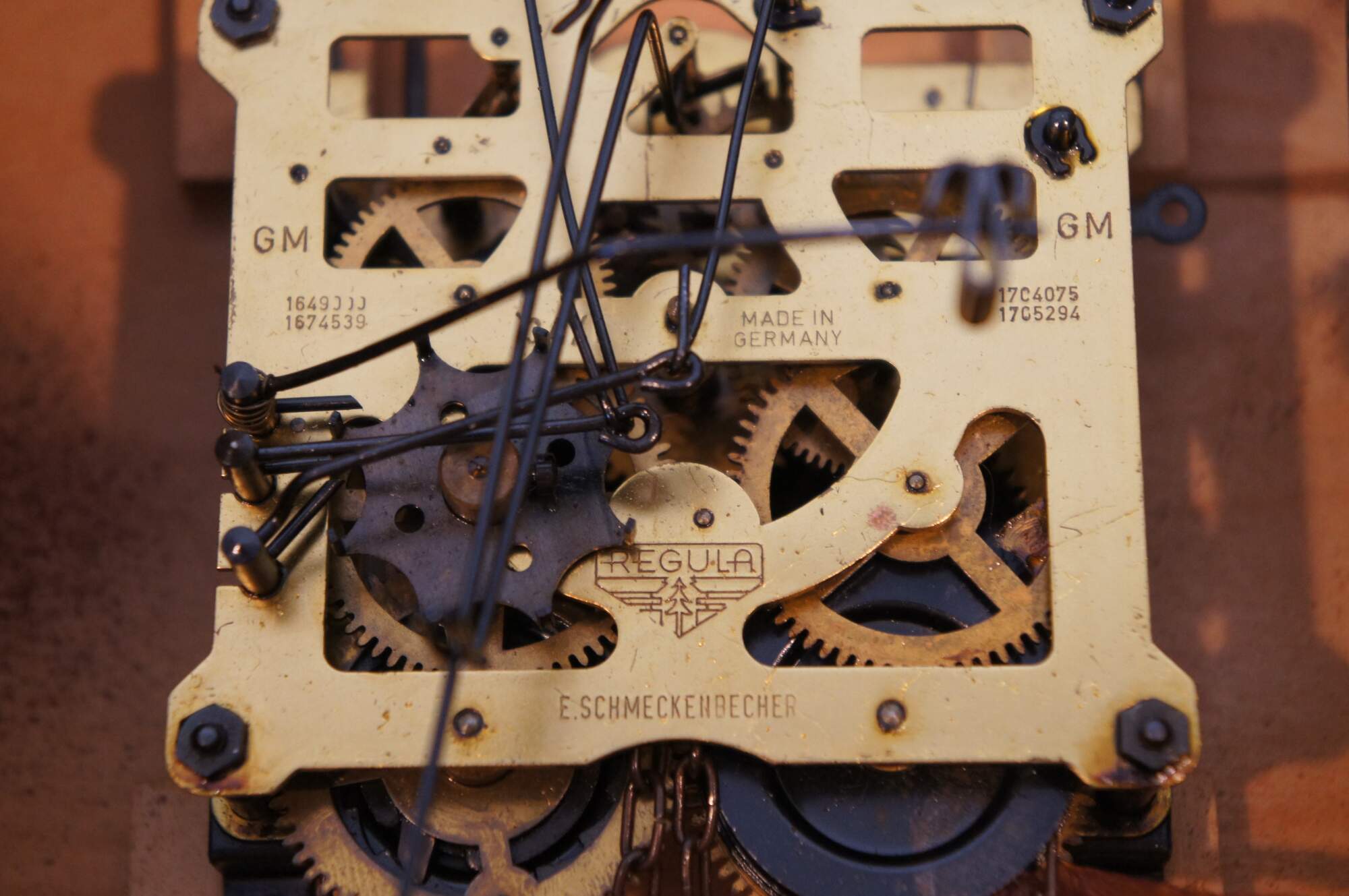 "Emil Schmeckenbecher company was founded in 1948 and went out of business in 1996. The company was located in Villingen, near the eastern edge of the Black Forest in the Baden-Württemberg area. They produced cuckoo clocks, wall clocks and some hall clocks." (Source: NAWCC Forum)