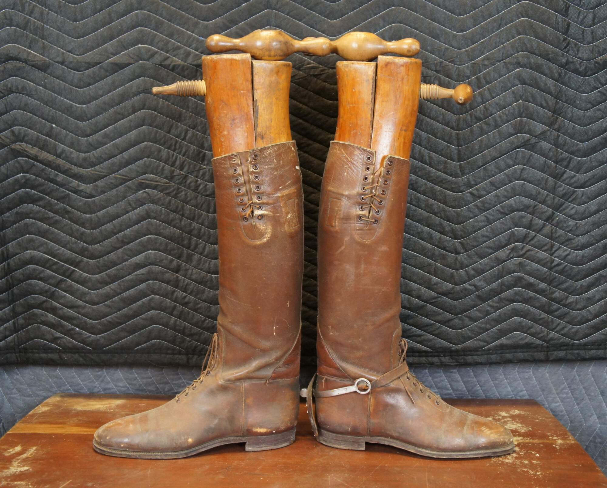 Circa early 20th century / World War I brown leather military riding / cavalry / millitary / sport boots. Pull on style with laces at the ankle and calf. On leather strap for spurs extant. Includes two part hardwood boot forms / stretchers.