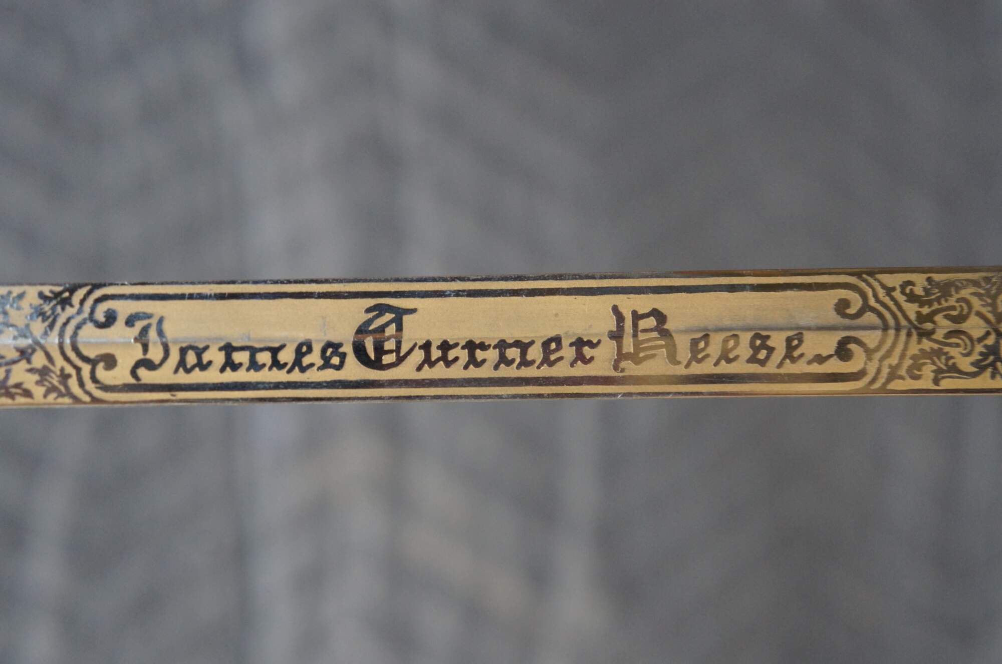 Late 19th-early 20th century (Circa 1882-1925) Masonic ceremonial sword and scabbard manufactured by The M.C. Lilley & Co. Silver tone metal with faux ivory handle, with painted details. Scabbard and handle are molded with knights and religious iconography. Both sides of the blade are etched also with knights, armies, religious imagery and the name James Turner Reese, thrown into relief with lightly brushed gilding. Includes brown leather case.