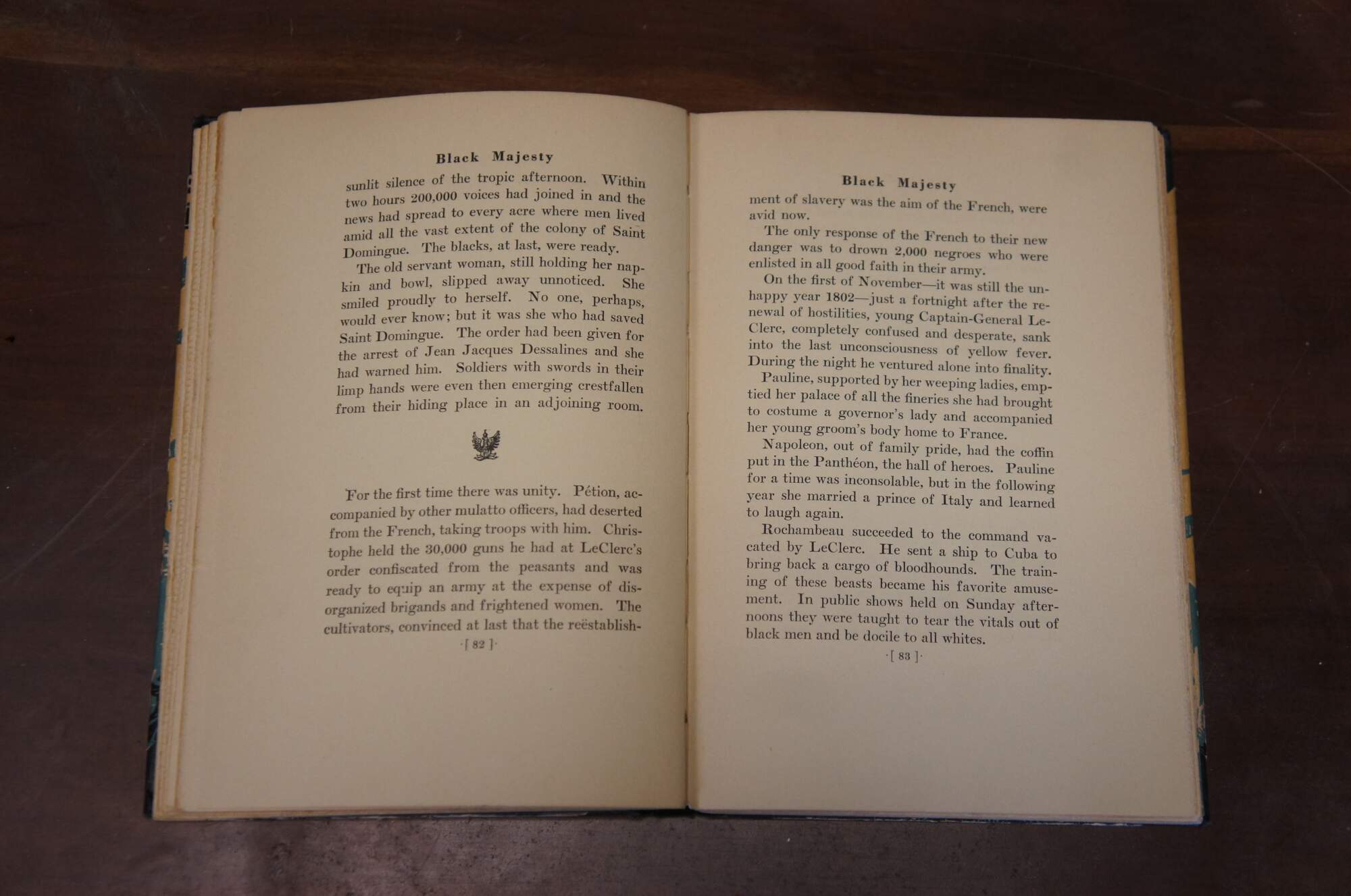 Black Majesty" by John W. Vandercook - Illustrated with Drawings by Mahlon Blaine - Published by the Literary Guild of America 1928 - Copyright 1928 by Harper & Brothers - Printed in the USA, First Edition A-C. Printed paper hard back / hard cover with cloth binding on the spine; no jacket.
