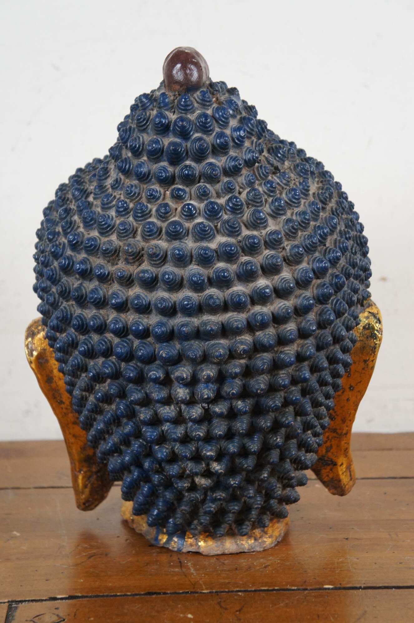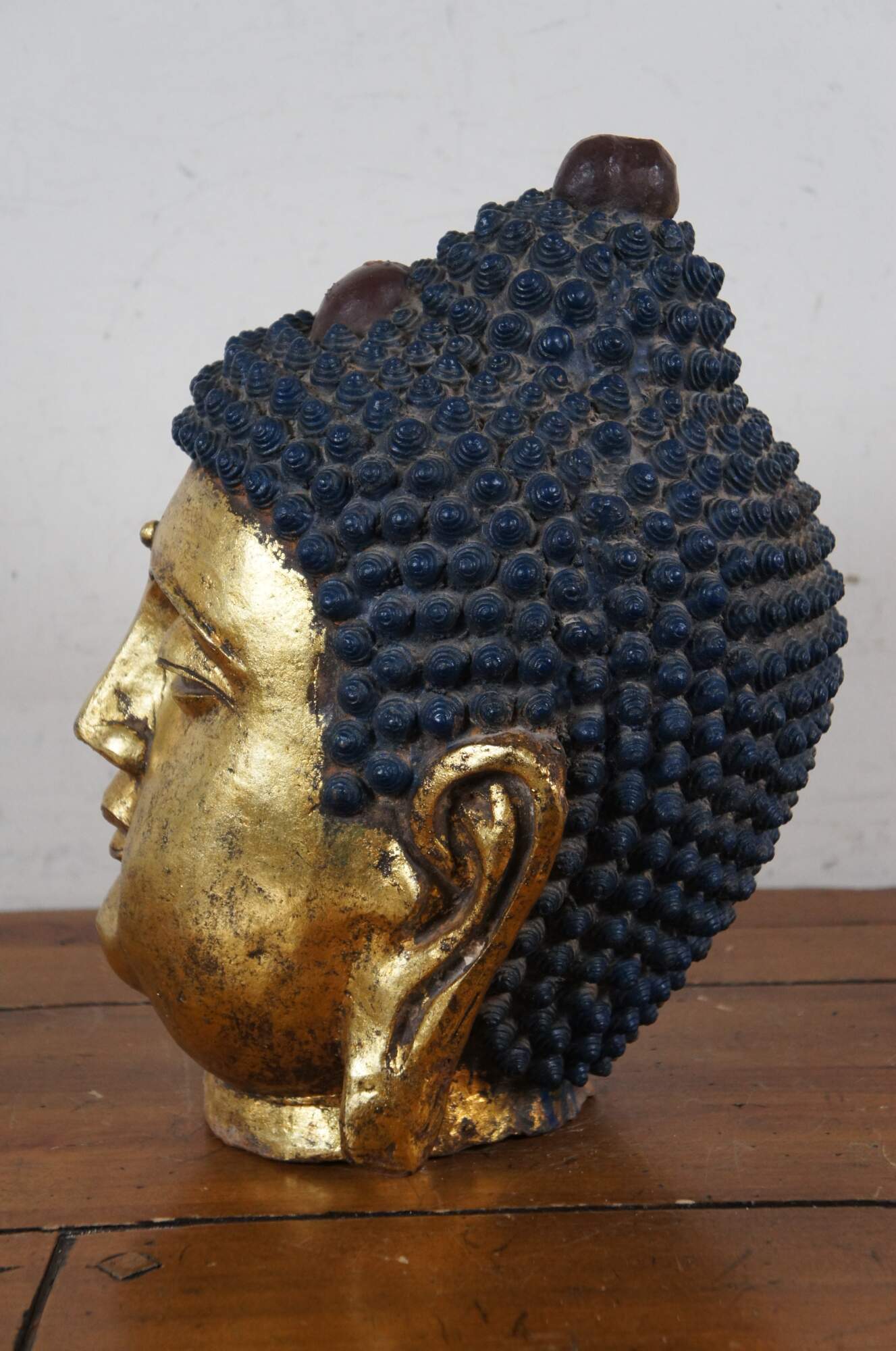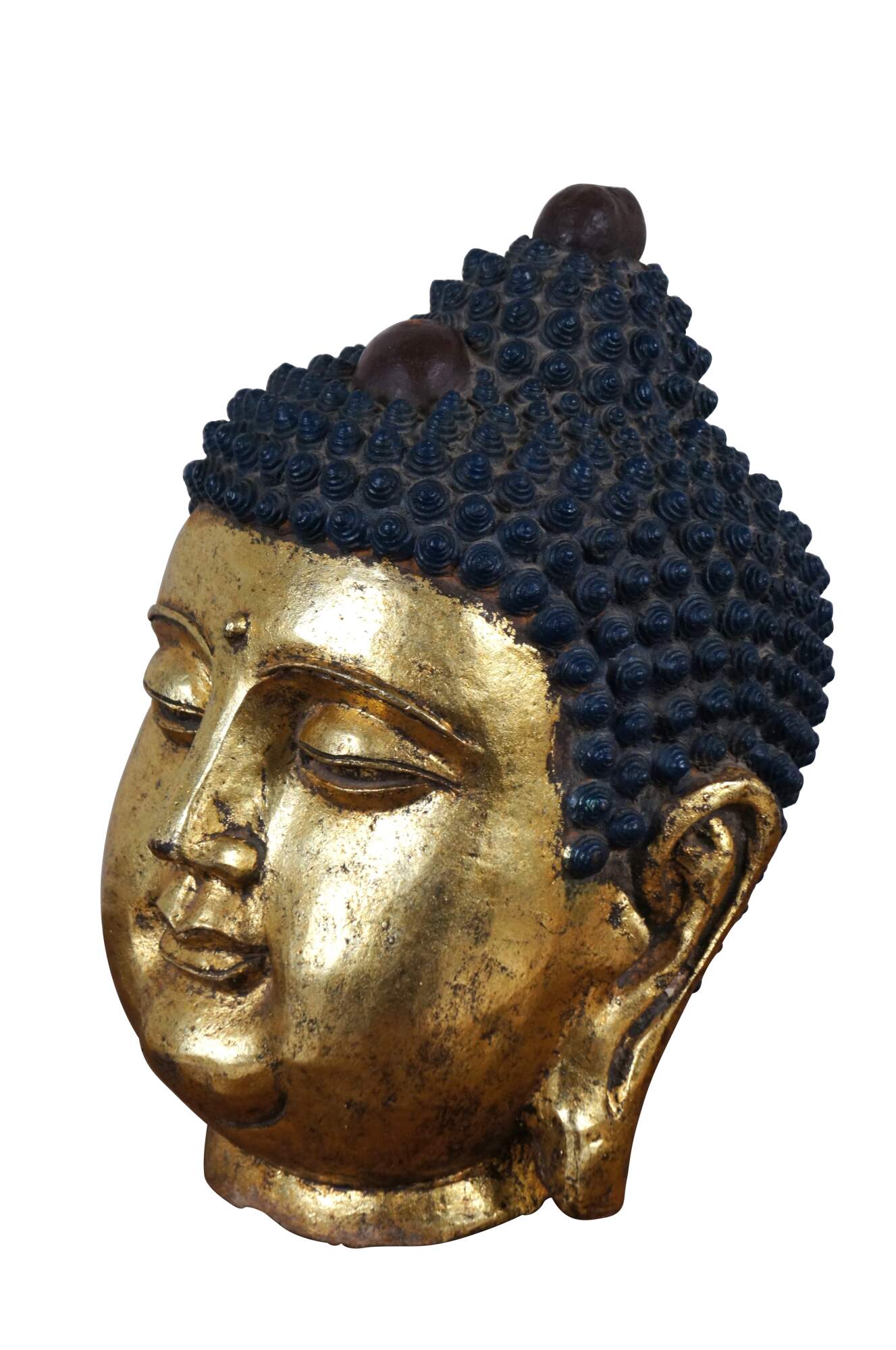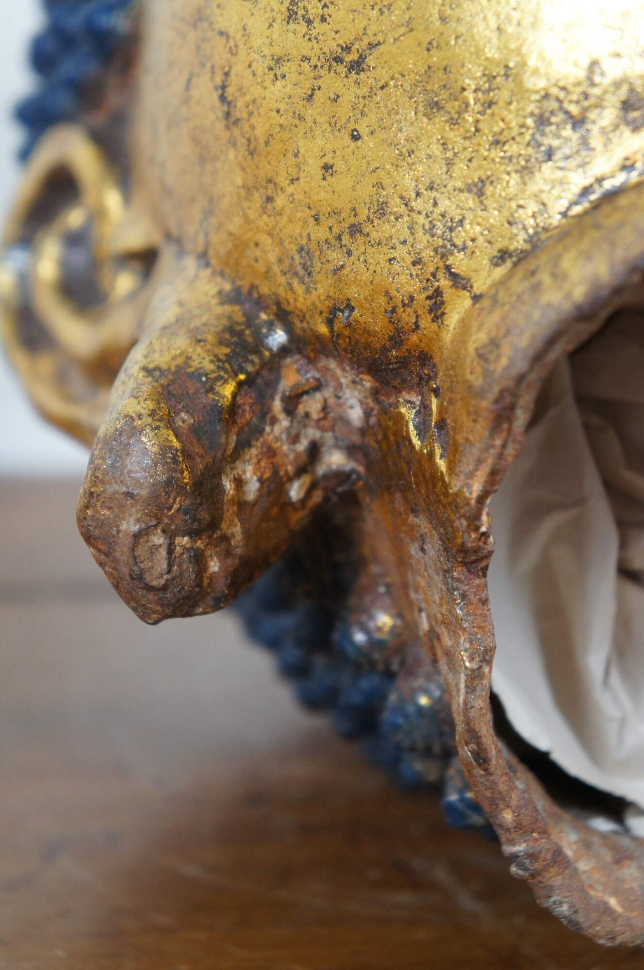 Antique cast iron mediatating Buddha head. Made of iron with round face, elongated earlobes, and bindi at center of forehead, bright gilt painted skin, and deep blue ringlets of curly hair with two burgundy orb decorative pieces.