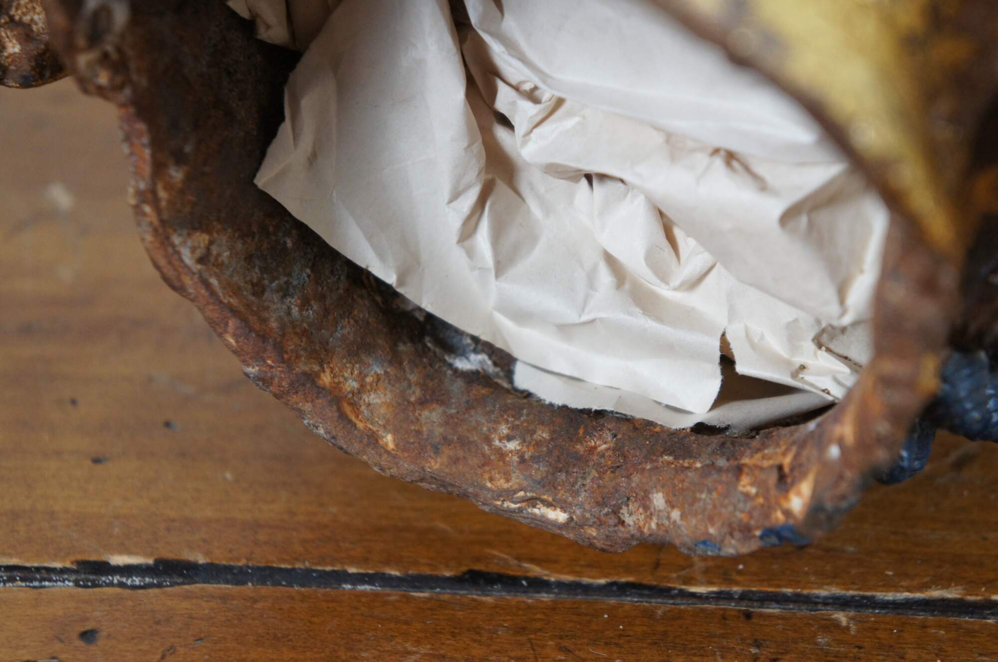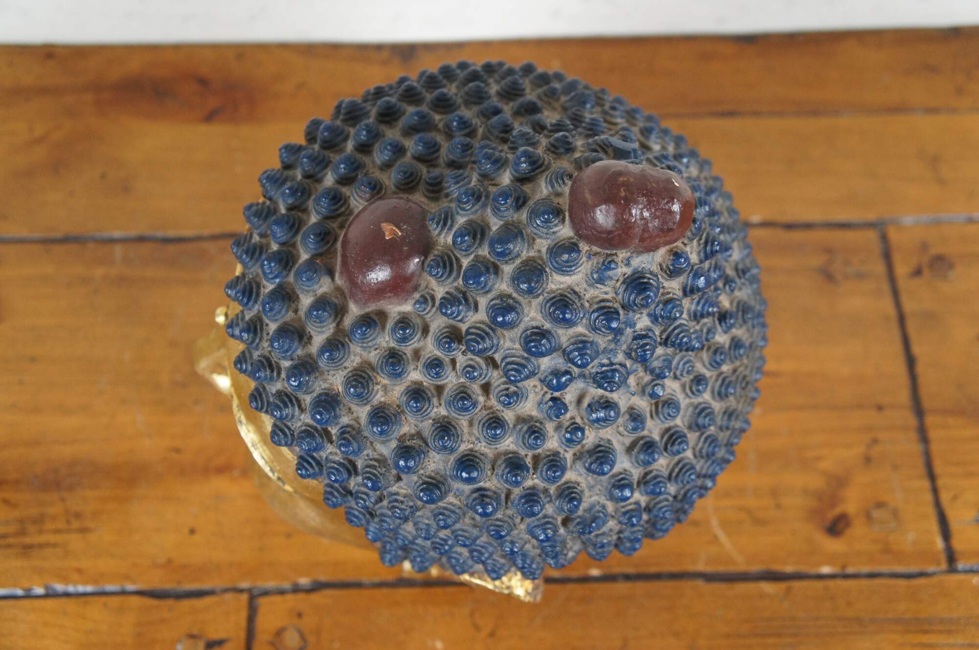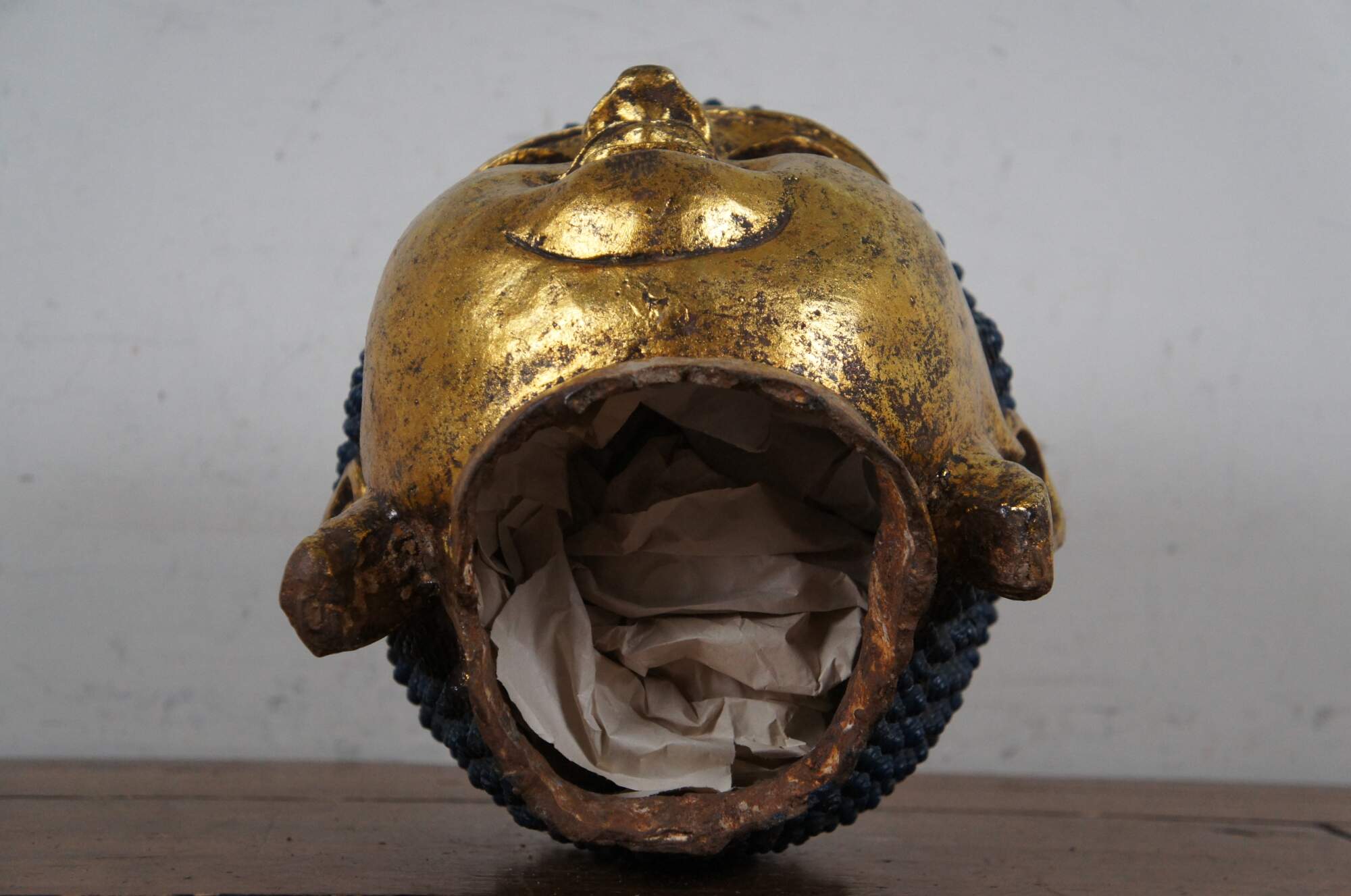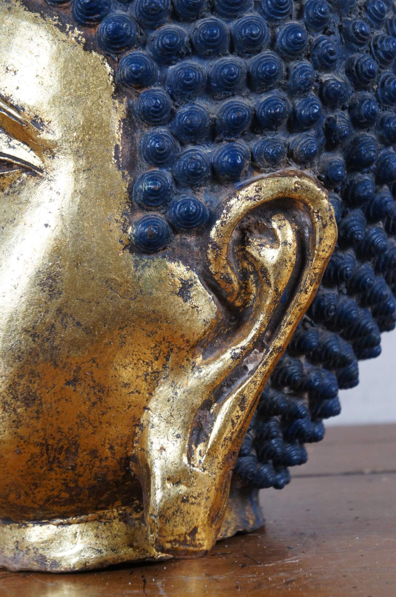 Antique cast iron mediatating Buddha head. Made of iron with round face, elongated earlobes, and bindi at center of forehead, bright gilt painted skin, and deep blue ringlets of curly hair with two burgundy orb decorative pieces.