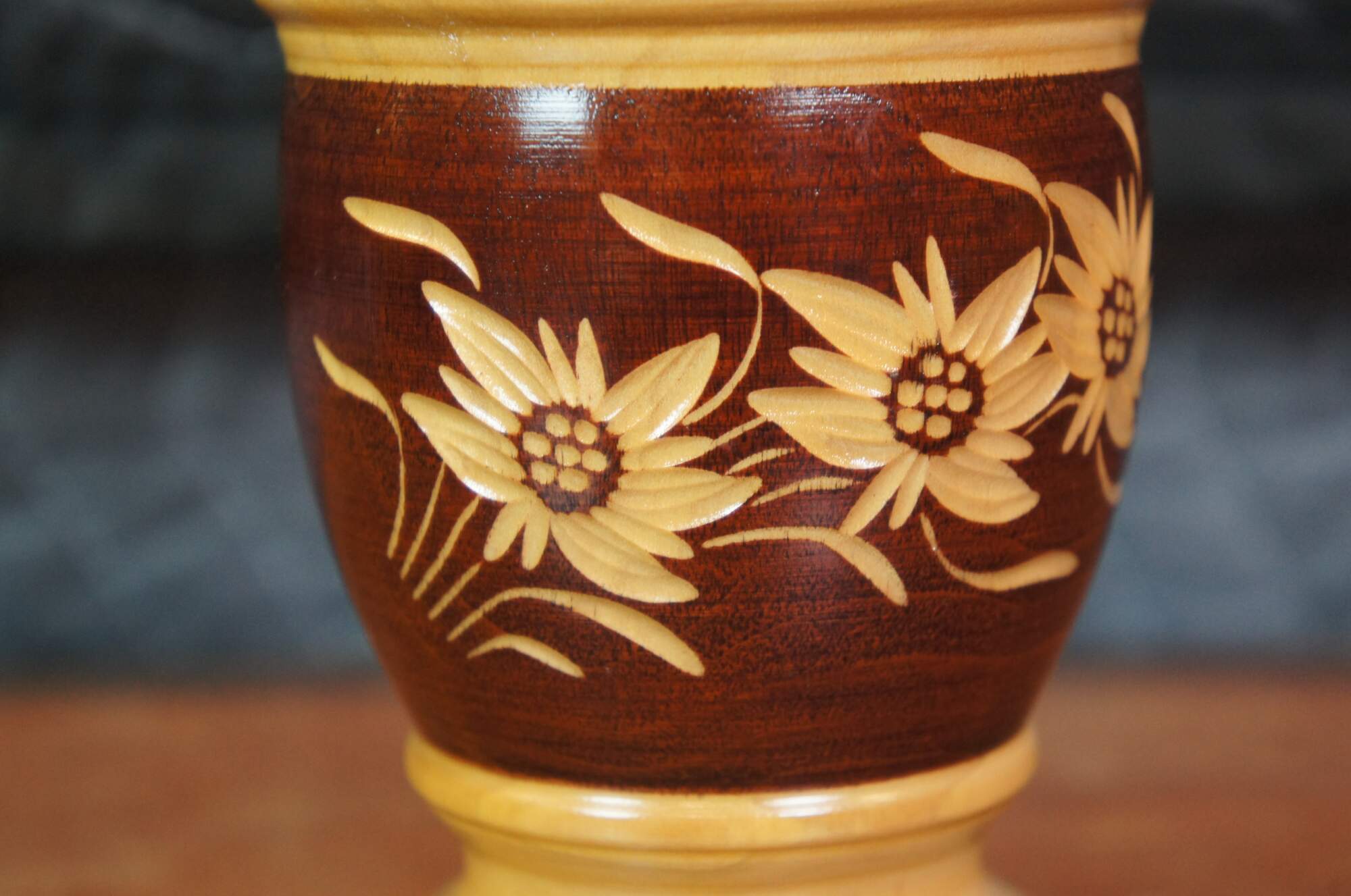 Mid to late 20th century two tone turned wood vase, decorated with trios of eidelweiss blossoms. Made in Switzerland.