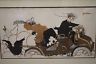 It features a man with a cigar and pinky ring driving a very early style automobile. He is driving wildly and there is a lady in the back and birds running to get out of the way..