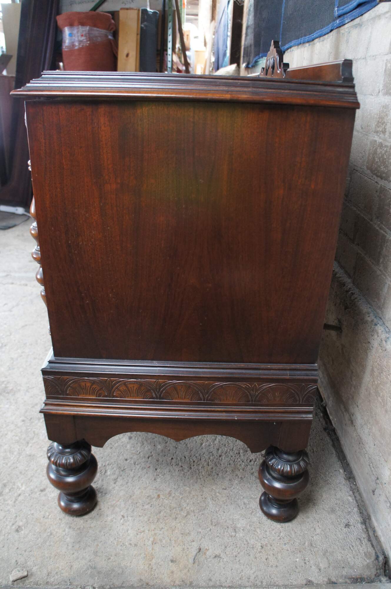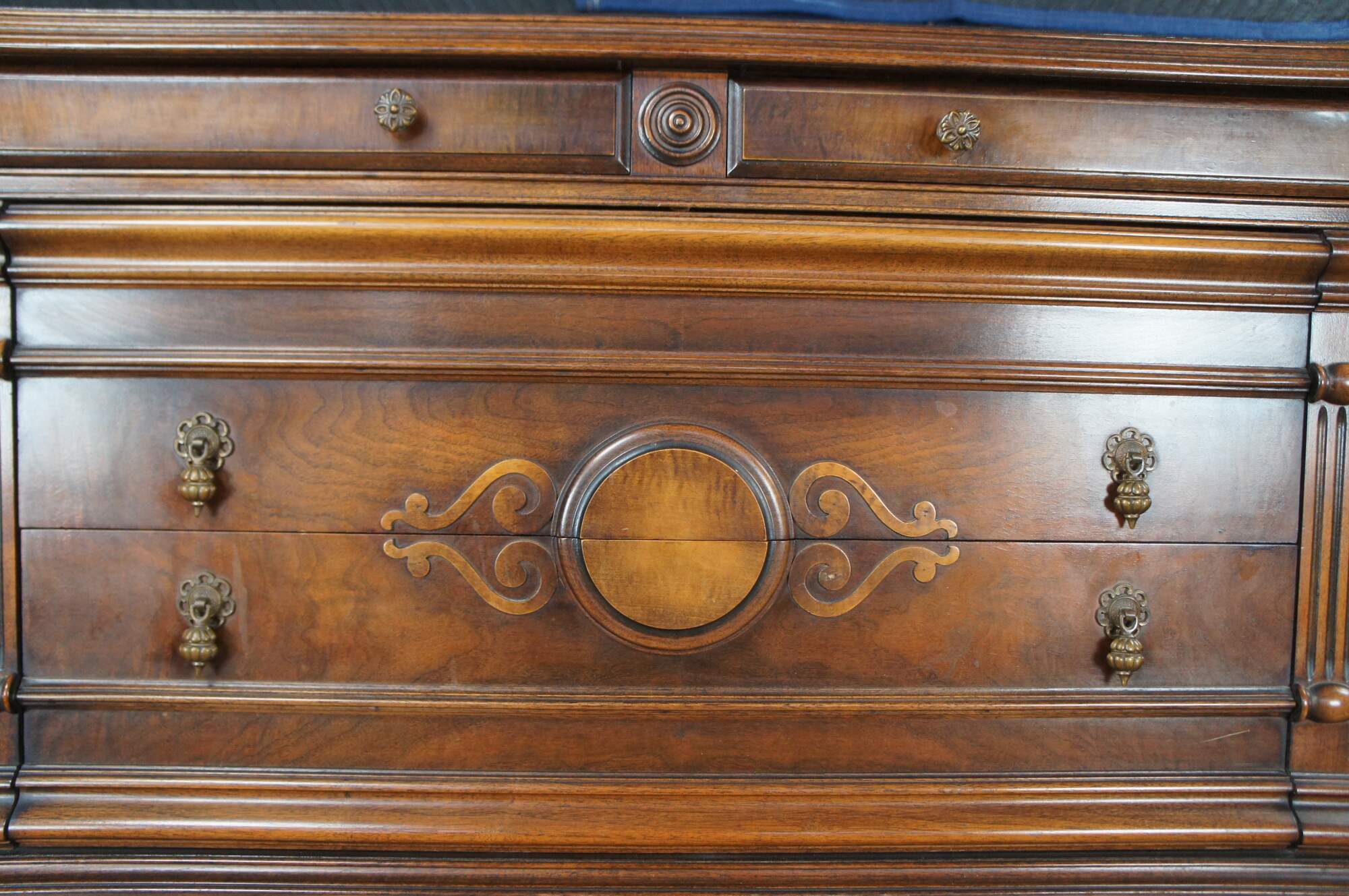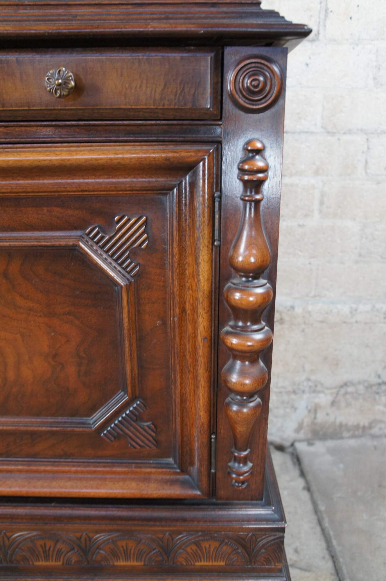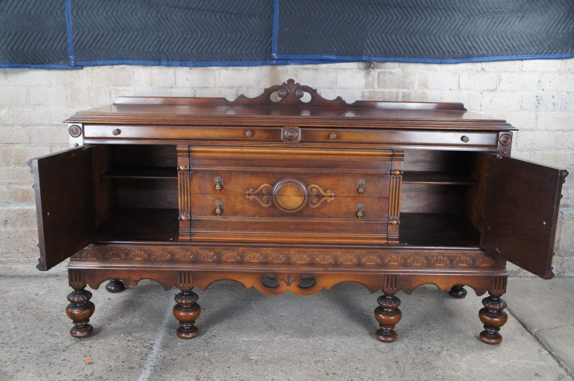 A large and impressive Jacobean / Spanish Revival buffet by Rockford Furniture Company out of Rockford, Illinois, circa 1920. Part of the "A" Line by Rockford their highest grade of manufacturing. Features a rectangular frame made from walnut with two large streamlined silverware drawers, one cloth lined with compartments. Beneath the two drawers are to larger centralized drawers flanked by outer cabinets with interior shelves. The sideboard is carved with quarter cut spindles, medallions, a scalloped fan motif and other ornate design elements. Features an ornate pierced backsplash and lower apron. The case is supported by robust baluster shaped bun feet.
