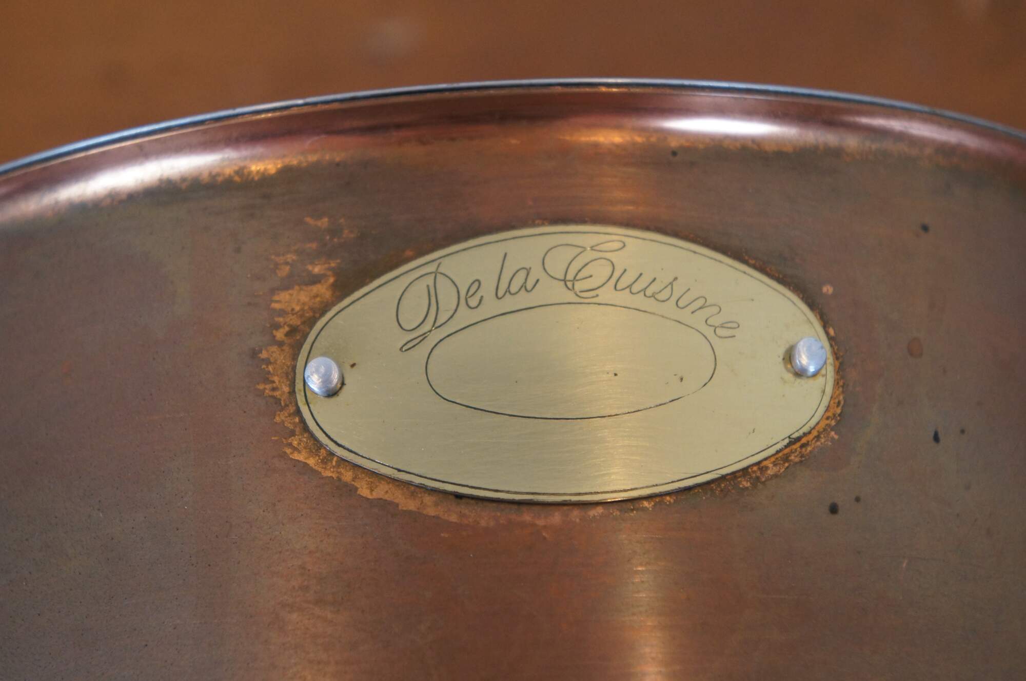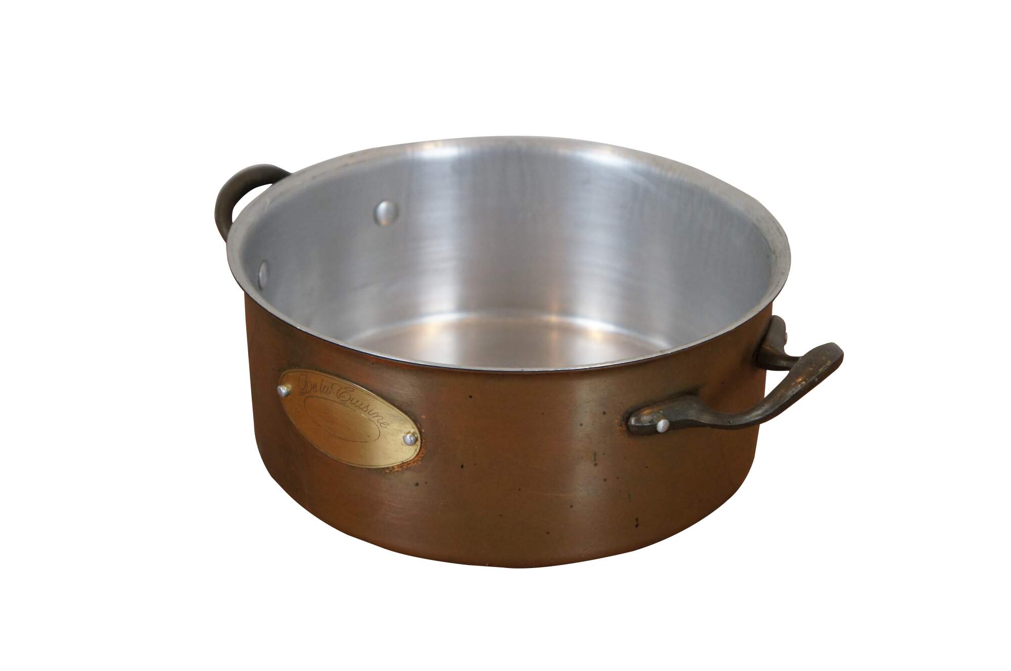 Vintage 20th century copper stock pot / sauce pan by De La Cuisine with two side handles and tinned interior.
