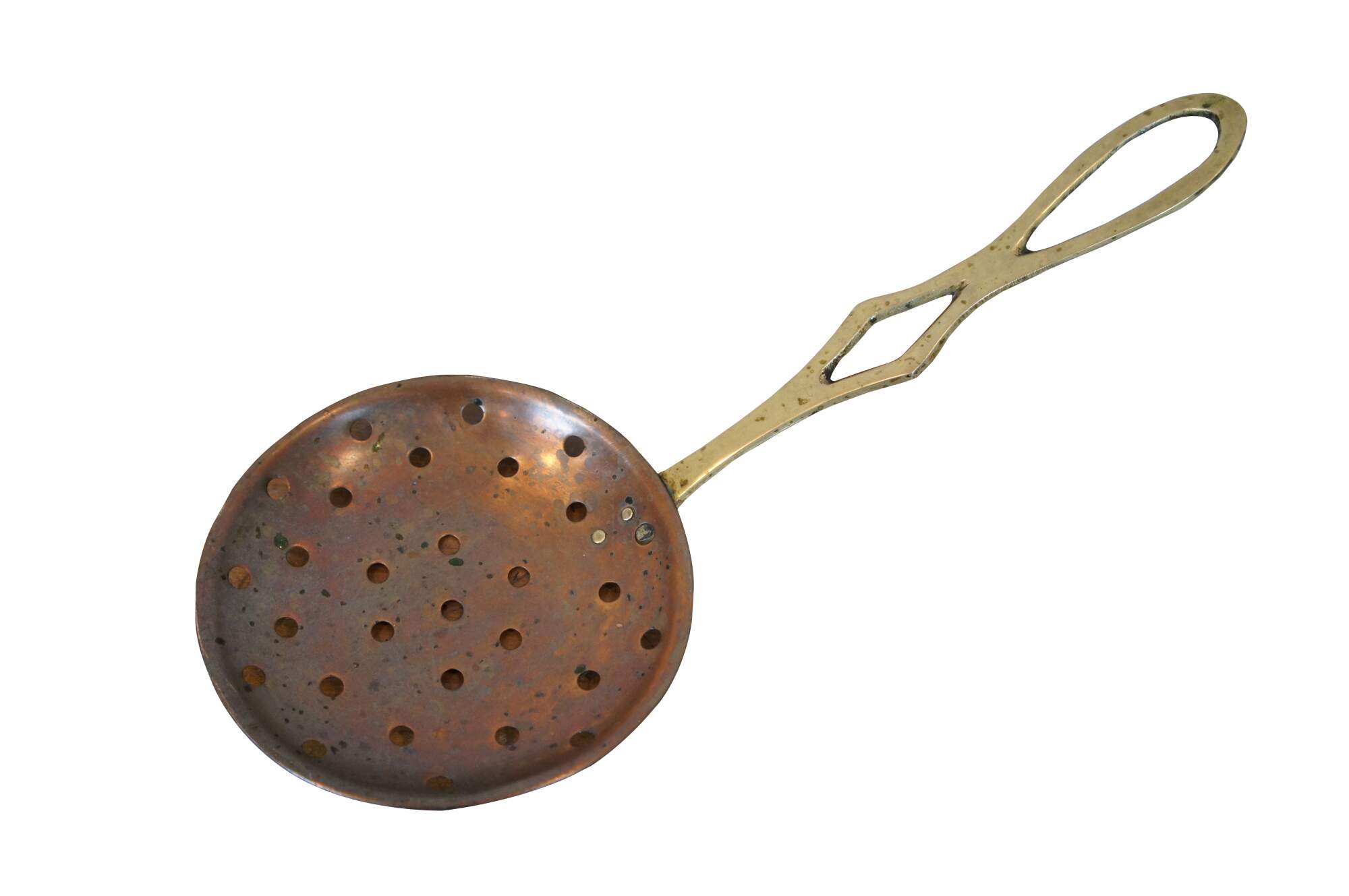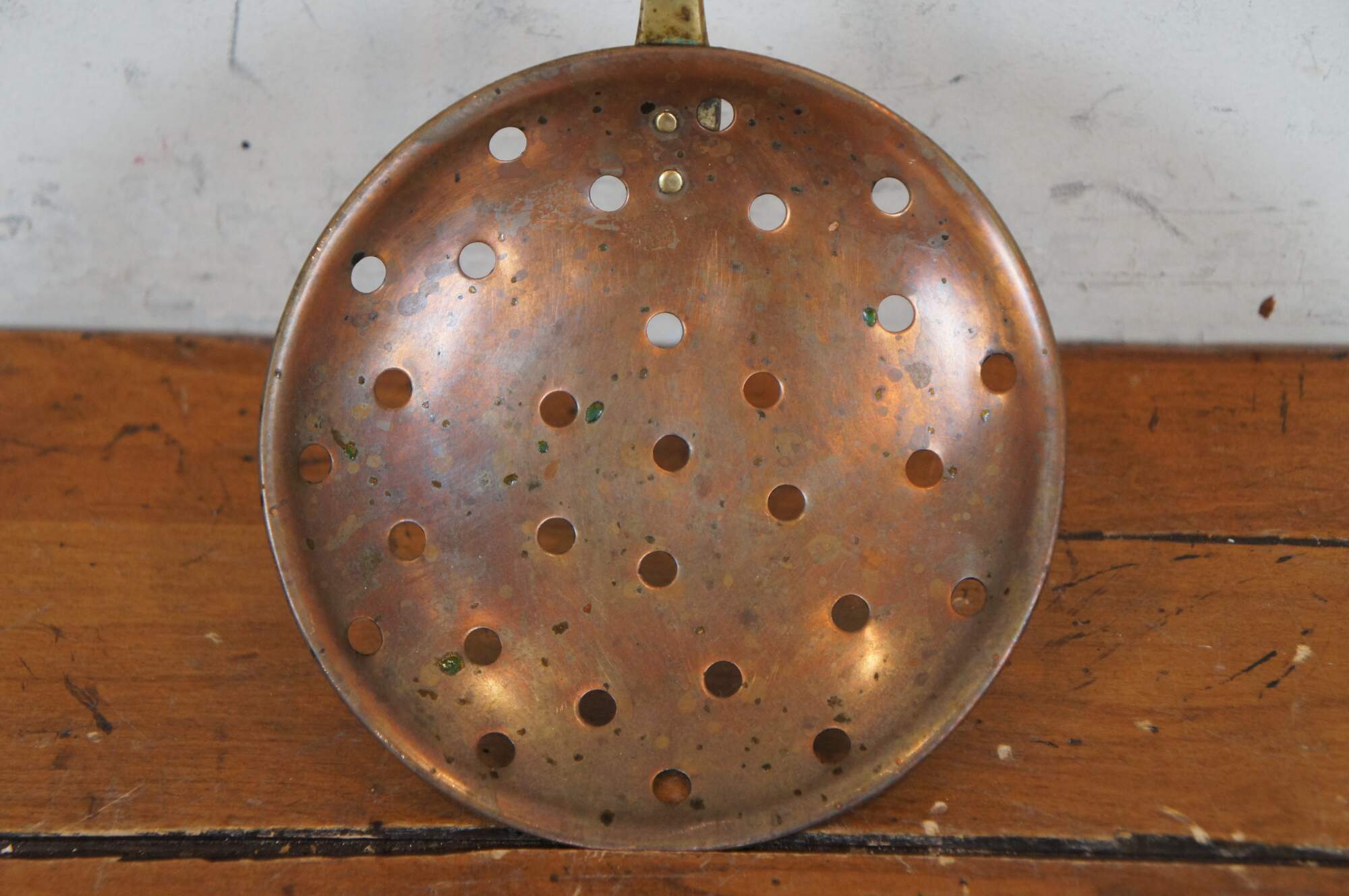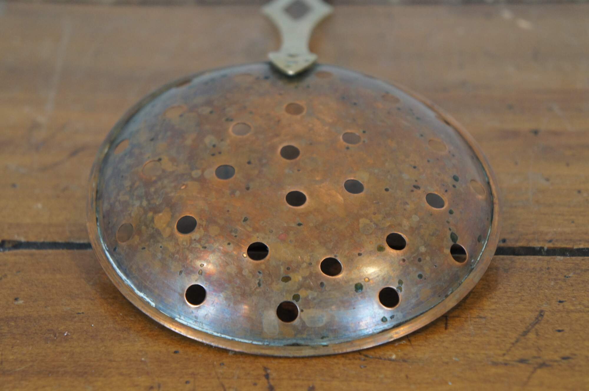 Vintage 20th century copper sieve / strainer / skimmer / ladle with pierced brass handle.