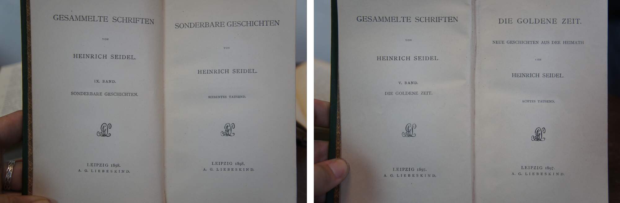 "Gesammelte Schriften IX Band Sonderbare Geschichten" (Collected Writings Volume IX Strange Stories) and "Gesammelte Schriften V Band Die Goldene Zeit Neue Geschichten aus der Heimath" (Collected Writings Volume V The Golden Age New Stories from Home) by Heinrich Seidel - Published 1898 A.G. Liebskind
