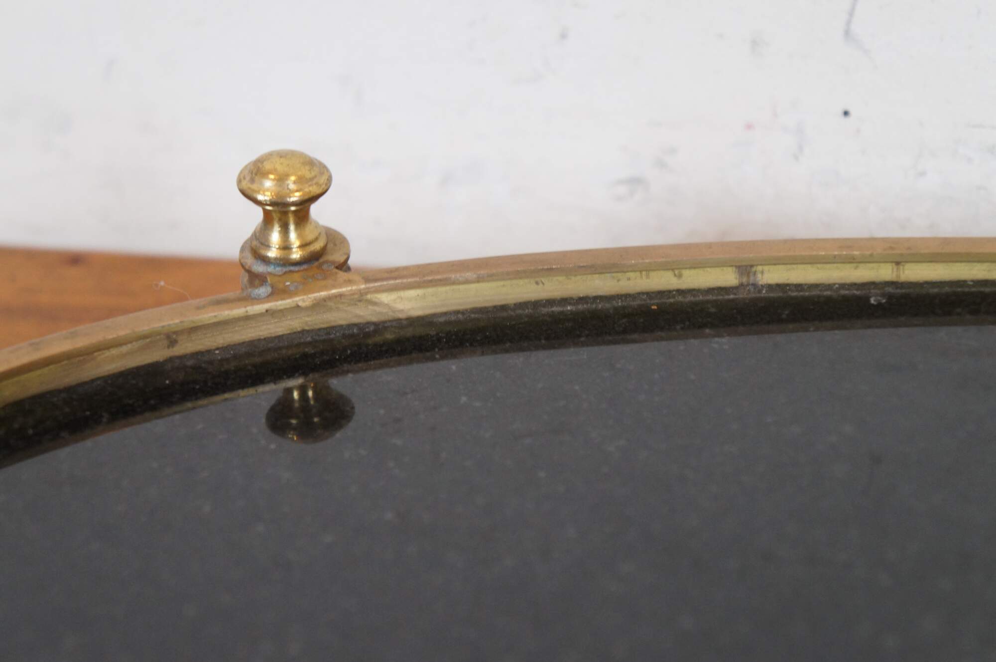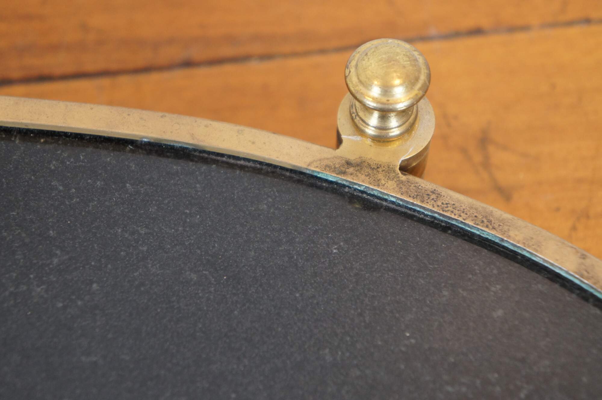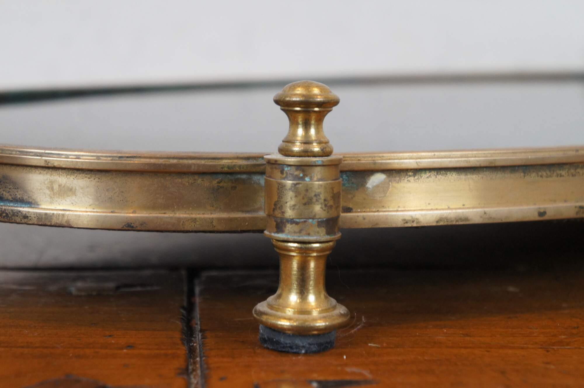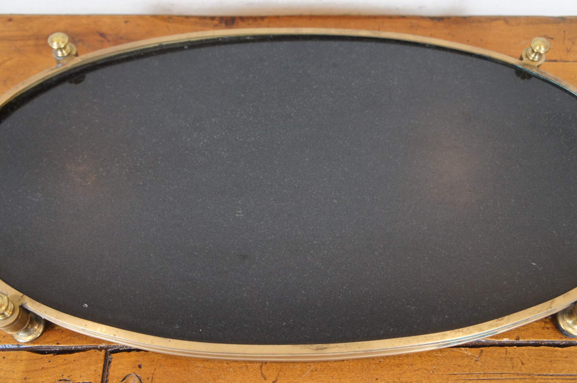 Vintage oval vanity tray / plateau featuring a brass frame and four turned feet supporting a black marble surface.