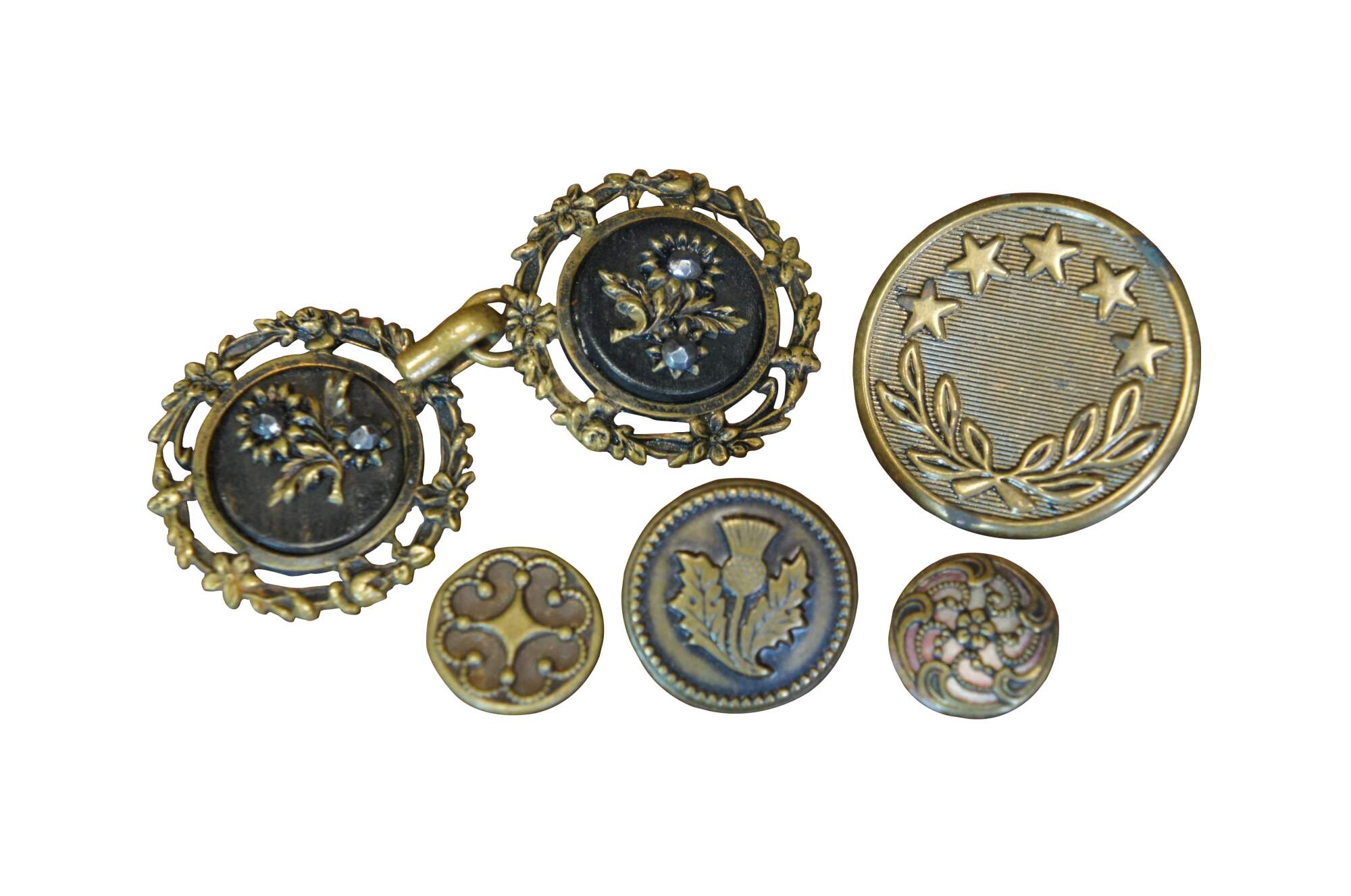 15 piece early to mid 20th century brass shank style buttons and one clasp, decorated with a variety of motifs including coin heads, flowers, pinwheels and thistles.