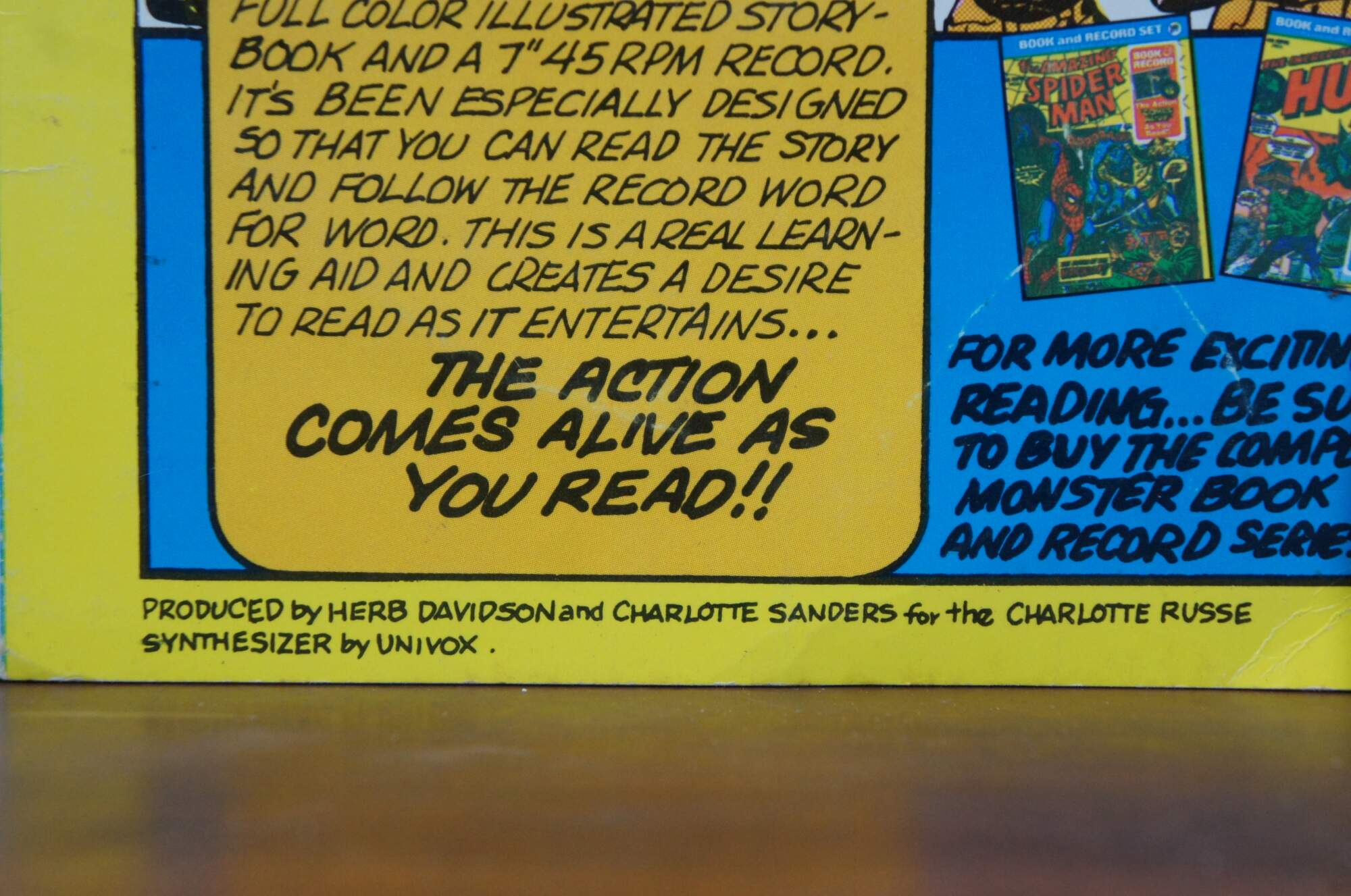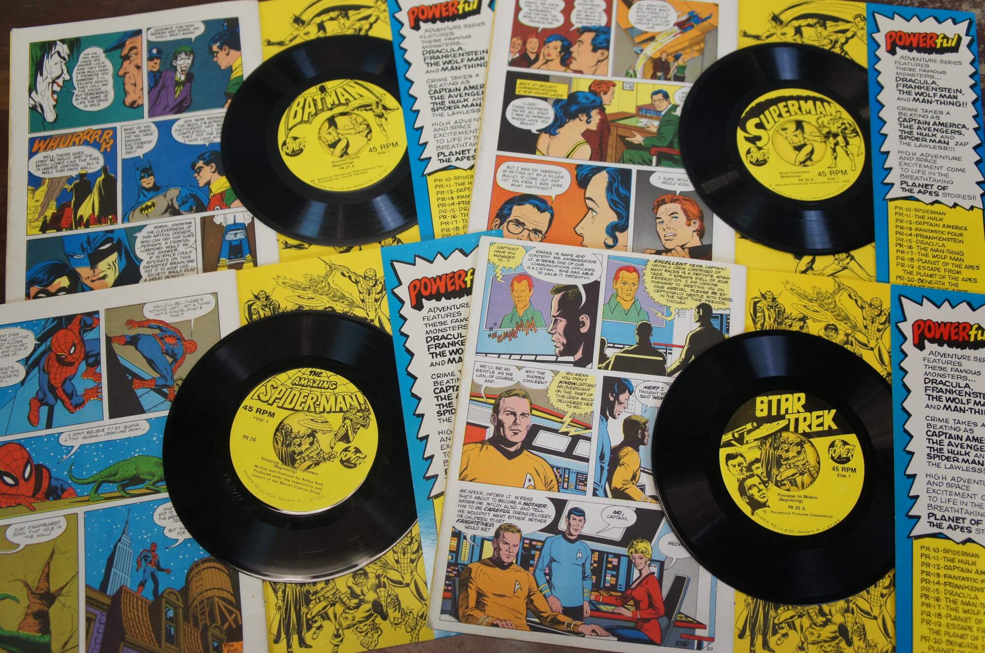 Set of four 1975 comic book and record sets - PR-27 Batman: Stacked Cards / PR-28 Superman: Alien Creatures / PR-24 The Amazing Spiderman / and PR-25 Star Trek: Passage to Moauv. Each set includes one 20 page comic book and 7" 45 RPM record. Produced by Herb Davidson and Charlotte Saunders for the Charlotte Russe Synthesizer by Univox. Paramount Pictures Corporation - Power Records.
